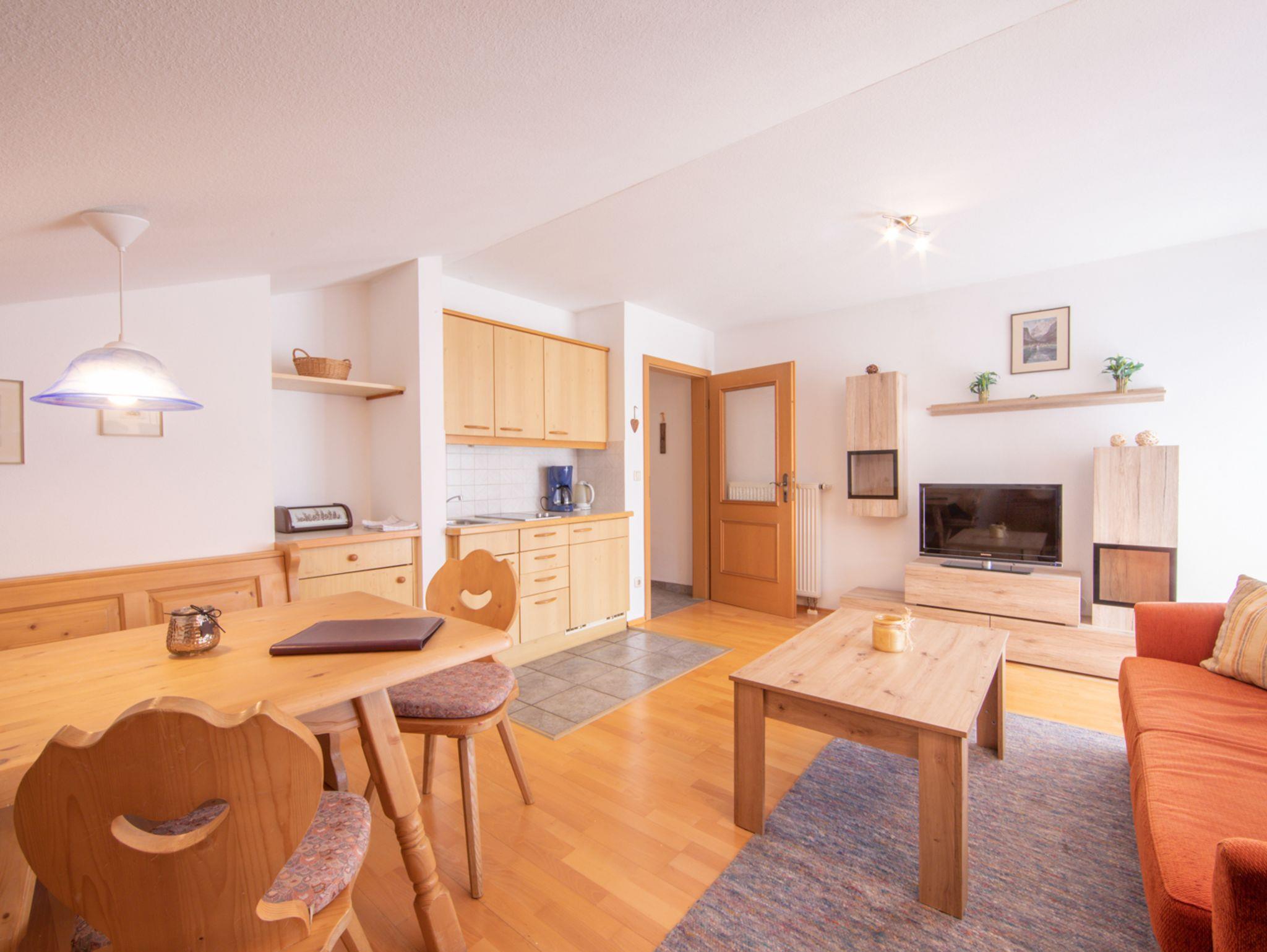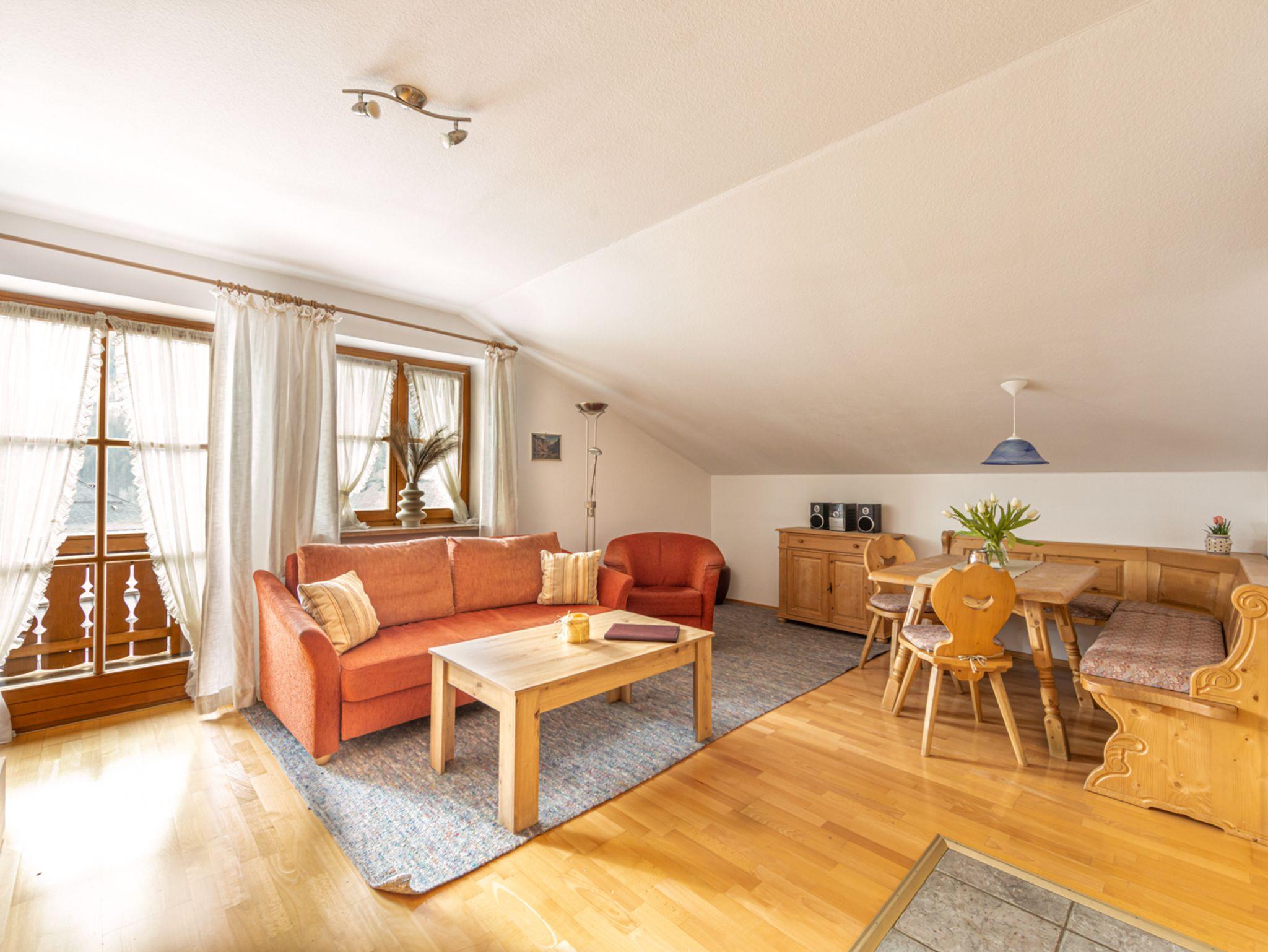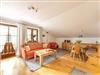 Die komfortable und gemütlich eingerichtete Ferienwohnung (ca. 48 qm) liegt im Dachgeschoß. Das Wohnzimmer ist mit Sat-TV, Radio und einem Balkon ausgestattet. Außerdem verfügt es eine Essecke und eine Küchenzeile mit einem 2-Plattenherd, einem Kühlschrank / Eisfach, einer Kaffeemaschine, einem Toaster und einem Wasserkocher.