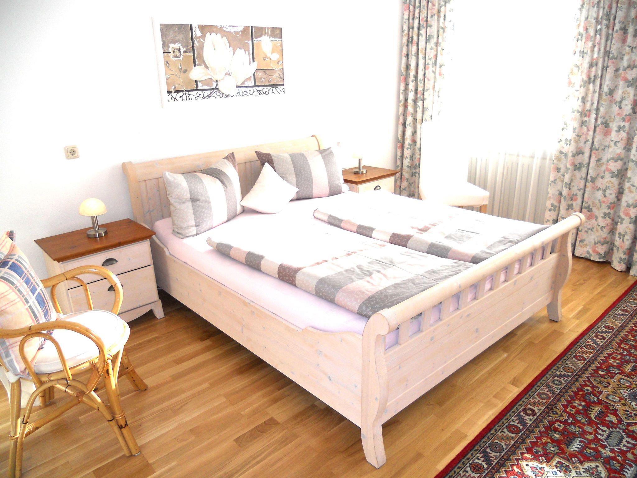 Komfortable 60 qm große Ferienwohnung für 1-2 Personen, 2015 neu renoviert. Die Wohnung befindet sich im 1. Obergeschoss und hat ein Wohnzimmer mit Schlafcouch, eine komplett ausgestattete Küche mit Esstisch, und ein Schlafzimmer. Ausserdem gibt es ein Bad mit Dusche und Waschbecken, sowie ein extra WC. Ebenso erwartet Sie ein extra großer überdachter Süd-West Balkon (14,5m Länge; 1,5m Breite) mit freien Blick auf Wald, Wiesen und Berge.