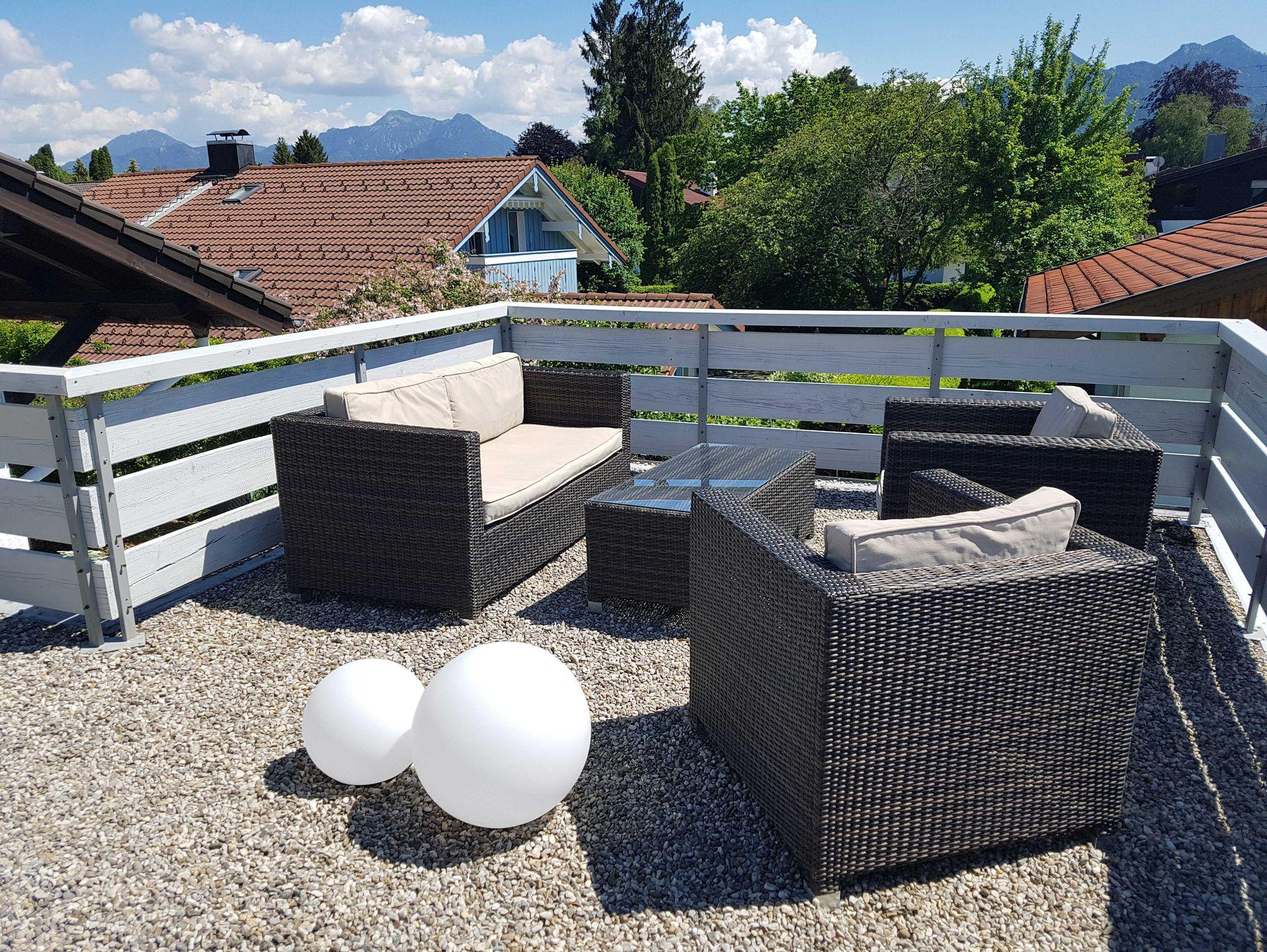 In der gesamten Wohnung gibt es einen W-LAN Zugang. Die Ferienwohnung verfügt über einen kleinen Frühstück-Balkon zur Ostseite und einer großen Sonnenterrasse mit Bergblick auf die Kampenwand auf der Süd-West Seite des Hauses. Bettwäsche und Hand- sowie Geschirrtücher stehen zur Verfügung.