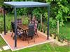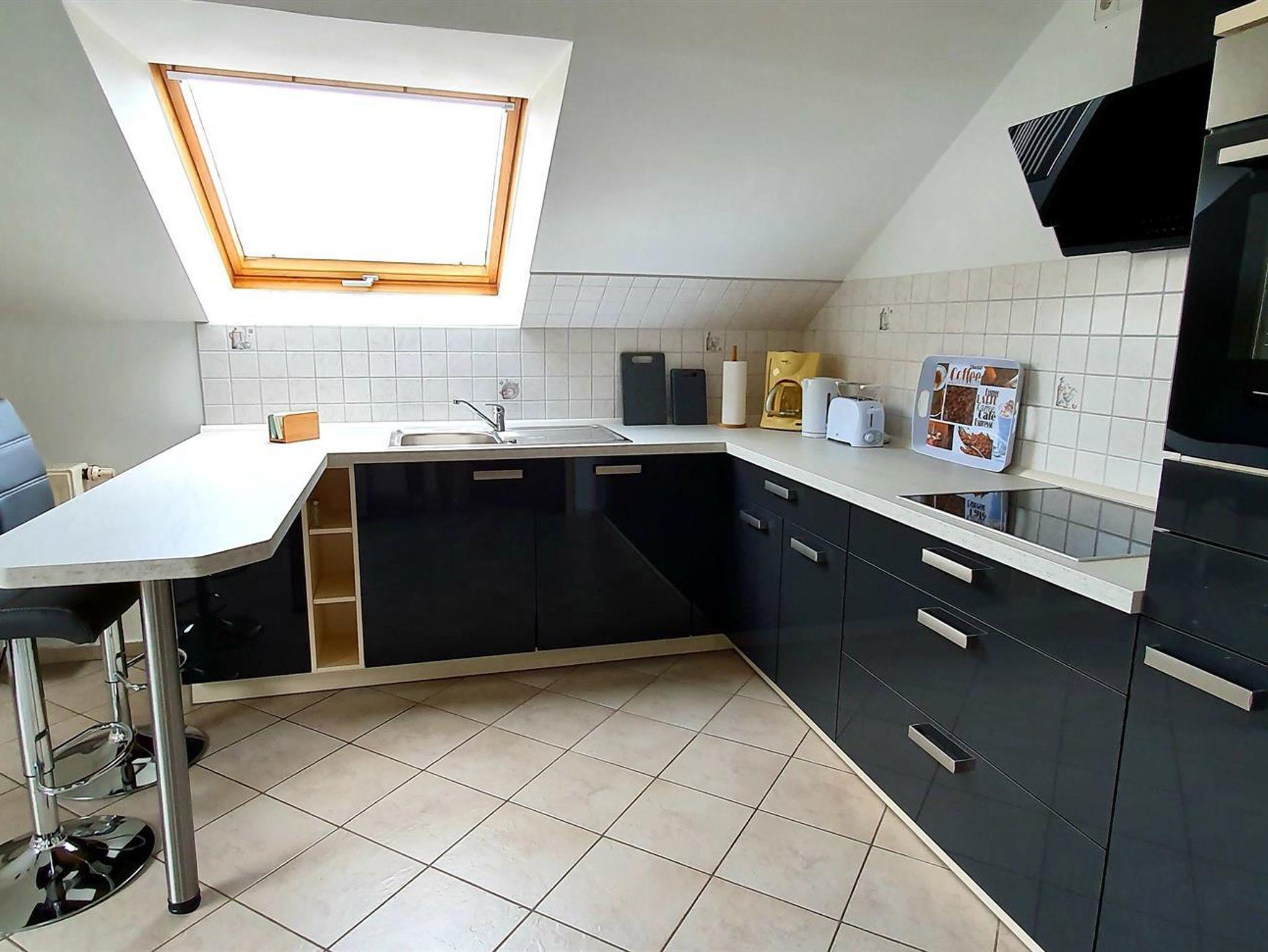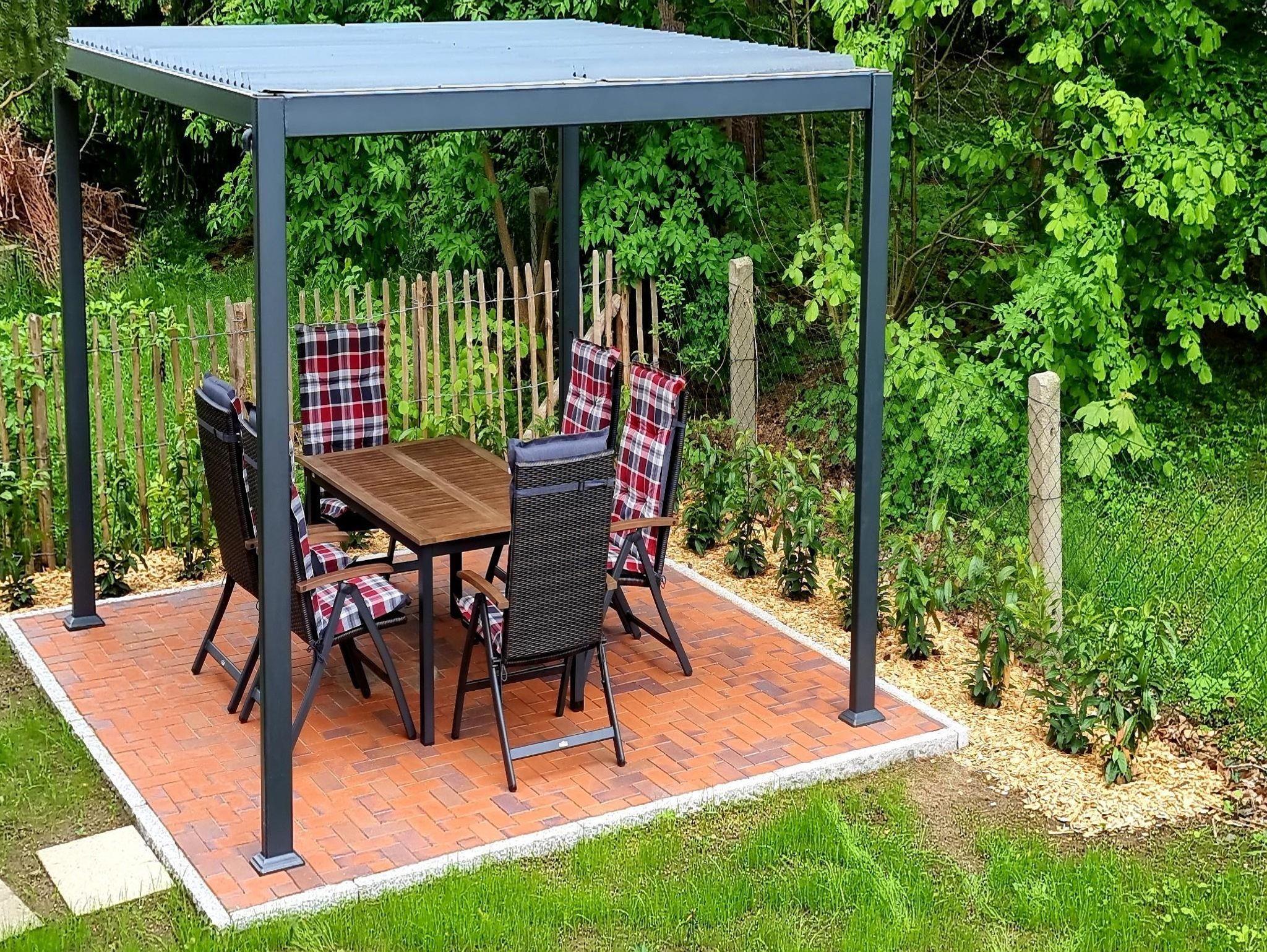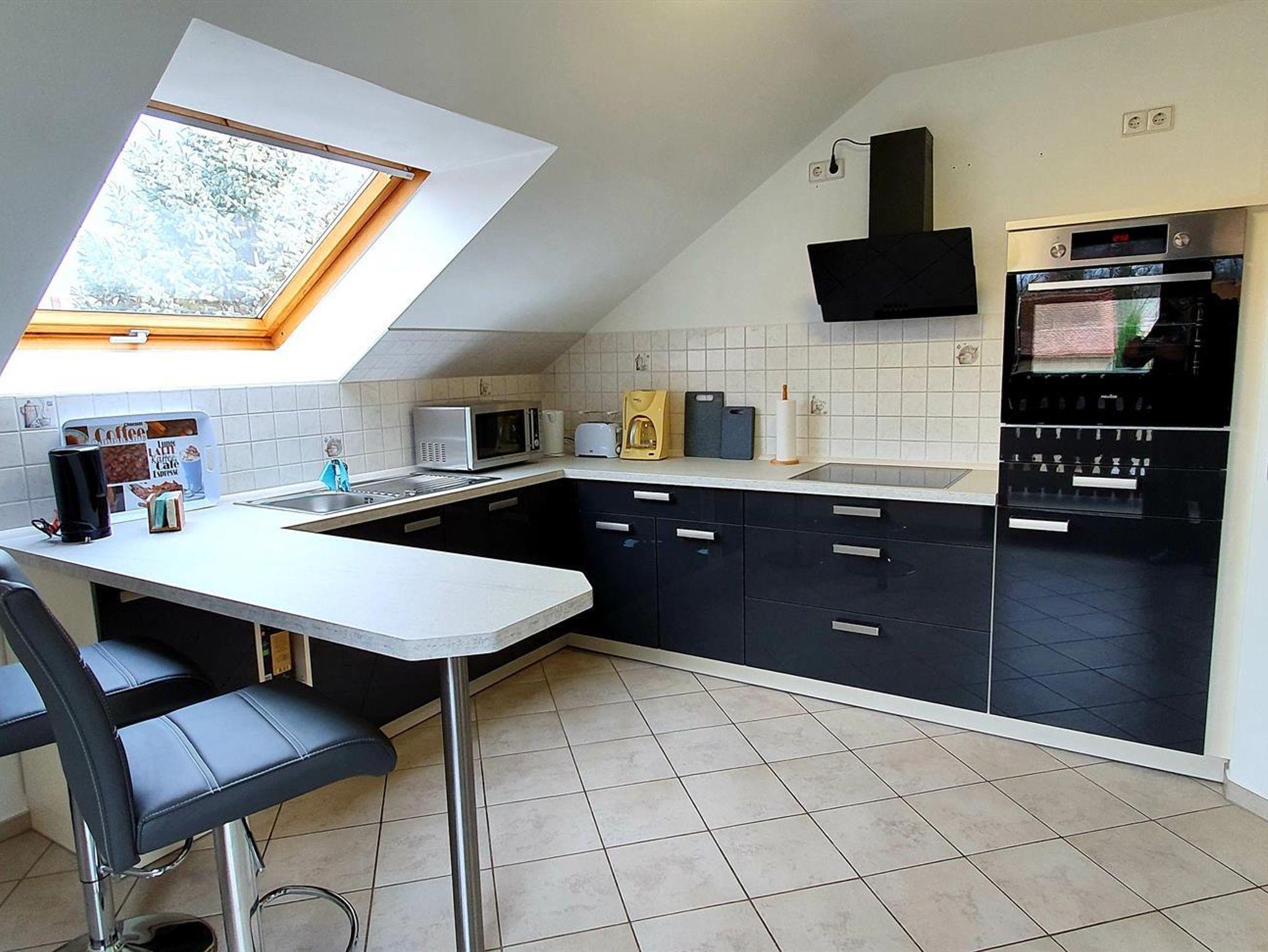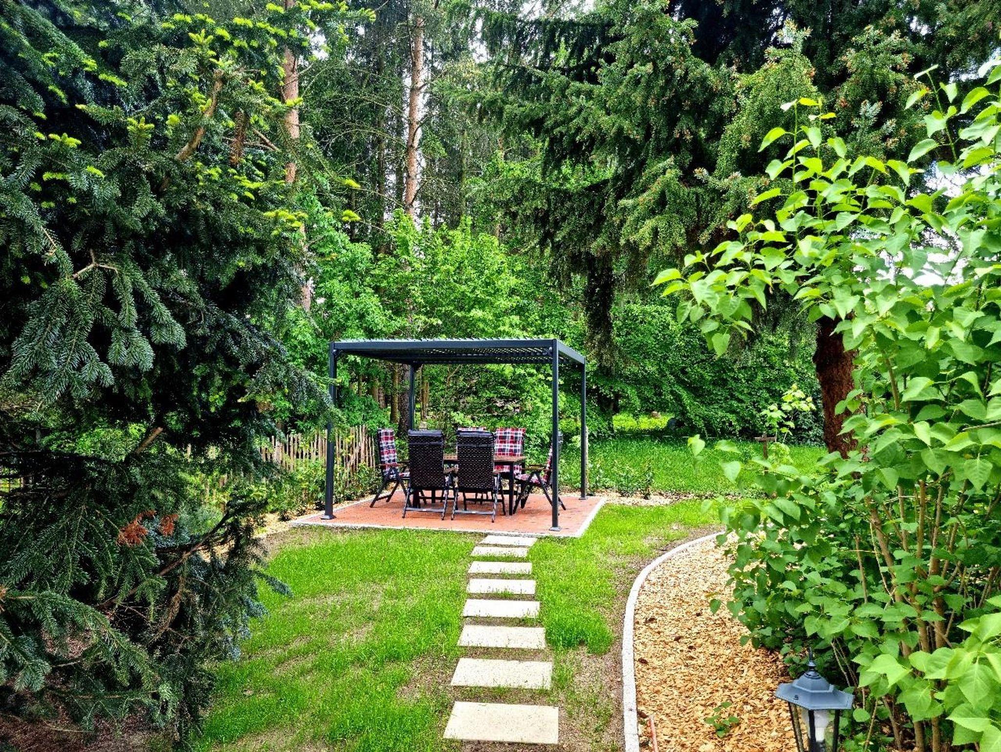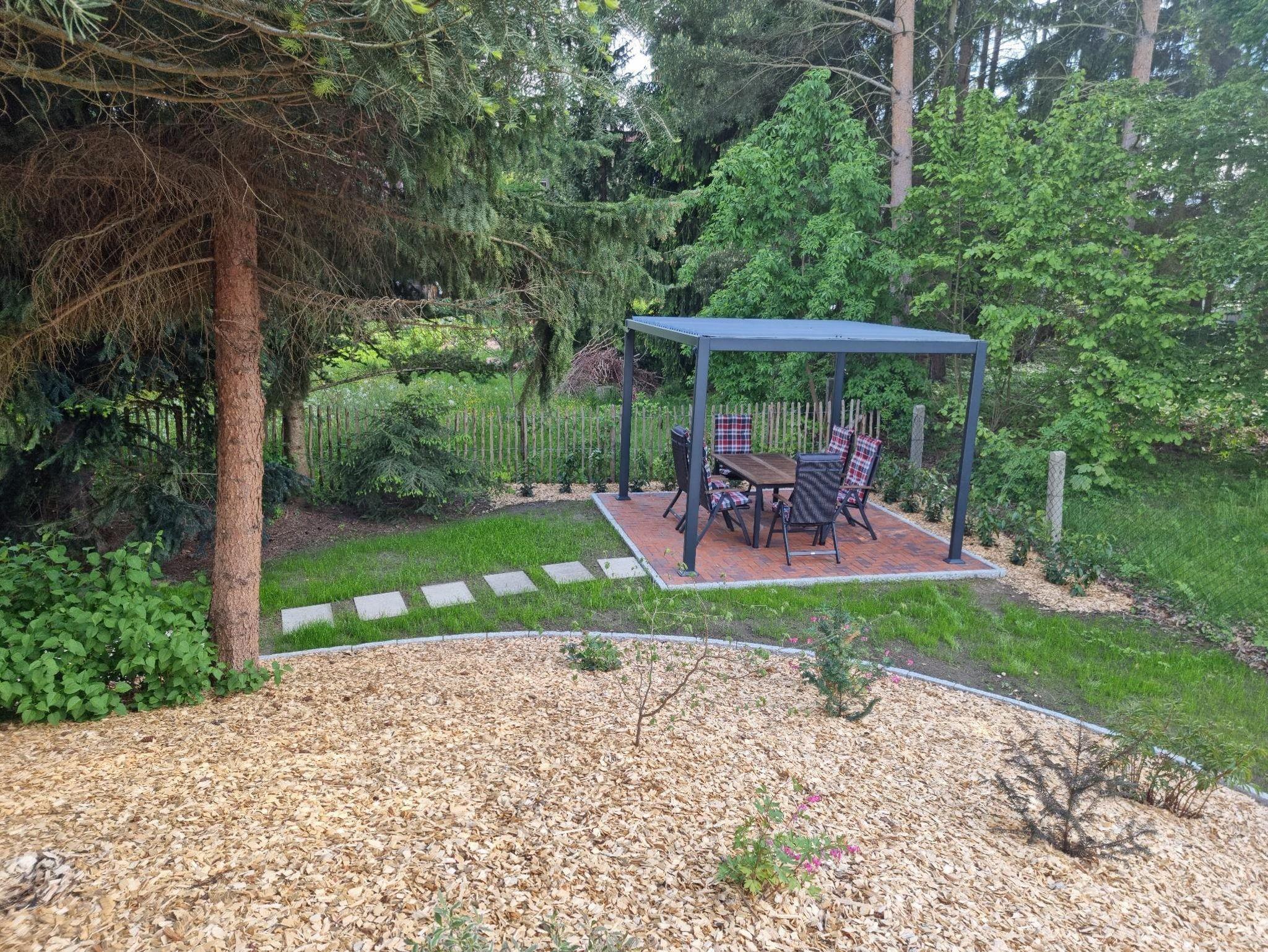 Die Wohnung im Obergeschoss verfügt über zwei Schlafzimmer, Küche, Bad und Balkon. Außerdem können Sie den Pavillon mit Sitzecke im Garten und den Wellnessbereich mit Sauna und Infrarotkabine nutzen.