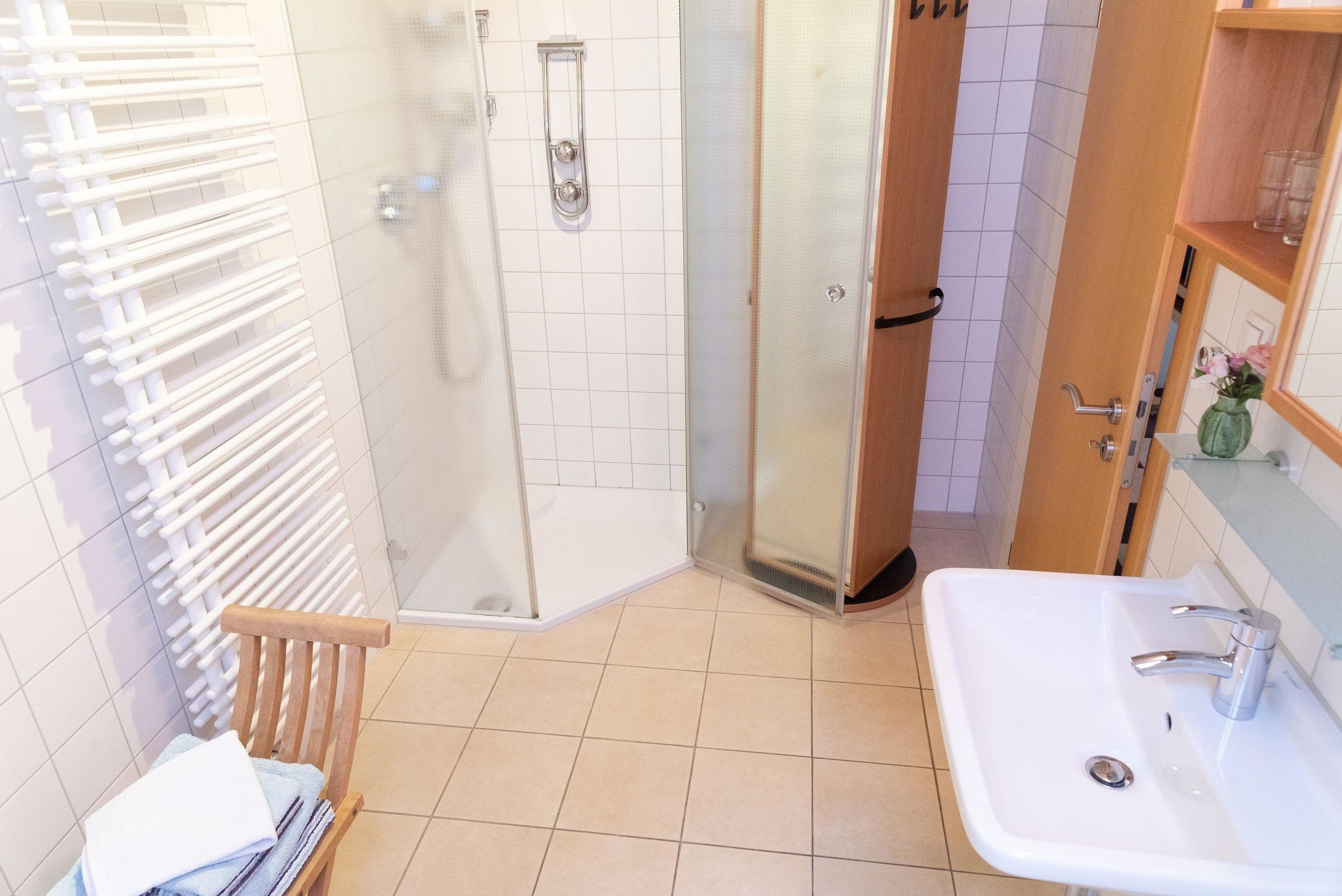 Bad: mit Komfortdusche (keine Badewanne), Waschbecken und WC.