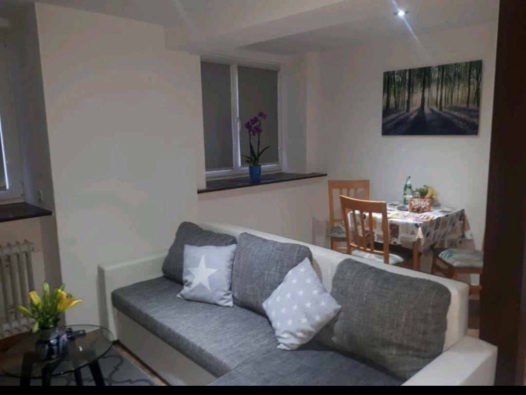 Ihnen steht ein Wohnraum mit einer Couchgarnitur und moderner Anrichte zur Verfügung