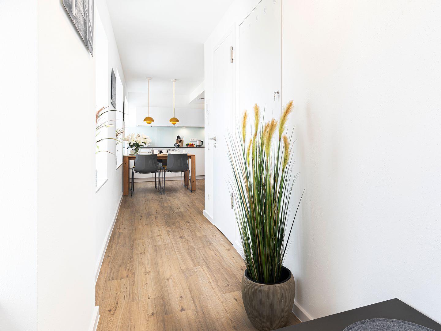 Moderne Ferienwohnung in Binz mit Meerblick, Balkon, zwei Bädern und direktem Strandzugang.