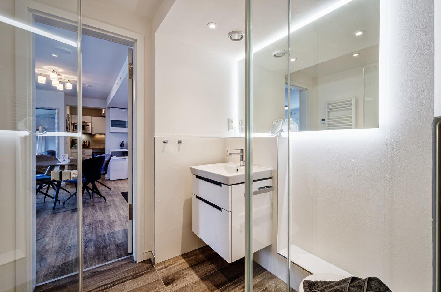 Das hochwertig ausgestattete Bad, inklusive Haartrockner, Handtuchheizkörper, Kosmetikspiegel und Rainshower-Dusche bieten weitere Annehmlichkeiten für Ihren Aufenthalt.