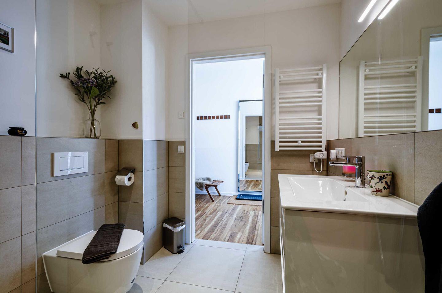 Zwei separate und modern ausgestattete Badezimmer, eines davon en Suite, mit bodengleichen Regenduschen sorgen für einen entspannten Start in den Tag.