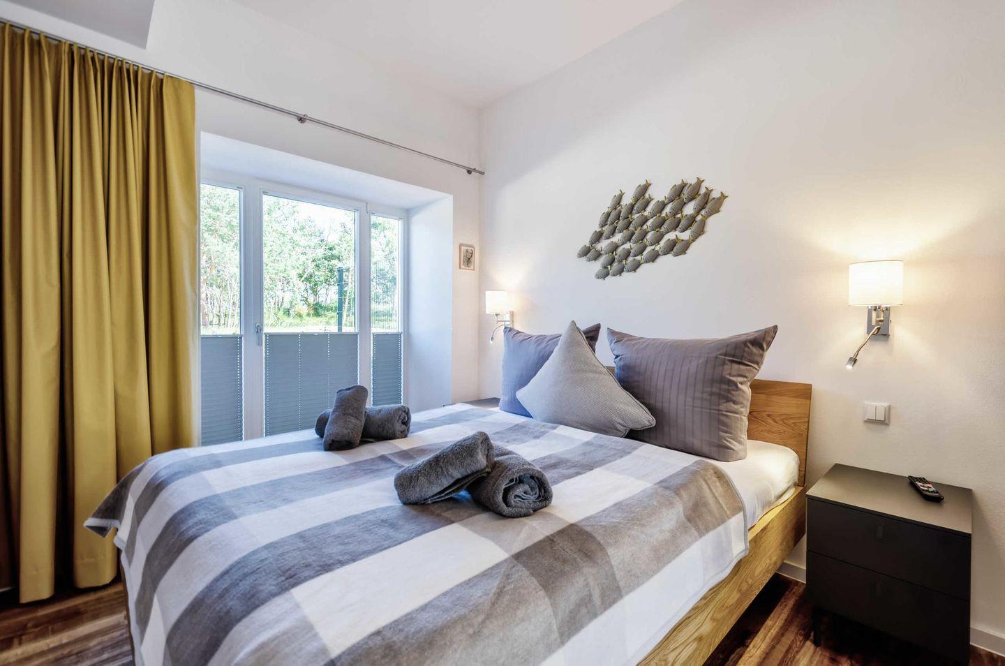 Ihnen stehen zwei Schlafzimmer mit hochwertiger Verdunklung, Insektenschutzgittern und jeweils einem Naturholz-Doppelbett für 2 Personen zur Verfügung. Im Wohnzimmer kann das Ledersofa mit einem Handgriff zum Schlafen für zwei weitere Personen hergerichtet werden. Der zentrale Wohn-Essbereich bietet ausreichend Platz für vier bis sechs Personen. Am massiven Holz-Esstisch trifft sich die ganze Familie. In der vollausgestatteten Küche mit Induktionskochfeld, Geschirrspülmaschine und hochwertigem Kühlschrank mit Gefrierfach lässt sich nach Herzenslust kochen. Eine Waschmaschine steht zur Verfügung.