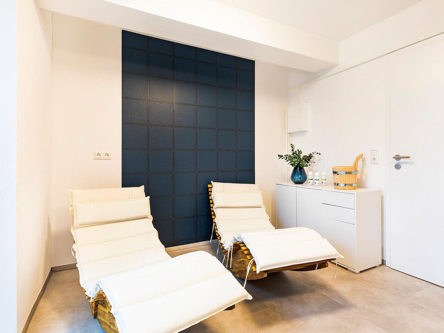 - Private Sauna mit 2 Liegen und mit Dusche in Abstellraum 2. OG, mit Blick Richtung Binnenseite