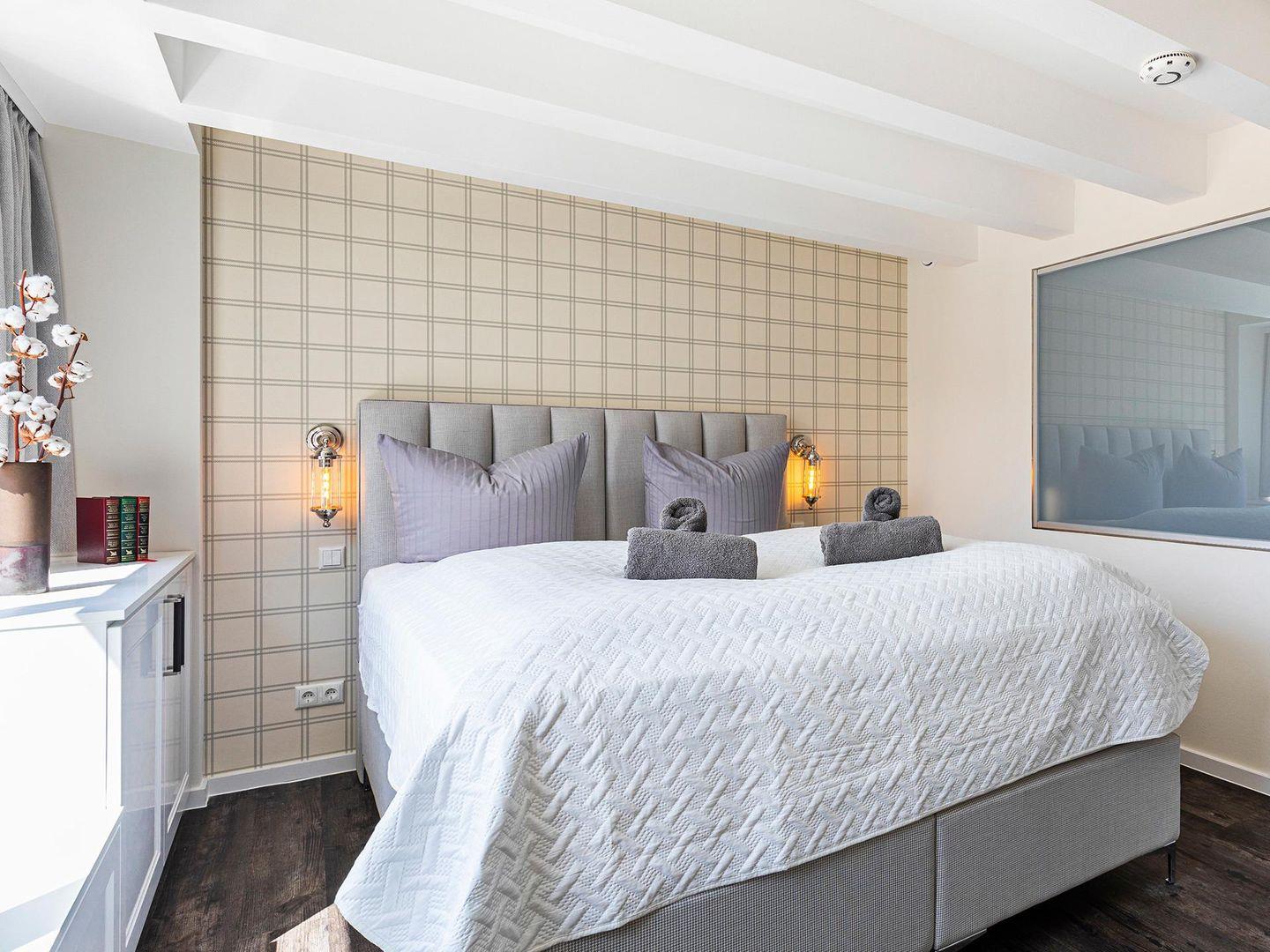 Eine freistehende Badewanne befindet sich neben dem gemütlichen Boxspringbett im Schlafzimmer, so dass Sie bei einem entspannenden Schaumbad den wunderschönen Ausblick genießen können. Parken können Sie vor dem Haus auf dem hauseigenen Parkplatz und mit dem Aufzug gelangen Sie bequem in die vierte Etage.