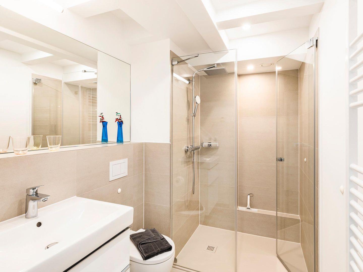 - Badezimmer 2: Regendusche, WC, Waschbecken, Handtuchheizung, Haartrockner, Kosmetikspiegel