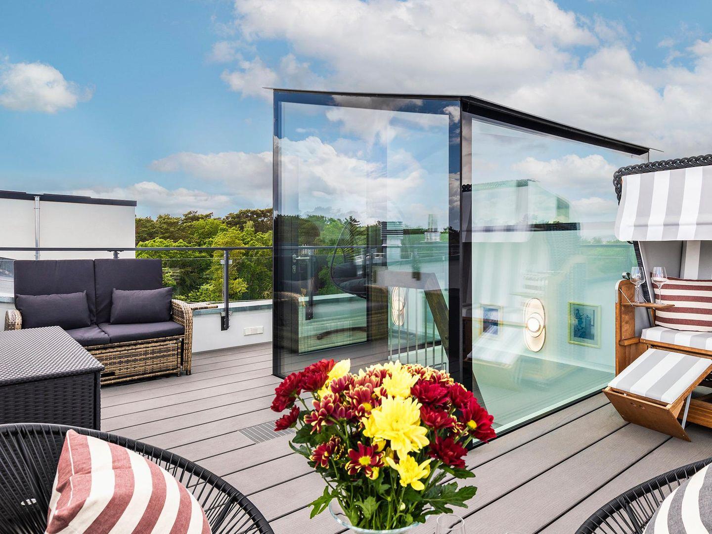 - Dachterrasse: Sonnenschirm und Sitzmöglichkeit, Strandkorb, Schaukel