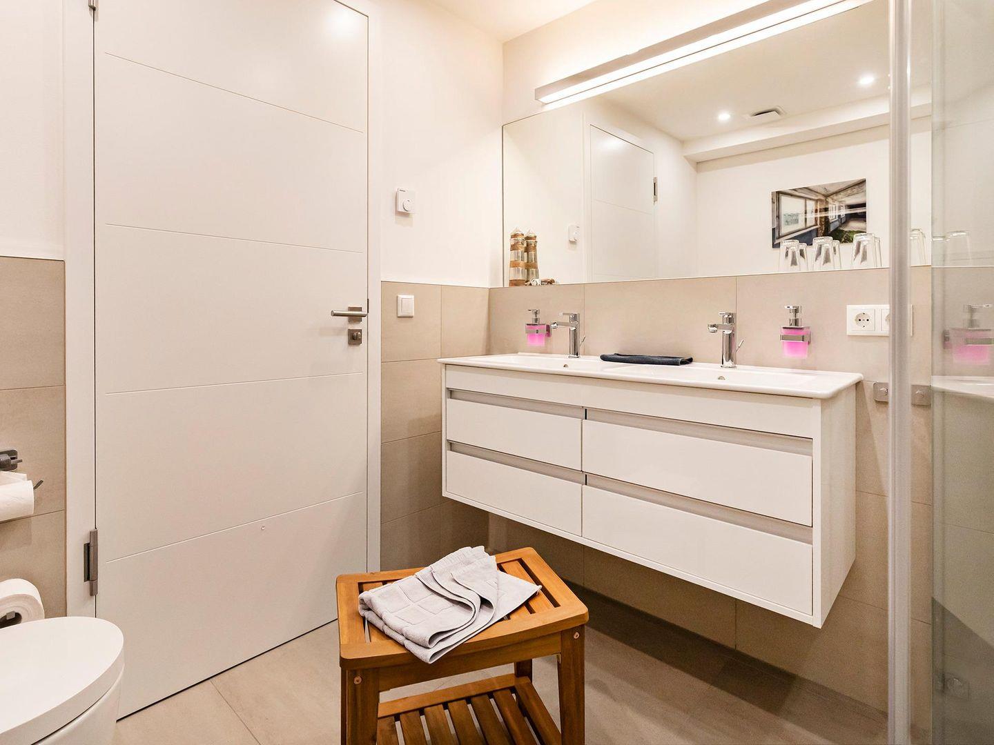 - Badezimmer 1: Regendusche, Doppelwaschbecken, WC und Föhn