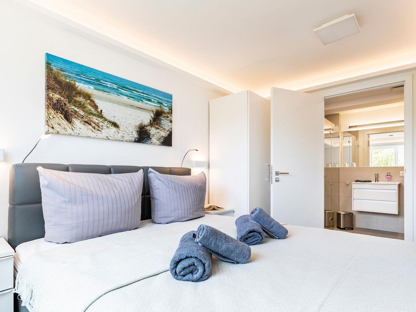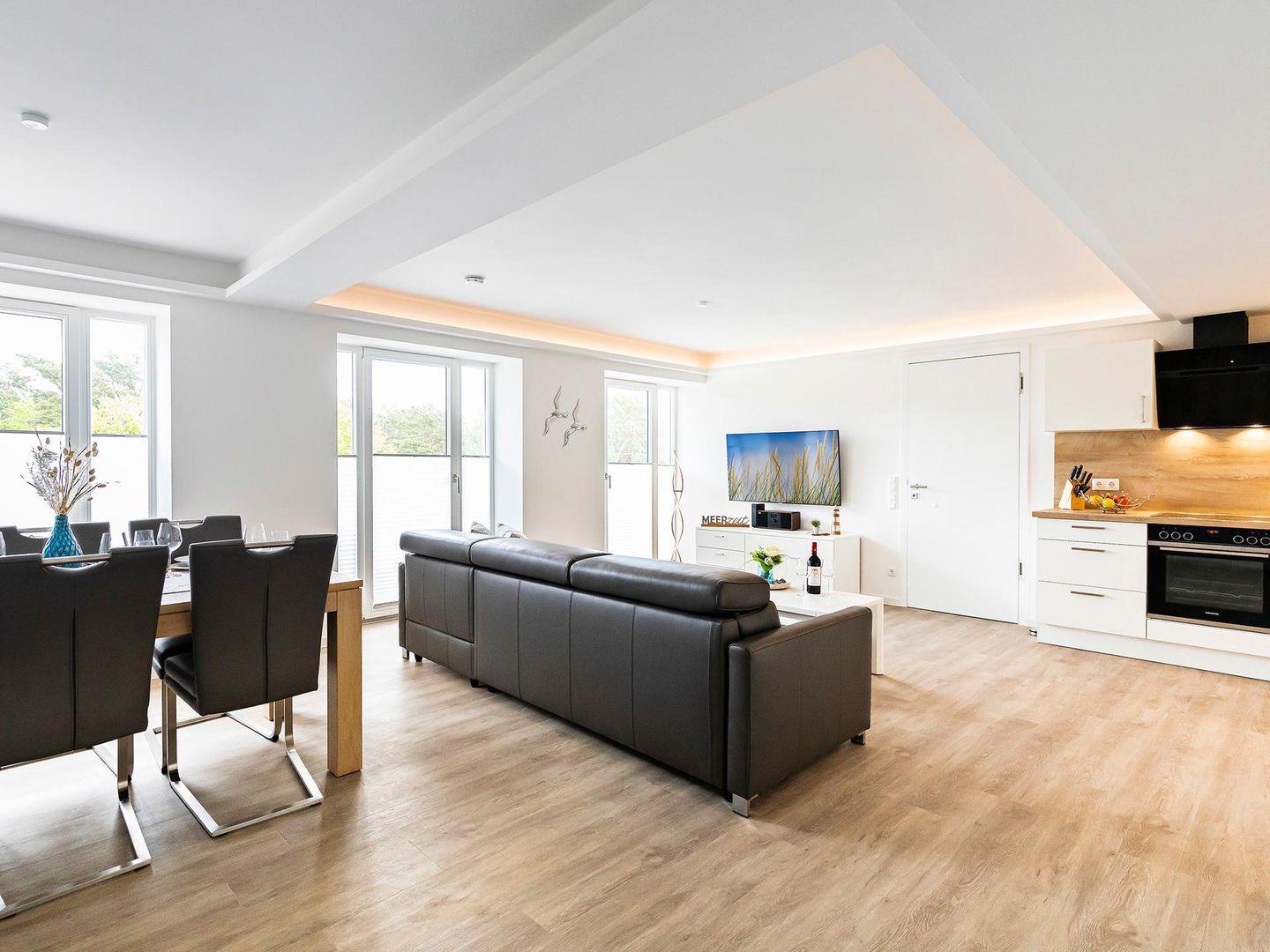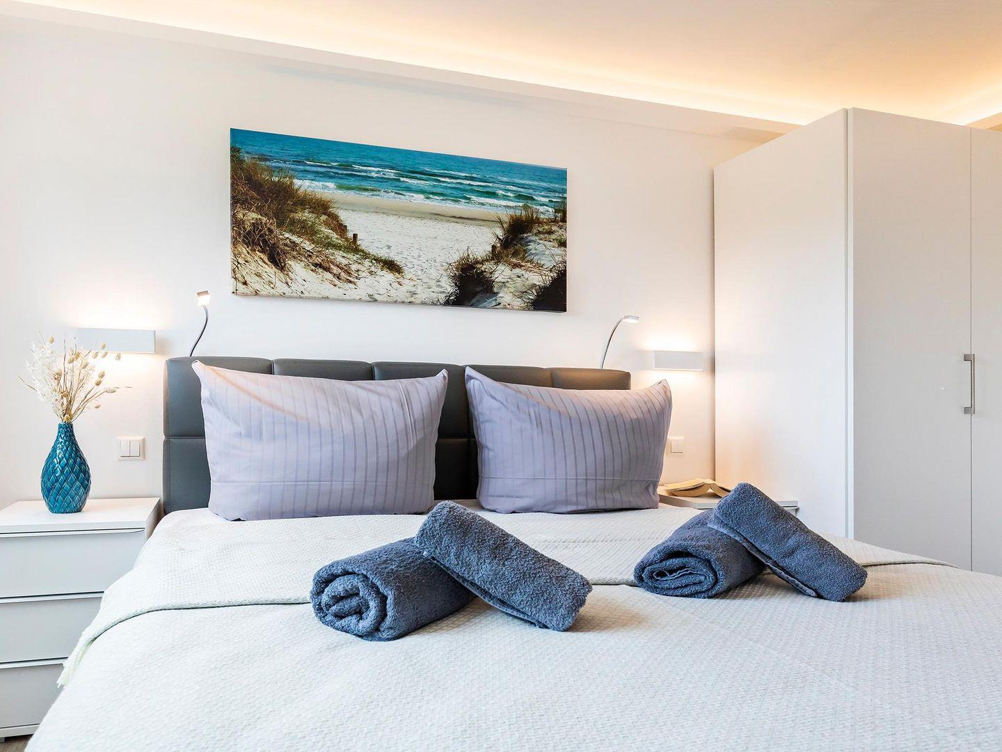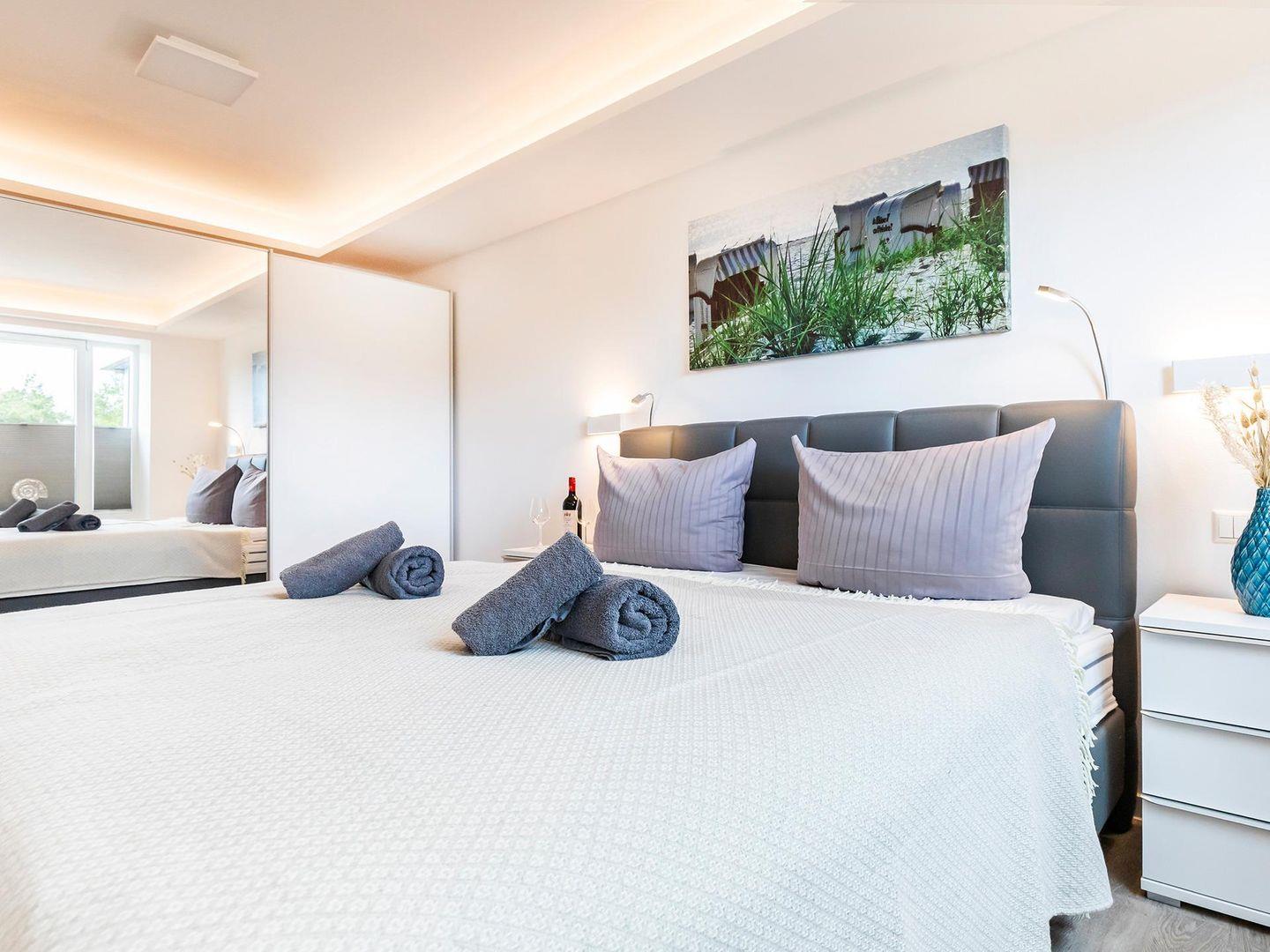 In der gemütlichen Wohnung, mit W-Lan und Meerblick, stehen Ihnen für Ihren Schlafkomfort zwei Schlafzimmer mit jeweils einem Boxspringbett für 2 Personen zur Verfügung und im Wohnzimmer ist eine Aufbettung für zwei weitere Personen möglich. Der zentrale Wohn-Essbereich bietet ausreichend Platz für vier bis sechs Personen am großen Esstisch, sowie auf der bequemen Couch. Der meerseitige Balkon verfügt über 2 Tische und 6 Stühle, die ebenfalls zum Verweilen oder gemeinsamen Essen einladen, dass Sie in der vollausgestatteten Küche selbst zubereiten können.