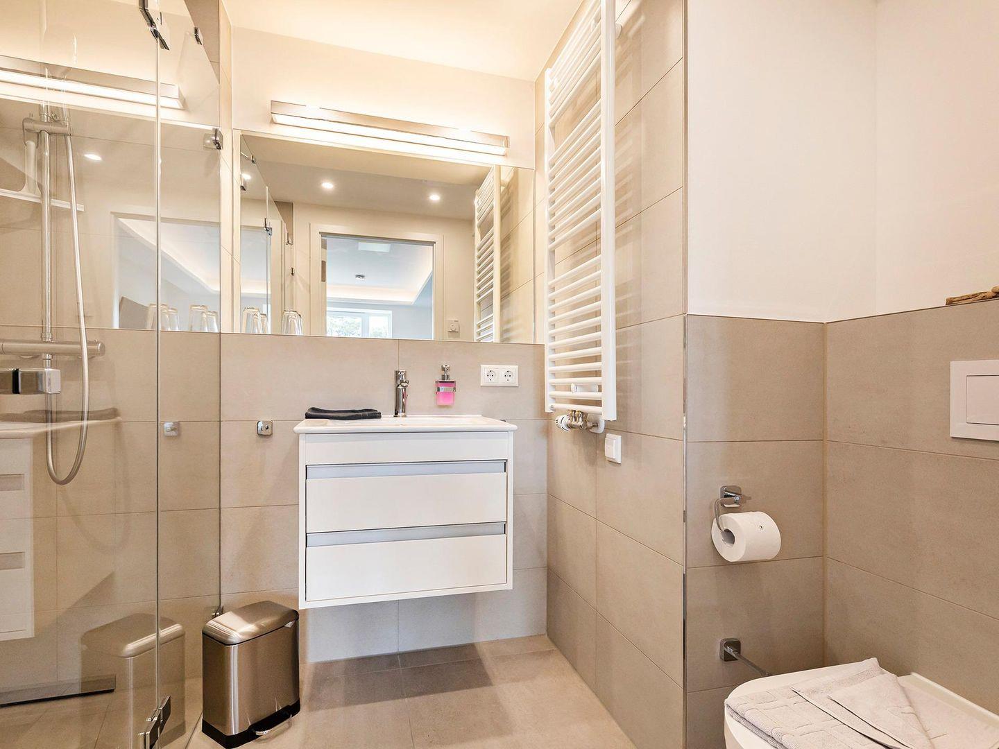 - Badezimmer 2: Regendusche, Waschbecken, WC und Föhn