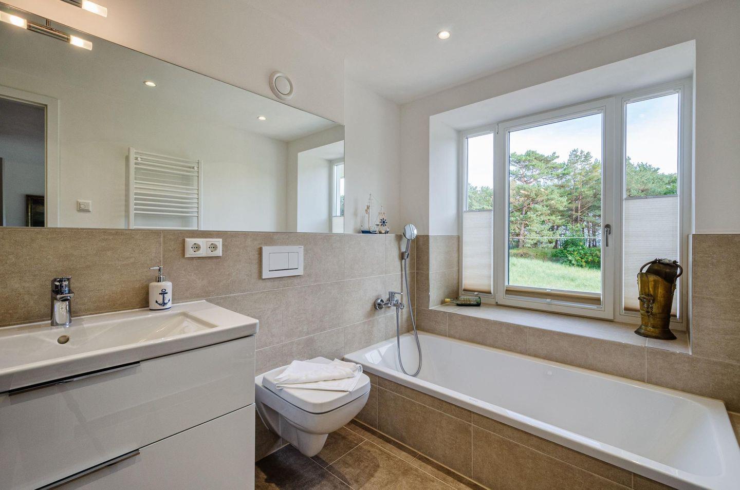 Eine geschwungene Treppe führt Sie hinauf in das erste Obergeschoss, hier erwarten Sie 2 Bäder und 3 Schlafzimmer, die Schlafplätze für bis zu 6 Personen bieten. Eines der Schlafzimmer grenzt direkt an das Master-Badezimmer an, in welchem Sie neben einer Dusche auch eine Badewanne, mit Ausblick zum Meer und dem Dünenwäldchen, erwartet.