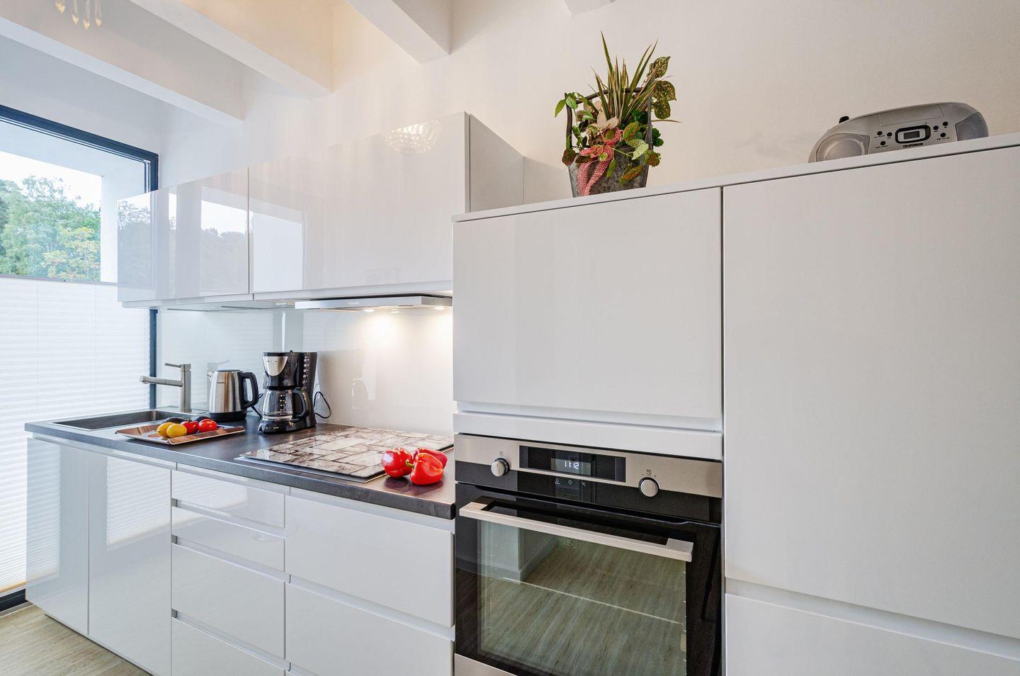 Die offene Küche bietet Platz zum gemütlichen Kochen. Im Abstellraum finden Sie eine Waschmaschine für die kleine Wäsche zwischendurch. Auch ein Parkplatz steht Ihnen kostenfrei zur Verfügung.