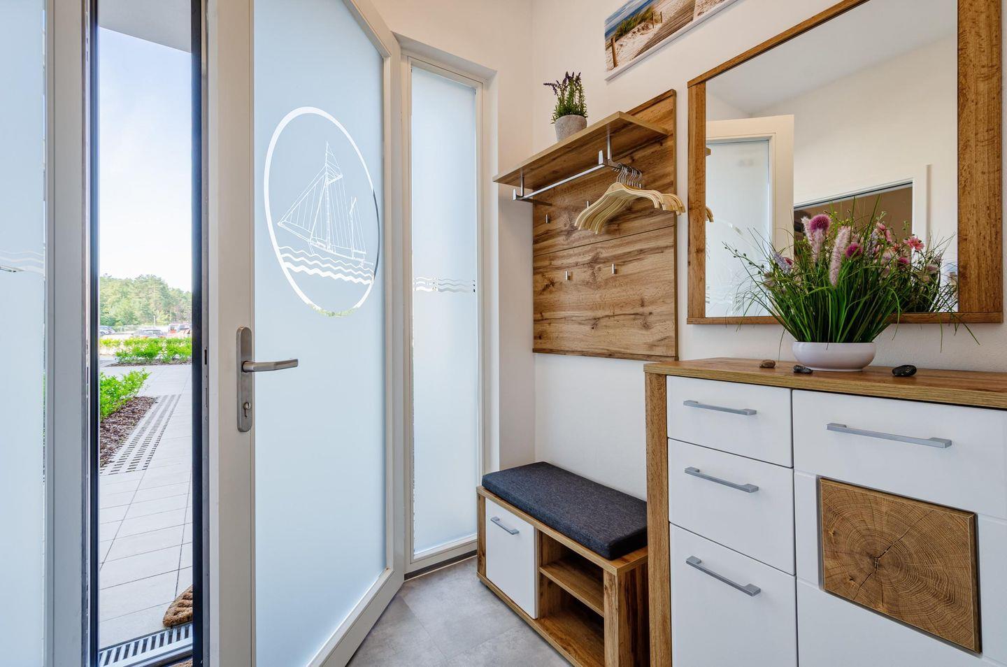 Der Wohn- und Essbereich lädt mit einer offenen Küche zum gemeinsamen Kochen. Wie wäre es anschließend mit einem gemütlichen Spaziergang an die Ostsee, die sie direkt über die Terrasse erreichen können? Genießen Sie das Frühstück mit Morgensonne und beenden Sie den Tag mit einem Glas Sekt in der Abendsonne. Das Badezimmer ist mit einer großen Regendusche ? natürlich ebenerdig - und einem großzügigen Waschtisch ausgestattet.