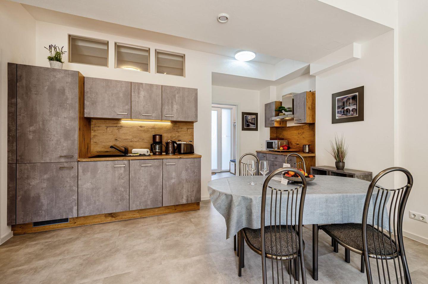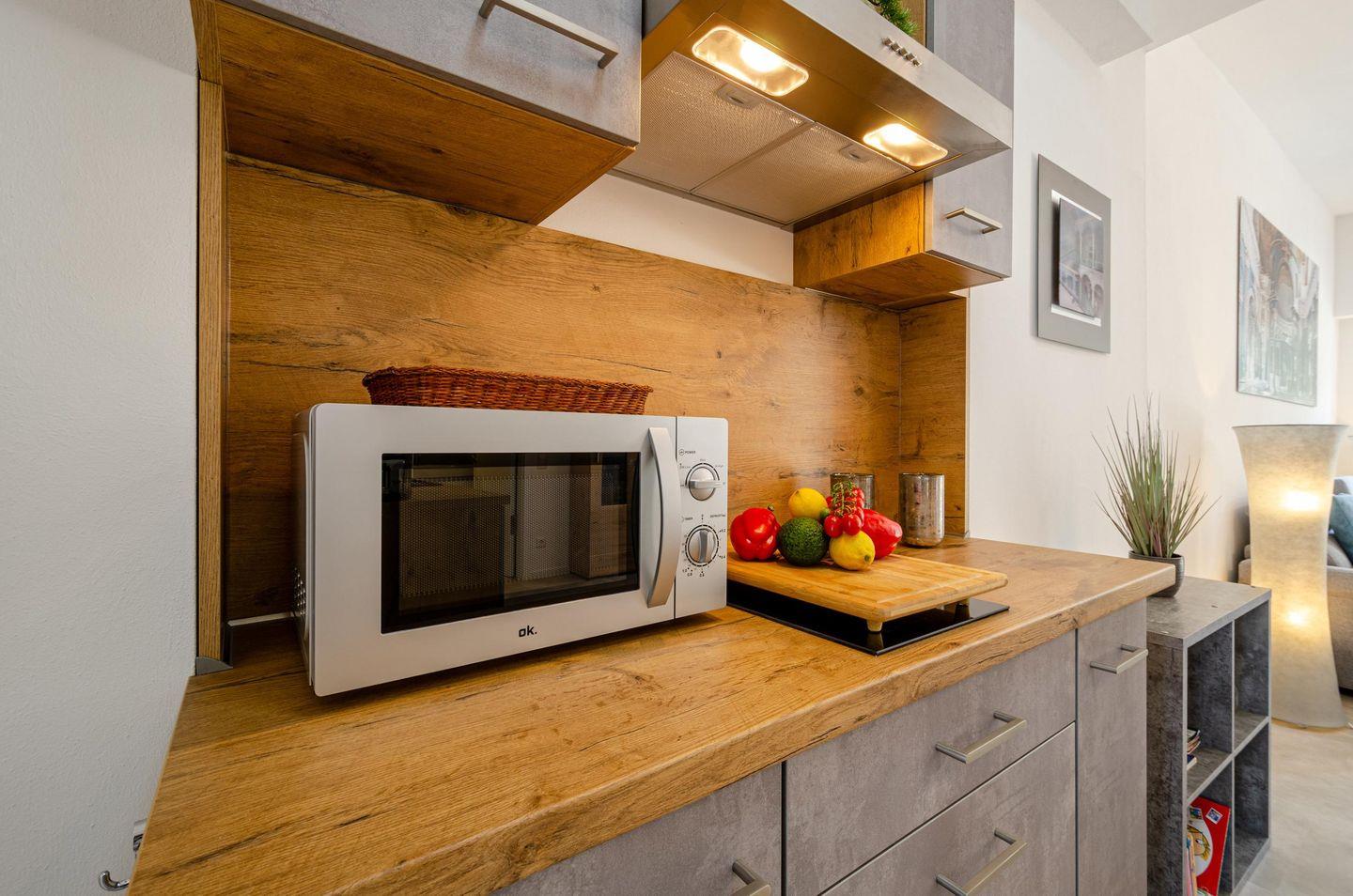 - Bitte beachten Sie: Die Küche besitzt keinen Backofen (dafür aber eine Mikrowelle mit Heißluft und Grillfunktion für z. Bsp. Pizzas und Brötchen) und kein Gefrierfach.