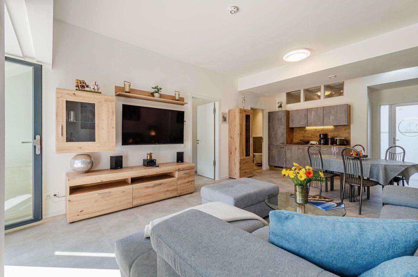 - Wohnzimmer: Schlafsofa und Sessel, TV, Essbereich, Zugang zur Terrasse