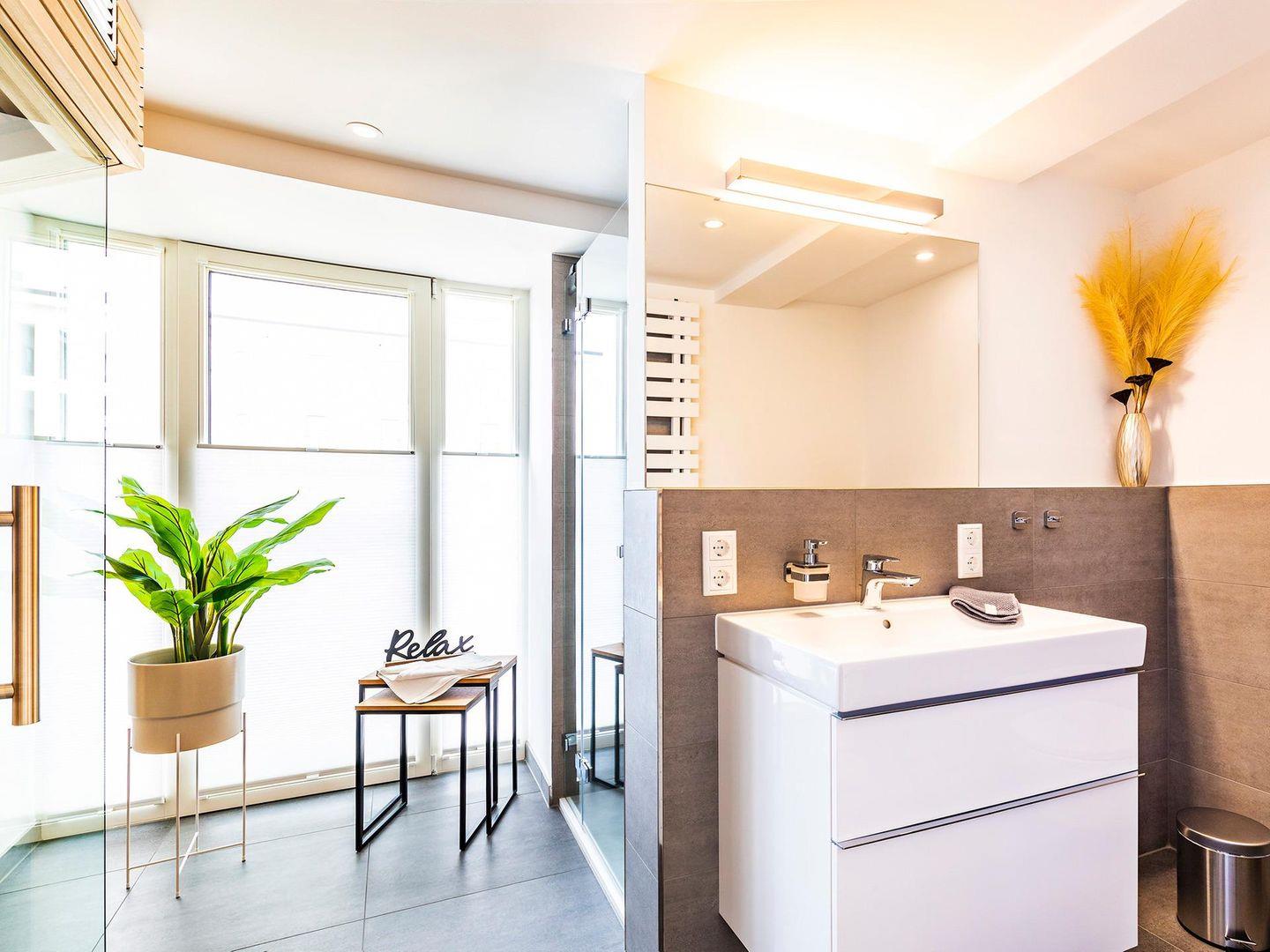 Die stilvoll eingerichtete Wohnung ist mit einem modernen Badezimmer mit Regendusche und WC ausgestattet. Ein zusätzliches Gäste-WC ist ebenfalls vorhanden. Eine Fußbodenheizung sorgt für wohlige Wärme.