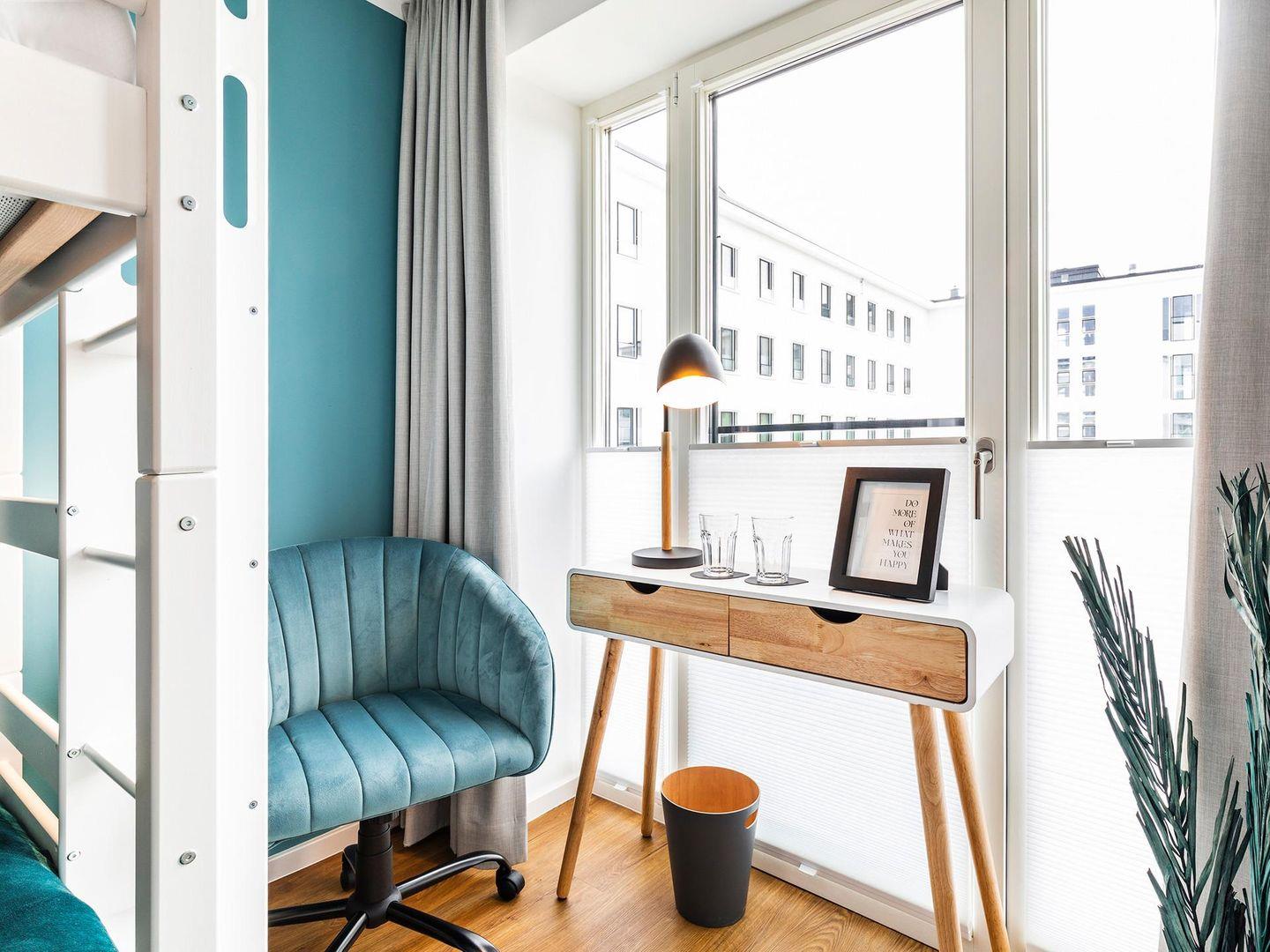- Gardinen im Wohn- und Schlafzimmer sowie Plissees in der Küche zum Verdunkeln vorhanden