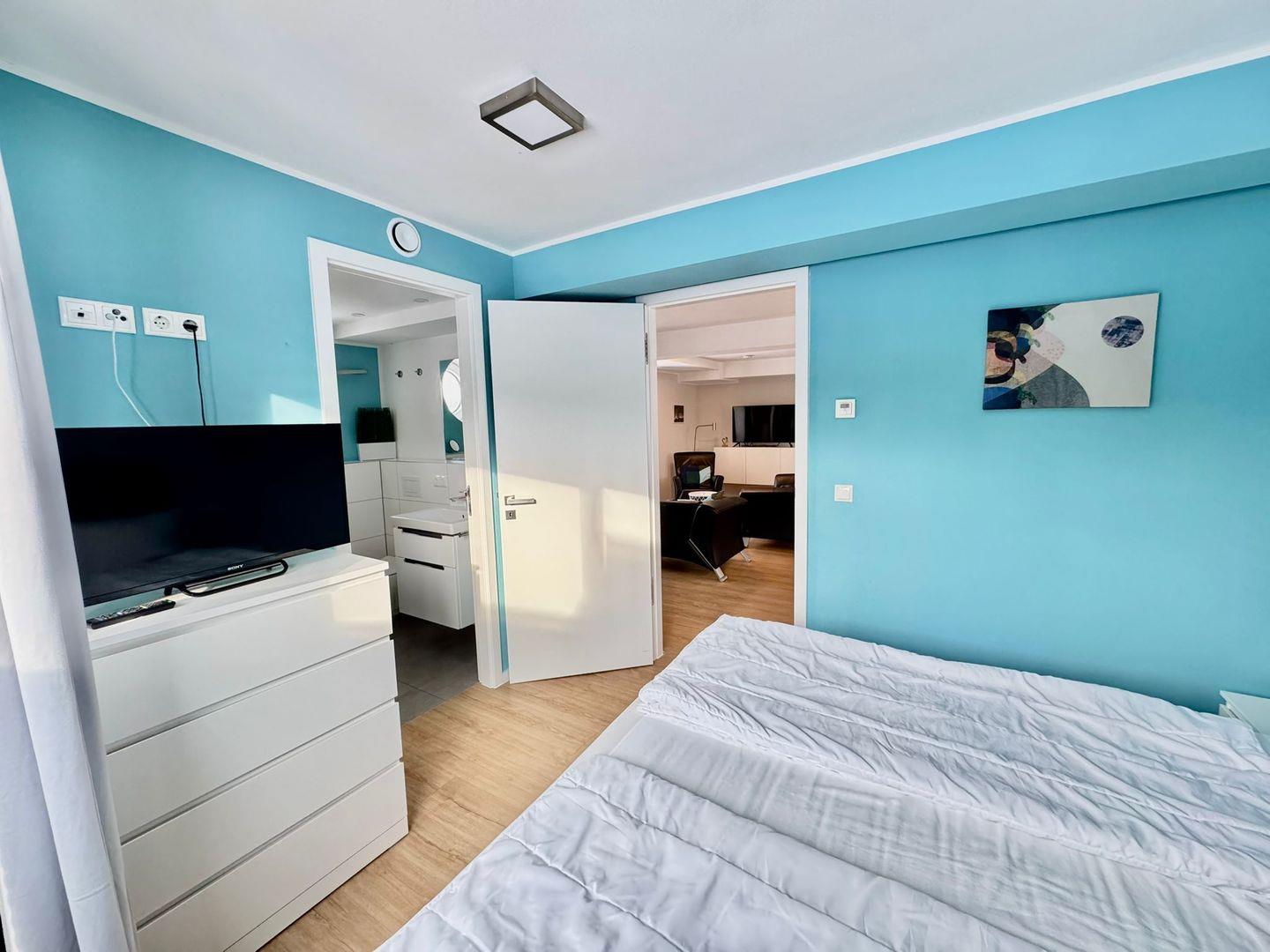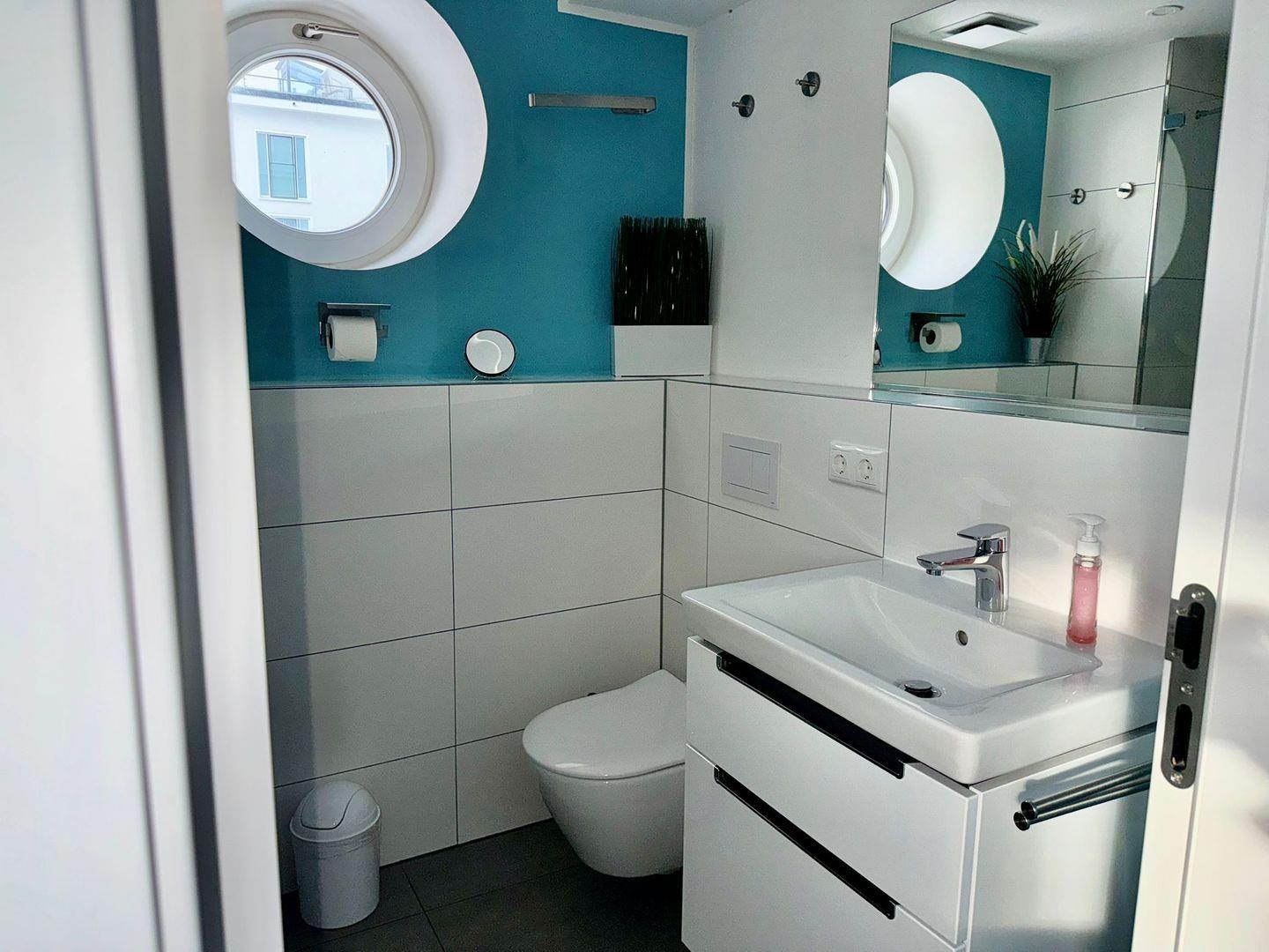 Modernes Apartment Meeresglück in Prora, nur 50 m vom Strand entfernt, mit WLAN und zwei Badezimmern.