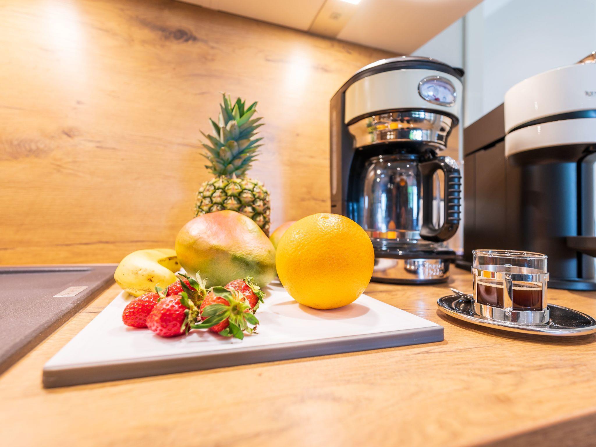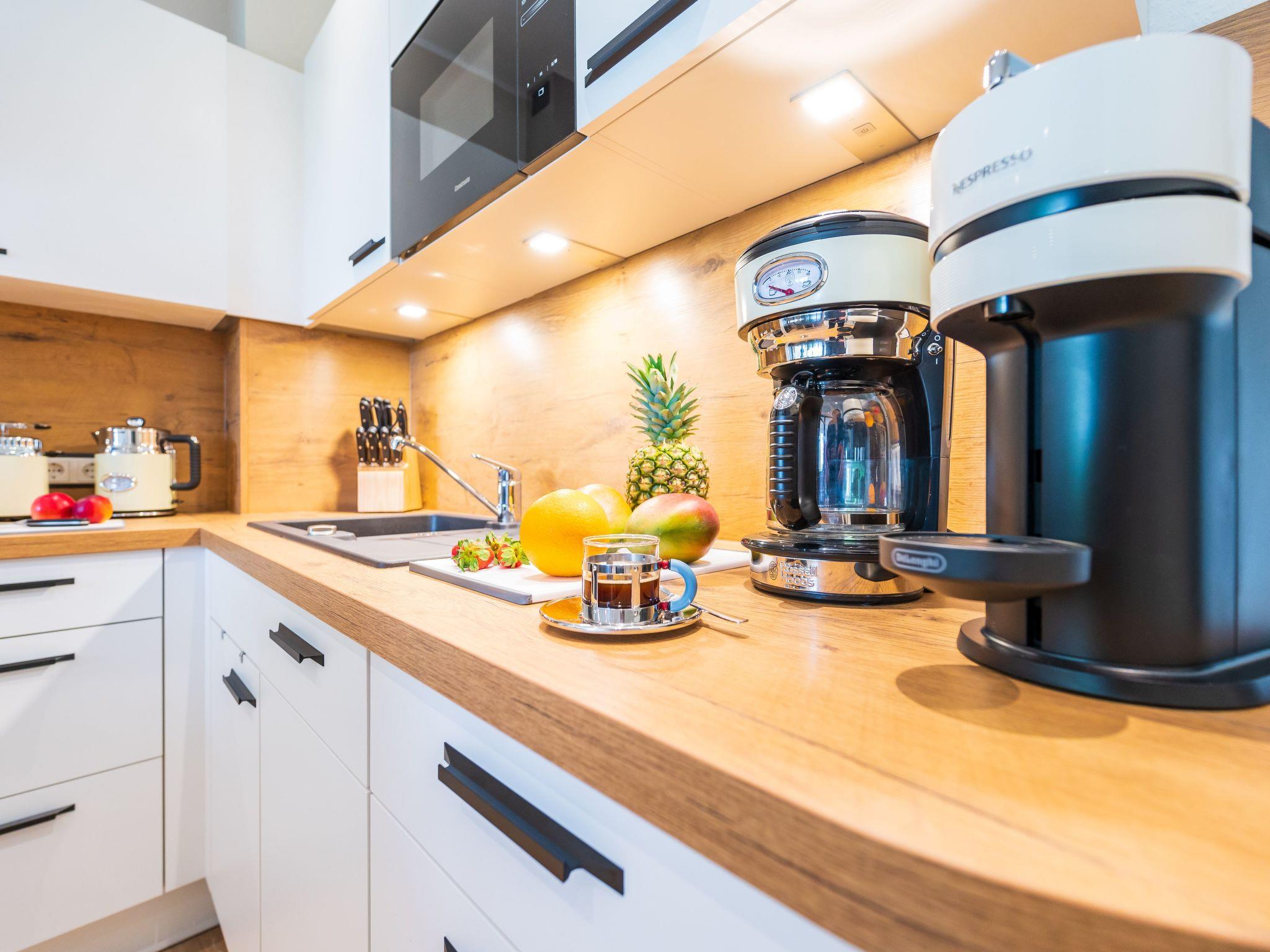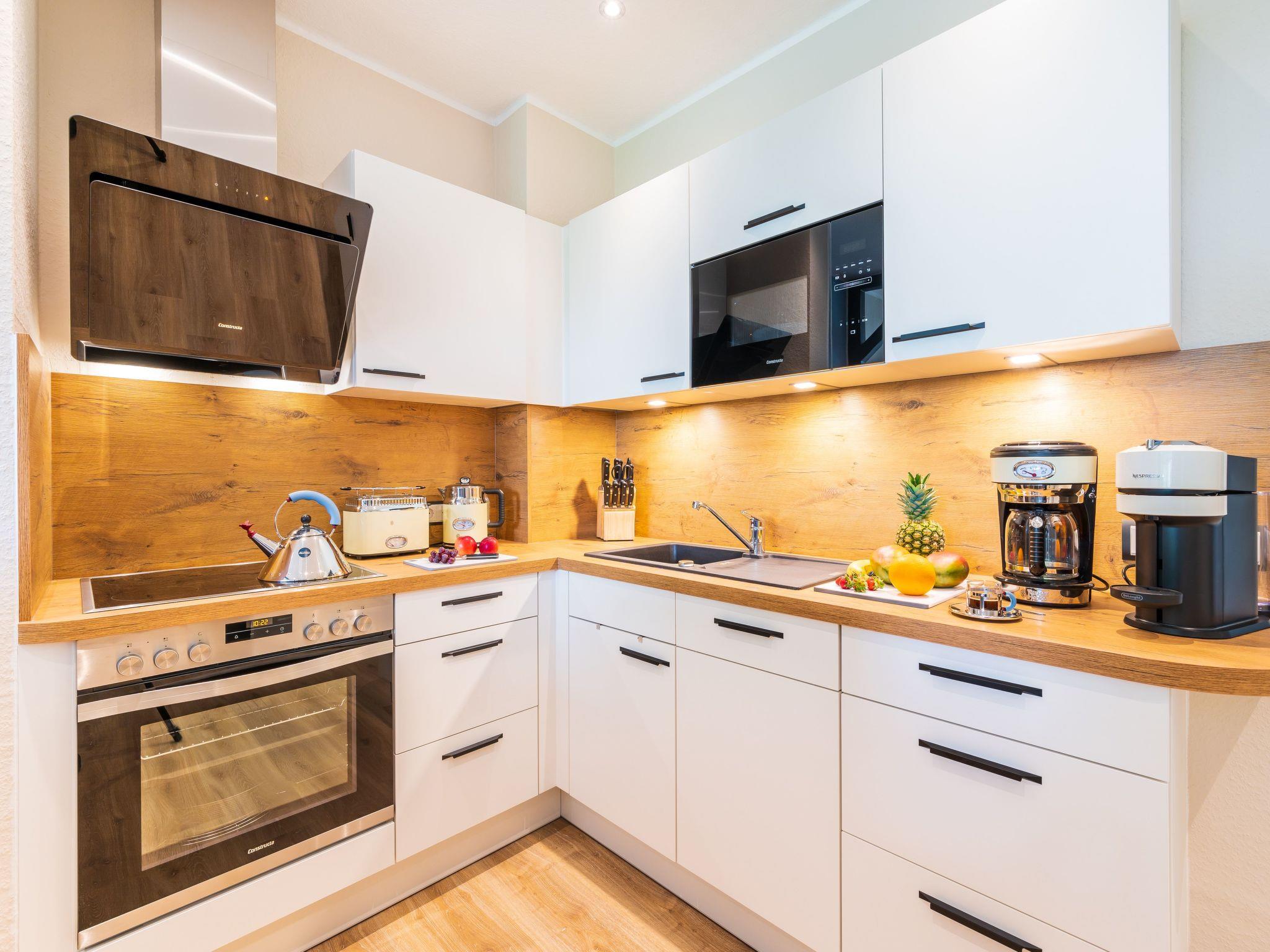 An den Wohnbereich grenzt eine sehr gut eingerichtete Küchenzeile mit Essplatz an (Geschirrspüler, große Kühl-Gefrierkombination, Cerankochfeld, Backofen, Mikrowelle, Kaffeemaschine, zusätzliche Nespresso-Maschine Vertuo mit Milchaufschäumer + Alessi-Pressfilter, Toaster, Wasserkocher, Handmixer, hochwertiges Porzellan, vollständiges Kaffeeservice etc. sind vorhanden). Ebenfalls finden Sie einen begehbaren Kleiderschrank in der Wohnung vor. Außerdem stehen noch ein Bügelbrett und Bügeleisen, ein Wäscheständer sowie ein Staubsauger für Sie zur Verfügung.