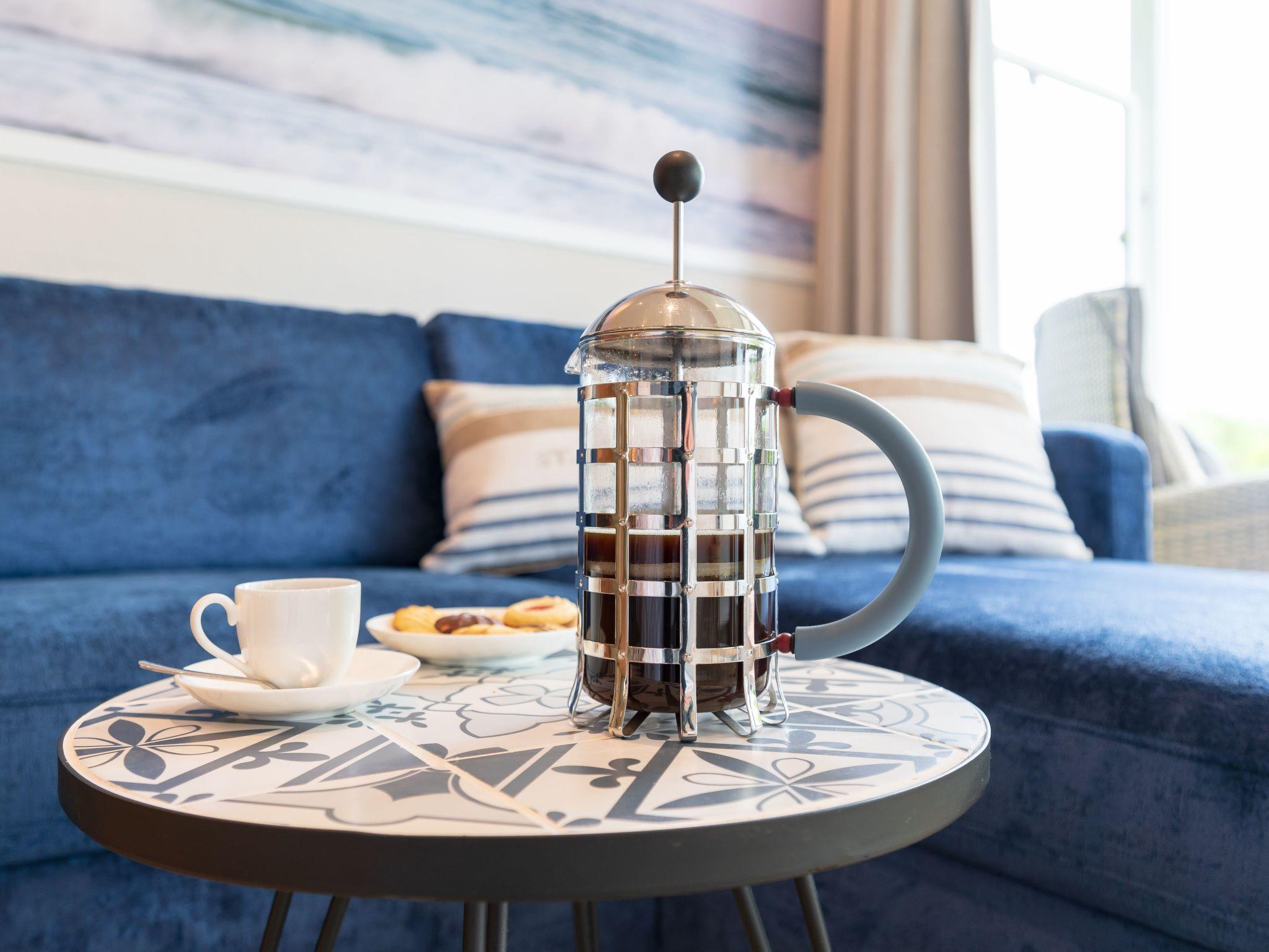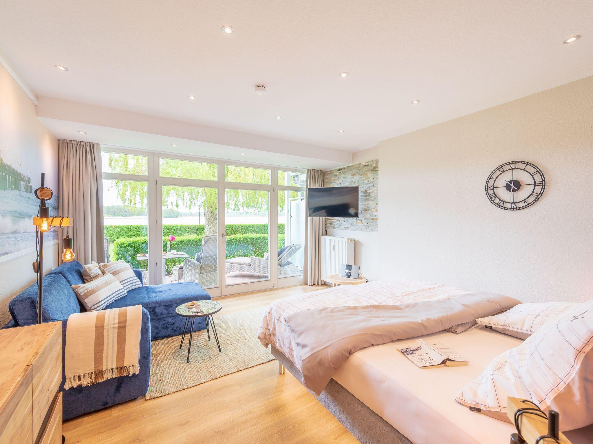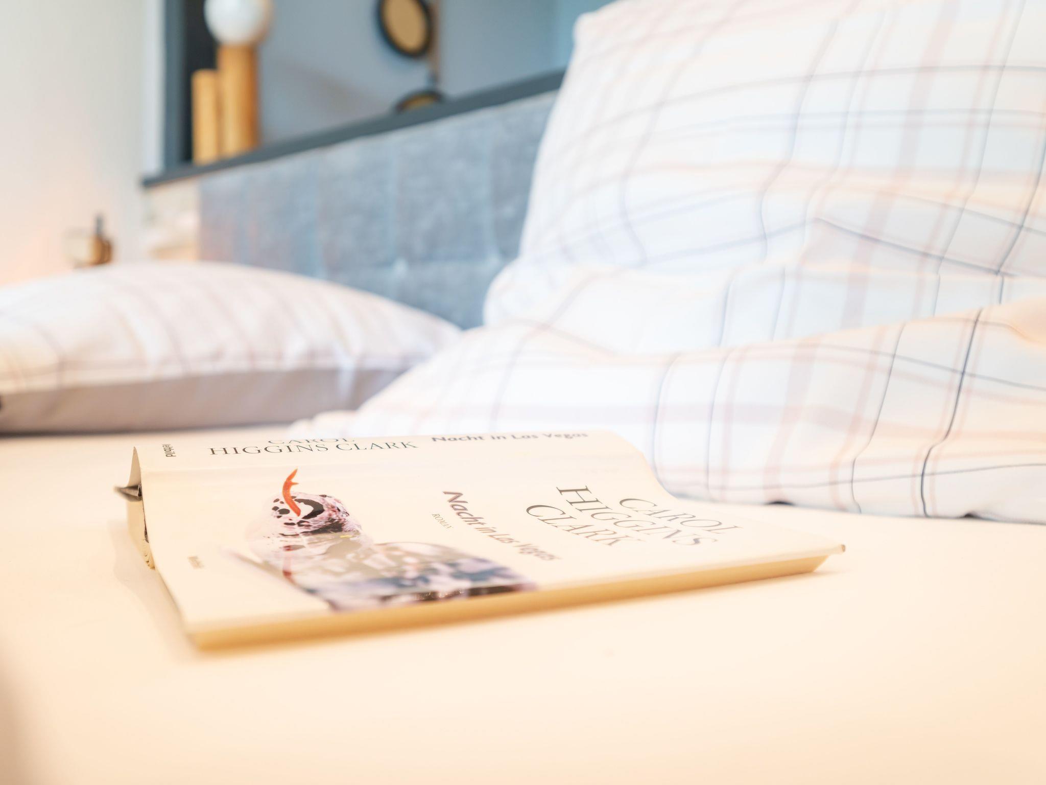 Der lichtdurchflutete Wohnraum verfügt über ein gemütliches Samtsofa sowie ein Boxspringbett (180 x 200 cm) für einen erholsamen Schlaf. Es hat einen 43-Zoll-LED-Fernseher mit dreh- und schwenkbarer Wandhalterung, Kabel-TV, Digitalradio und kostenloses WLAN.