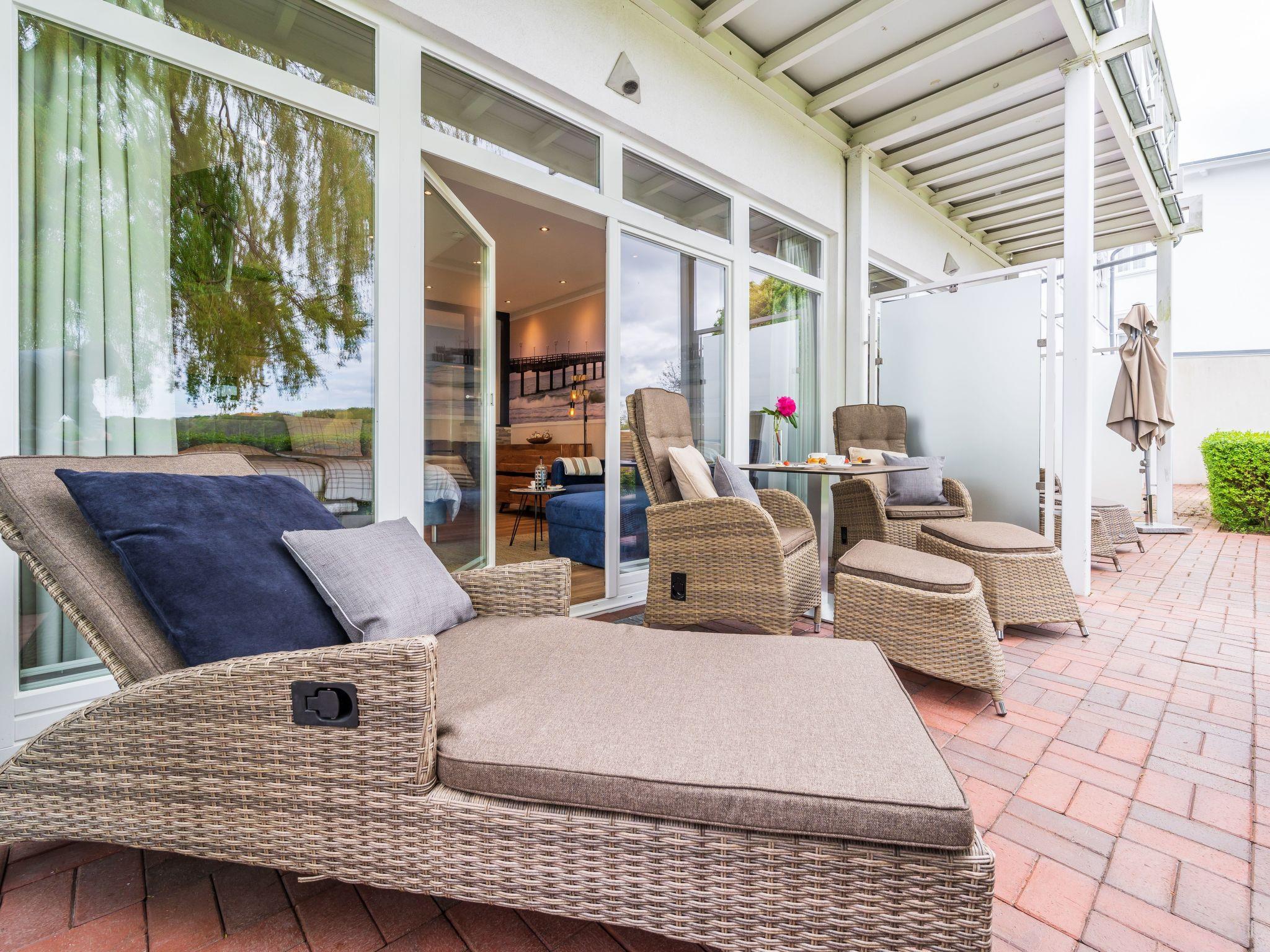 Darüber hinaus hat die Wohnung ein schönes und großes Duschbad mit Fön und Kosmetikspiegel. Auf der Südterrasse stehen hochwertige, in der Sitzposition verstellbare Rattansessel mit Fußauflage, eine Sonnenliege und ein Tisch (alles von der Marke Ploß).
