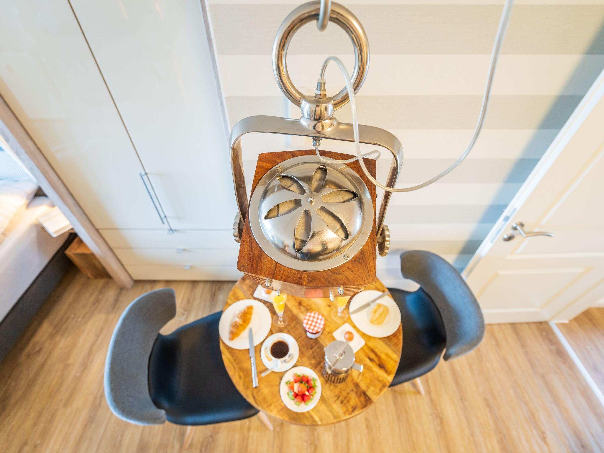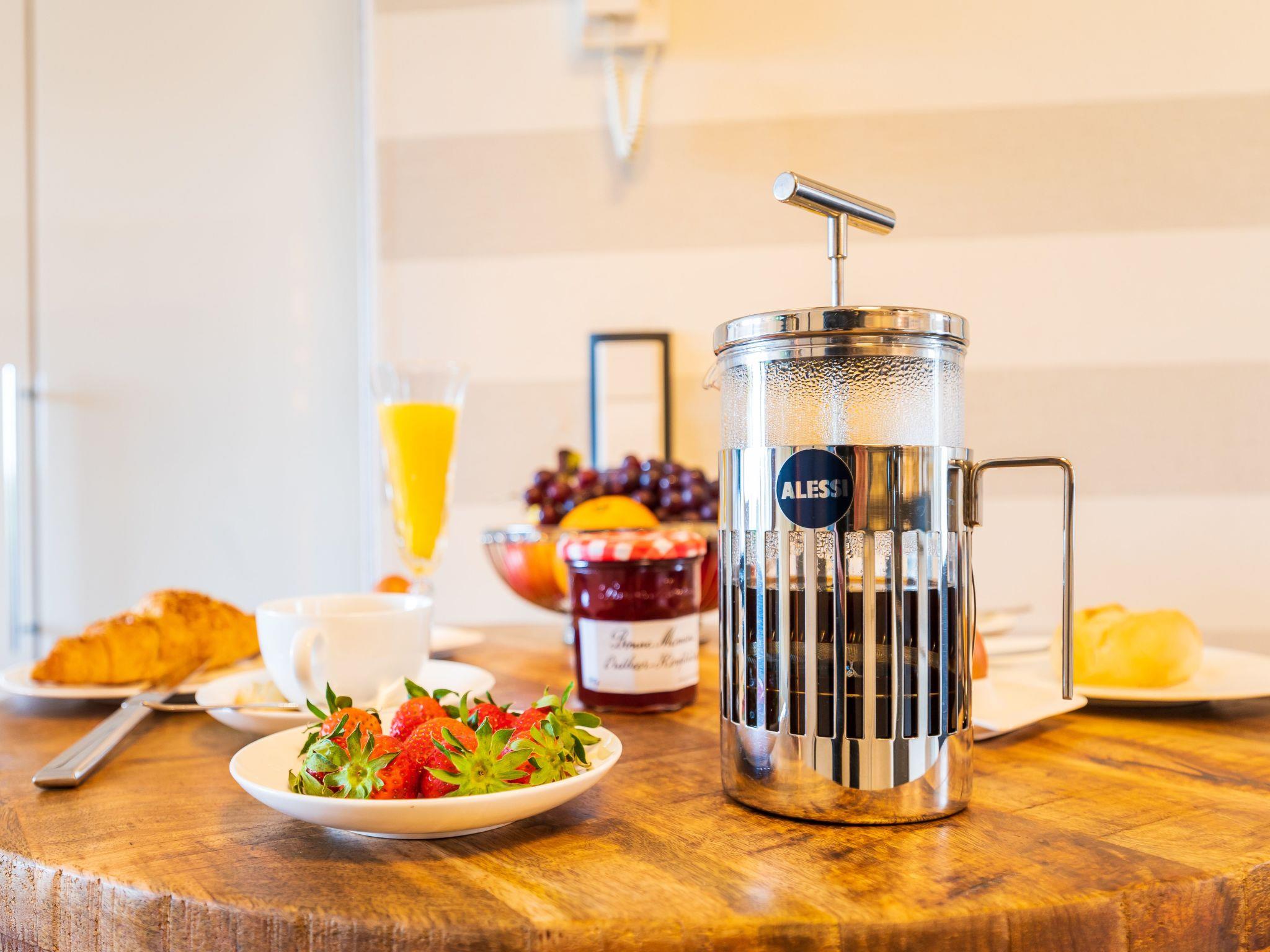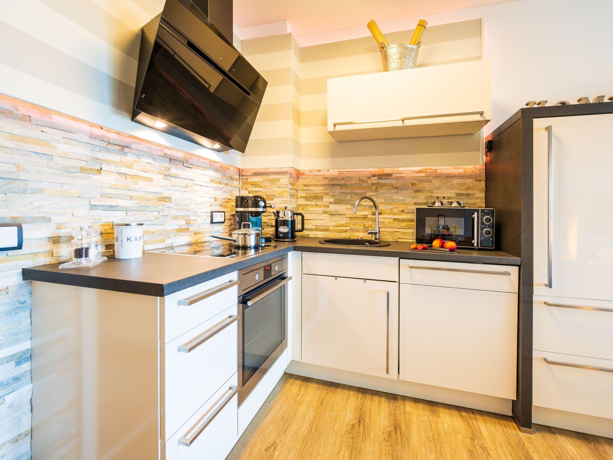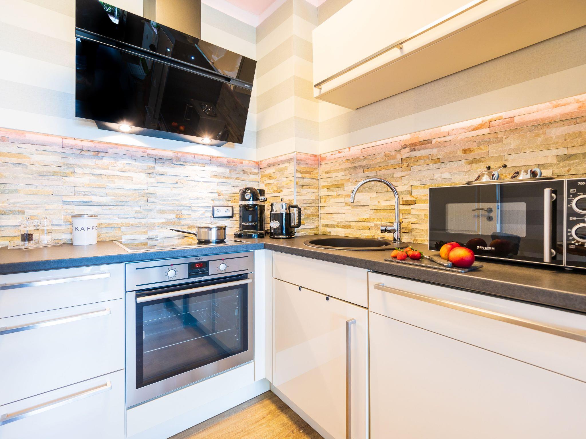 An den Wohnbereich grenzt eine sehr gut eingerichtete Küchenzeile mit Essplatz an (Geschirrspüler, Kühlschrank mit Gefrierfach, Cerankochfeld, Backofen, Mikrowelle, Kaffeemaschine, zusätzlicher Alessi-Pressfilter, Toaster, Wasserkocher, hochwertiges Porzellan, vollständiges Kaffeeservice etc. sind vorhanden). Darüber hinaus hat die Wohnung ein schönes Duschband mit Fön und Kosmetikspiegel. Sie verfügt über eine Südterrasse mit hochwertigen in der Sitzposition verstellbaren Rattansesseln mit Fußauflage, einen Tisch (beides von der Marke Ploß) und einen Sonnenschirm.