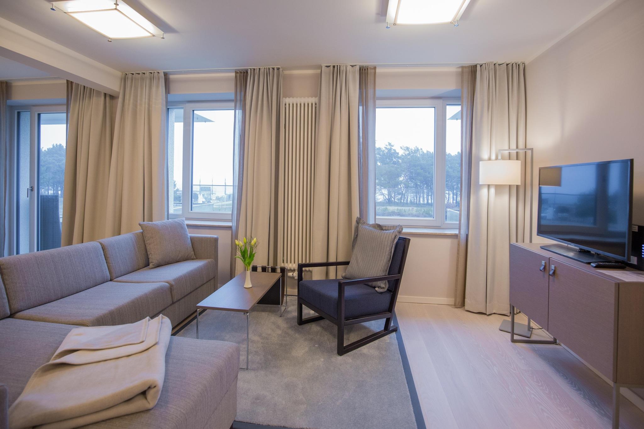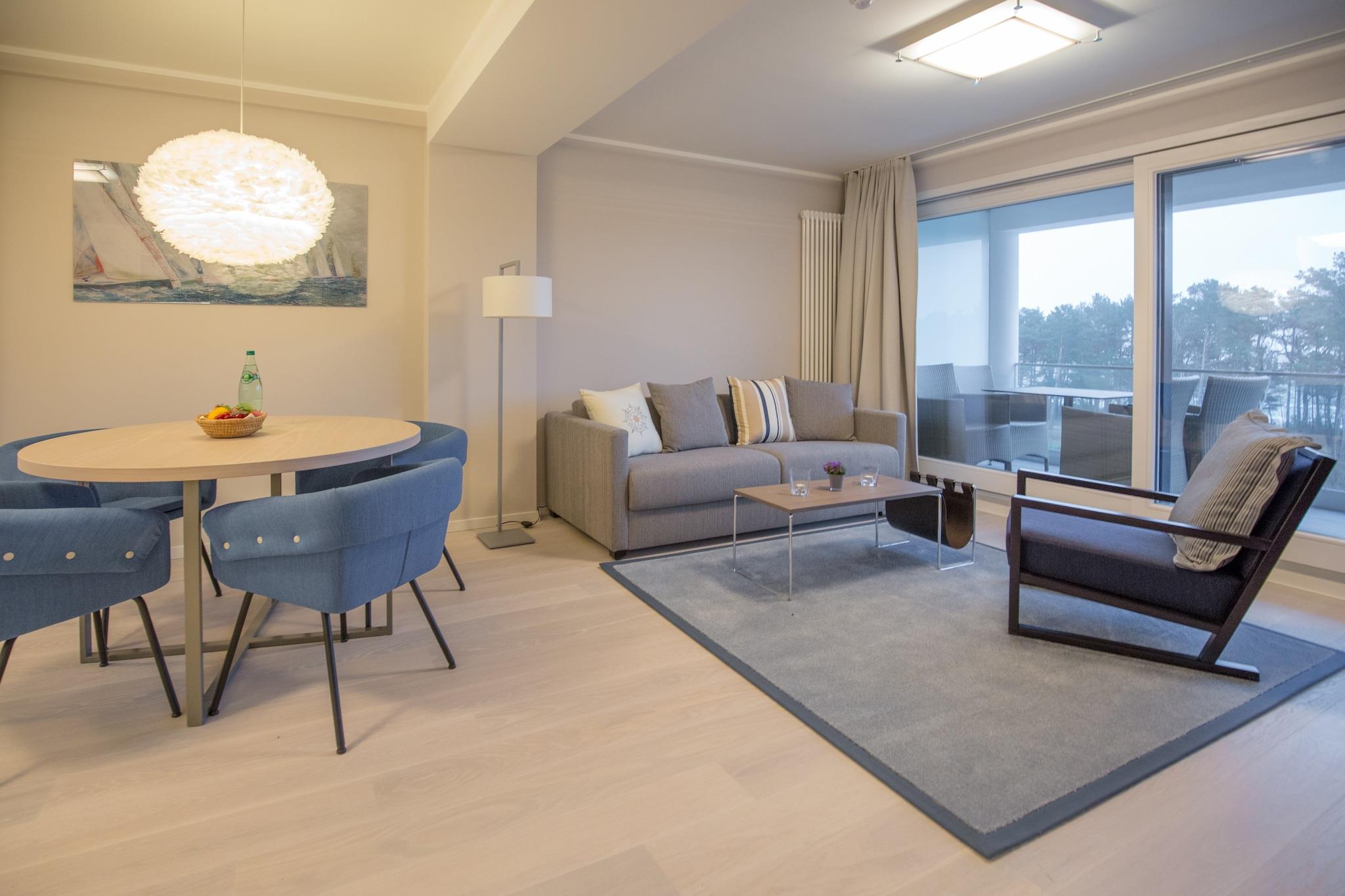 Moderne Ferienwohnung in Dünenresidenz Prora mit Balkon, nah am Strand und vielfältigen Freizeitmöglichkeiten für Familien.