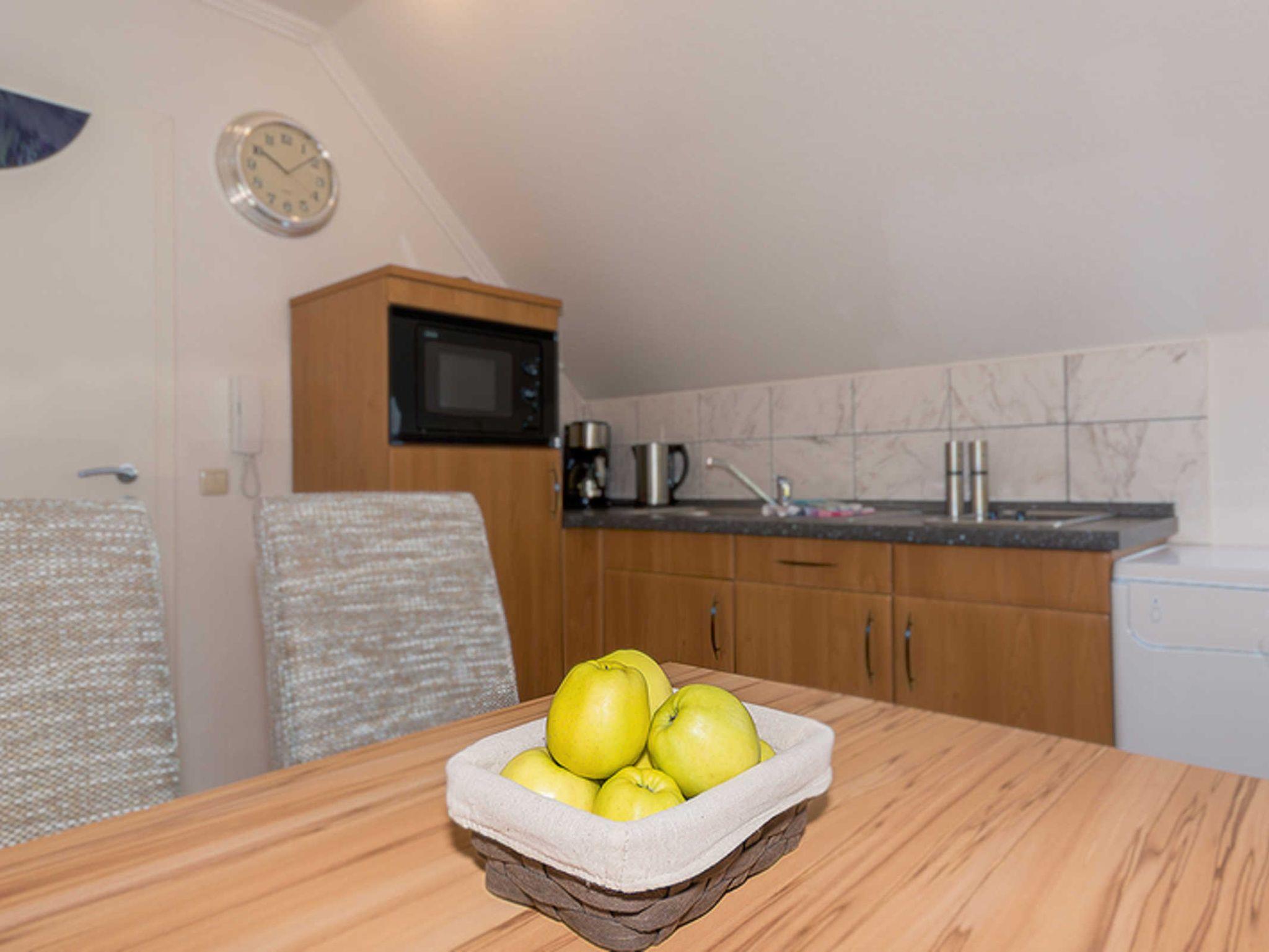 Diese ca. 35 m² große Studio-Wohnung finden Sie im Dachgeschoss des Hauses. Ausgestattet mit jeweils einer kompletten Miniküche mit Doppelcerankochfeld Geschirrspüler, Mikrowelle, einer Essgruppe, einem bequemen Doppelbett, einem großen Kleiderschrank, einer gemütlichen Schlafcouch sowie einem separaten Bad mit Dusche, WC und Waschtisch. Hier finden 1 bis 4 Personen eine ideale Ferienunterkunft. Gern können auch die beiden Wohnungen 5 und 6 zusammen (somit die obere Etage komplett) gebucht werden.