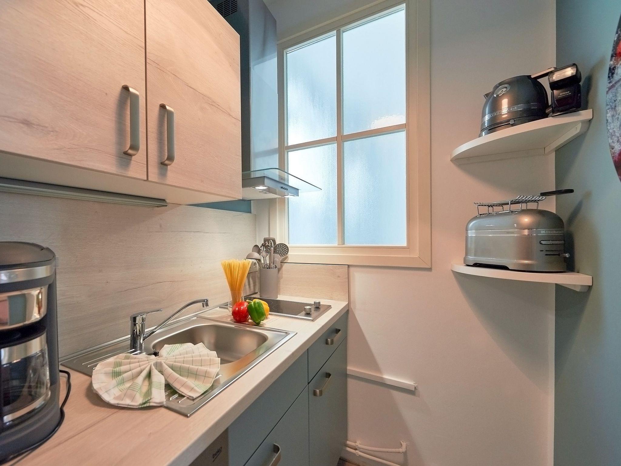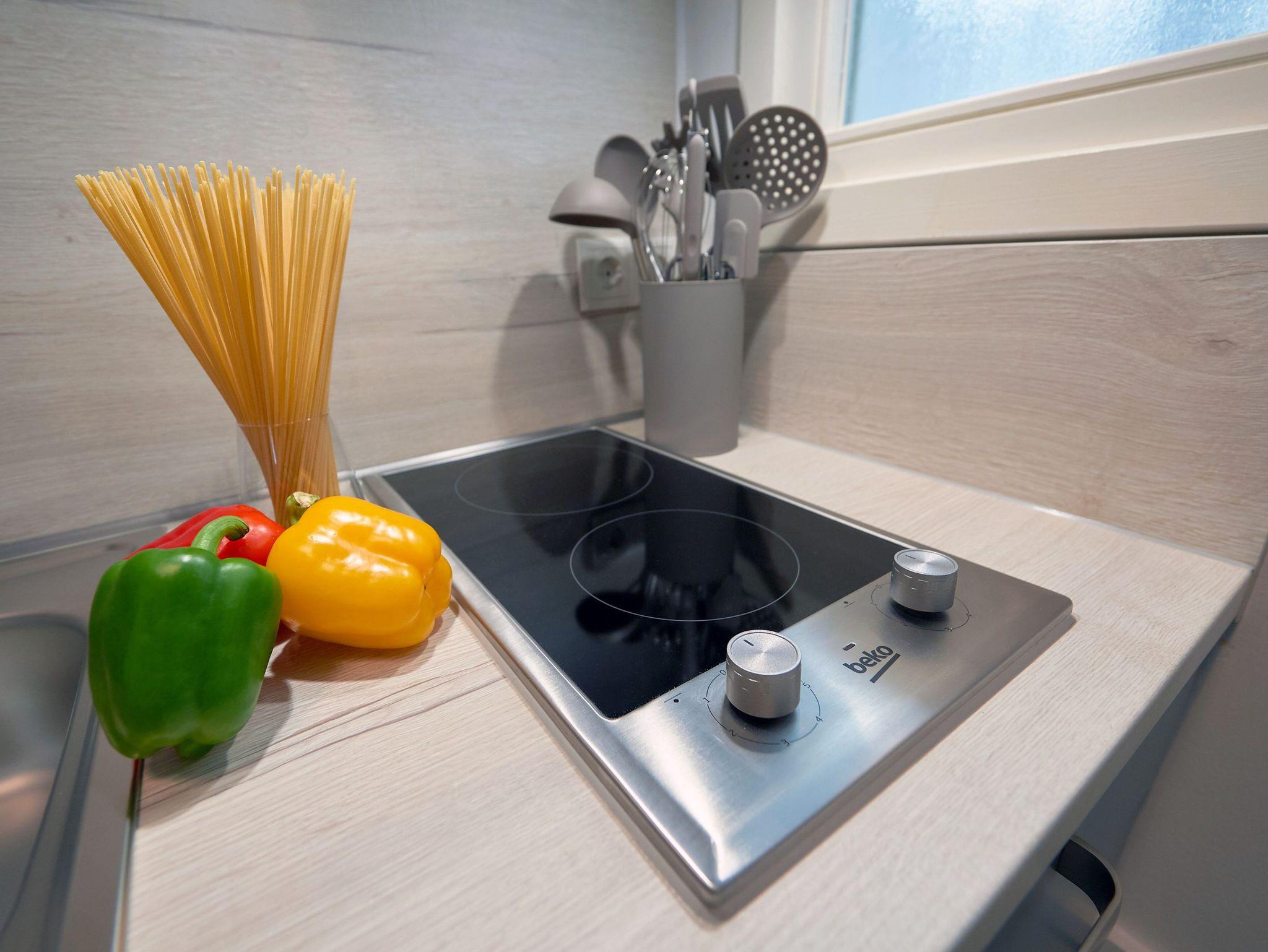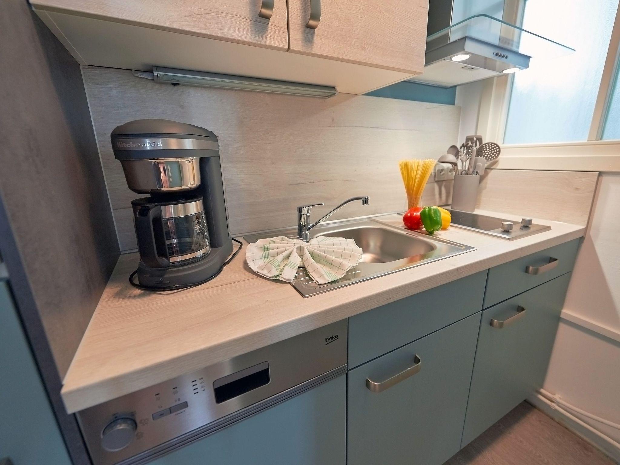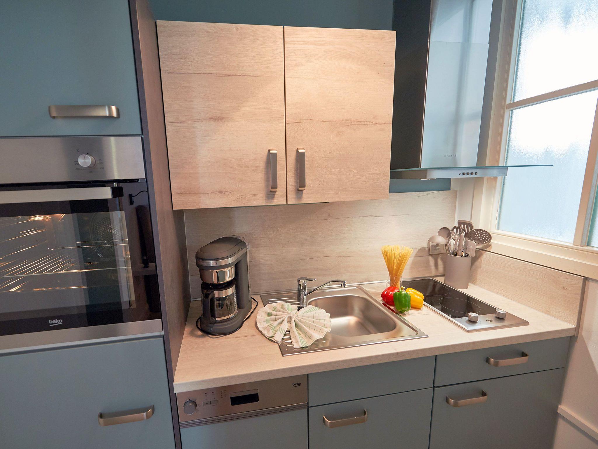 Die Küche gleich nebenan ist mit einer Kaffeemaschine, einem 2-Platten-Herd, einem Geschirrspüler, einem Kühlschrank sowie Mikrowelle, Toaster, Wasser- und Teekocher nebst ausreichend Geschirr und Kleininventar ausgestattet. So können Sie sich bequem selbst bekochen, wenn Sie nicht gerade in einem der wirklich sehr empfehlenswerten Restaurants in der Nachbarschaft speisen möchten. Und nicht zu vergessen: Die frischen Brötchen zum Frühstück gibt´s in der Bäckerei nur rund 350 Meter entfernt.