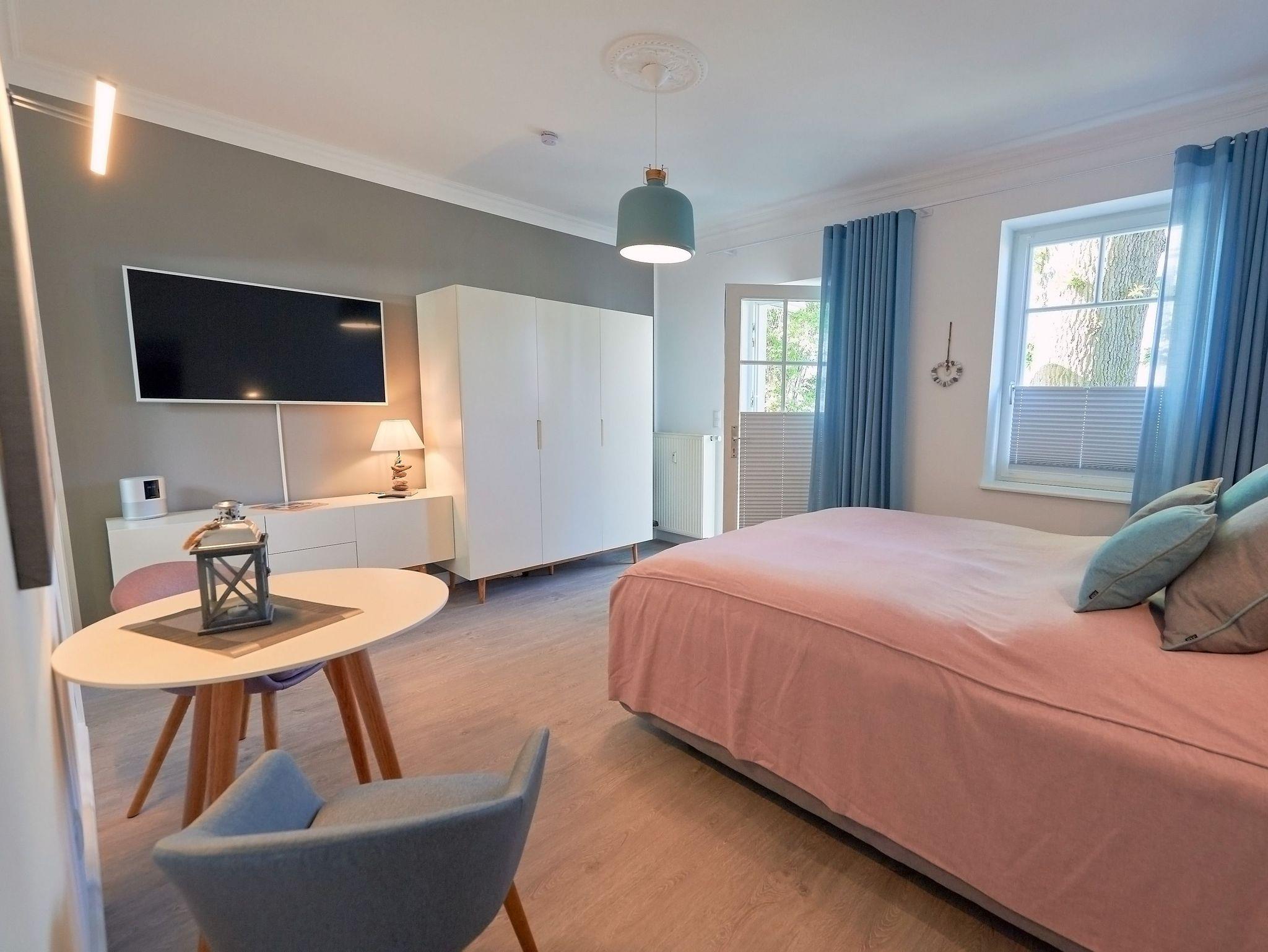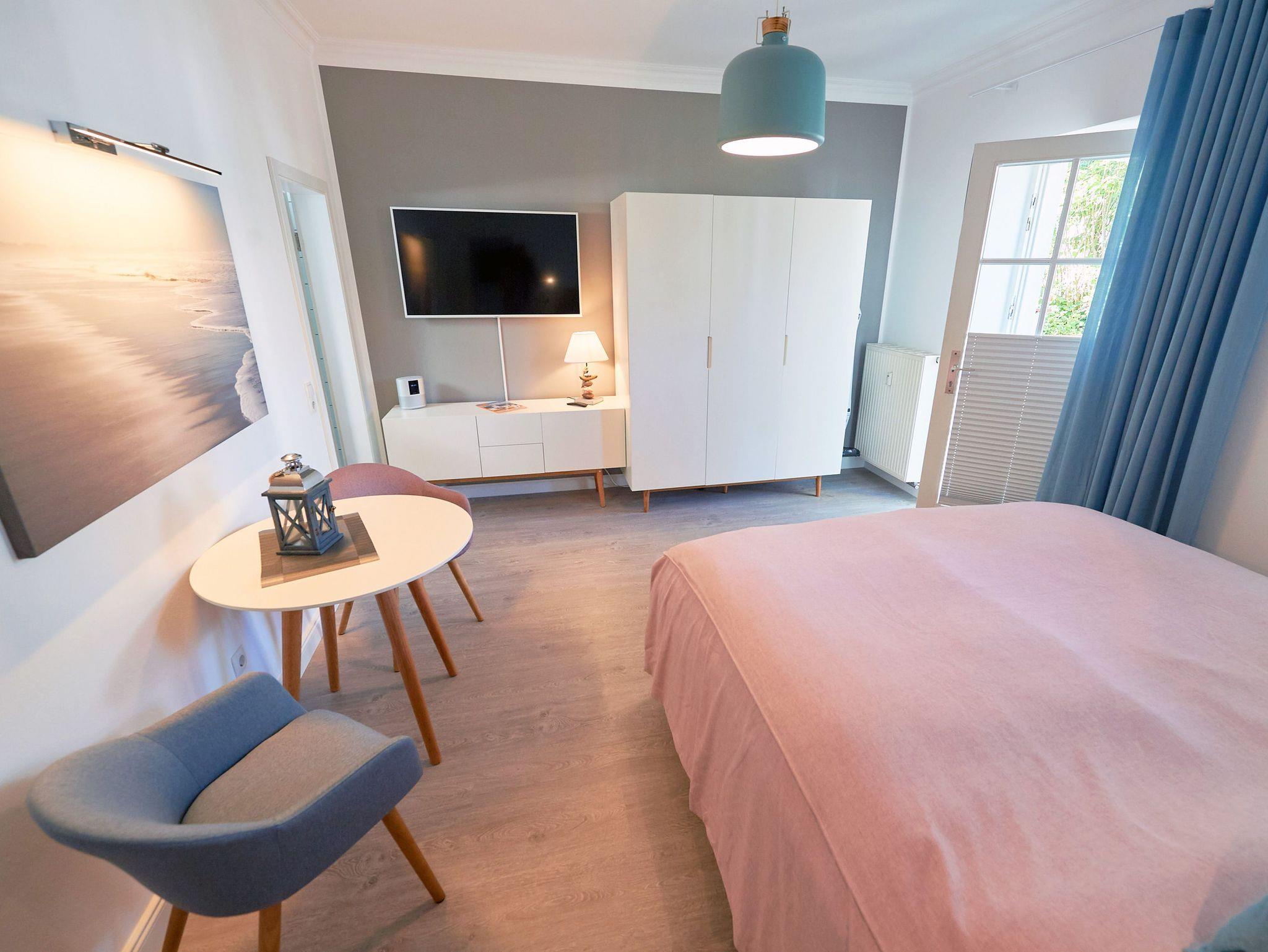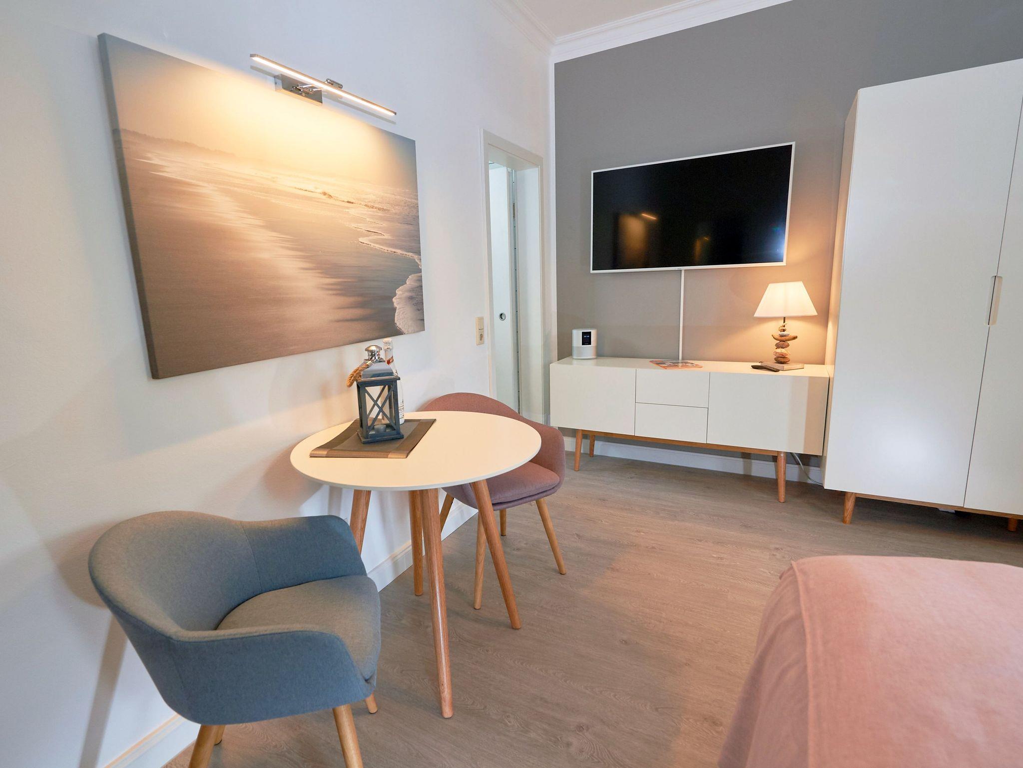 Das kombinierte Wohn- und Schlafzimmer ist in warmen Farbtönen gehalten und verfügt über alles, was man als Alleinreisender oder Pärchen für entspannte Urlaubstage benötigt: ein herrlich bequemes Doppelbett, einen großen Kleiderschrank, einen Tisch mit zwei Stühlen und selbstverständlich auch einen SMART-Fernseher mit Radiokanälen sowie kostenfreies W-LAN. Ihre Lieblingsmusik können Sie bequem auch per Bluetooth über einen BOSE-Speaker abspielen.