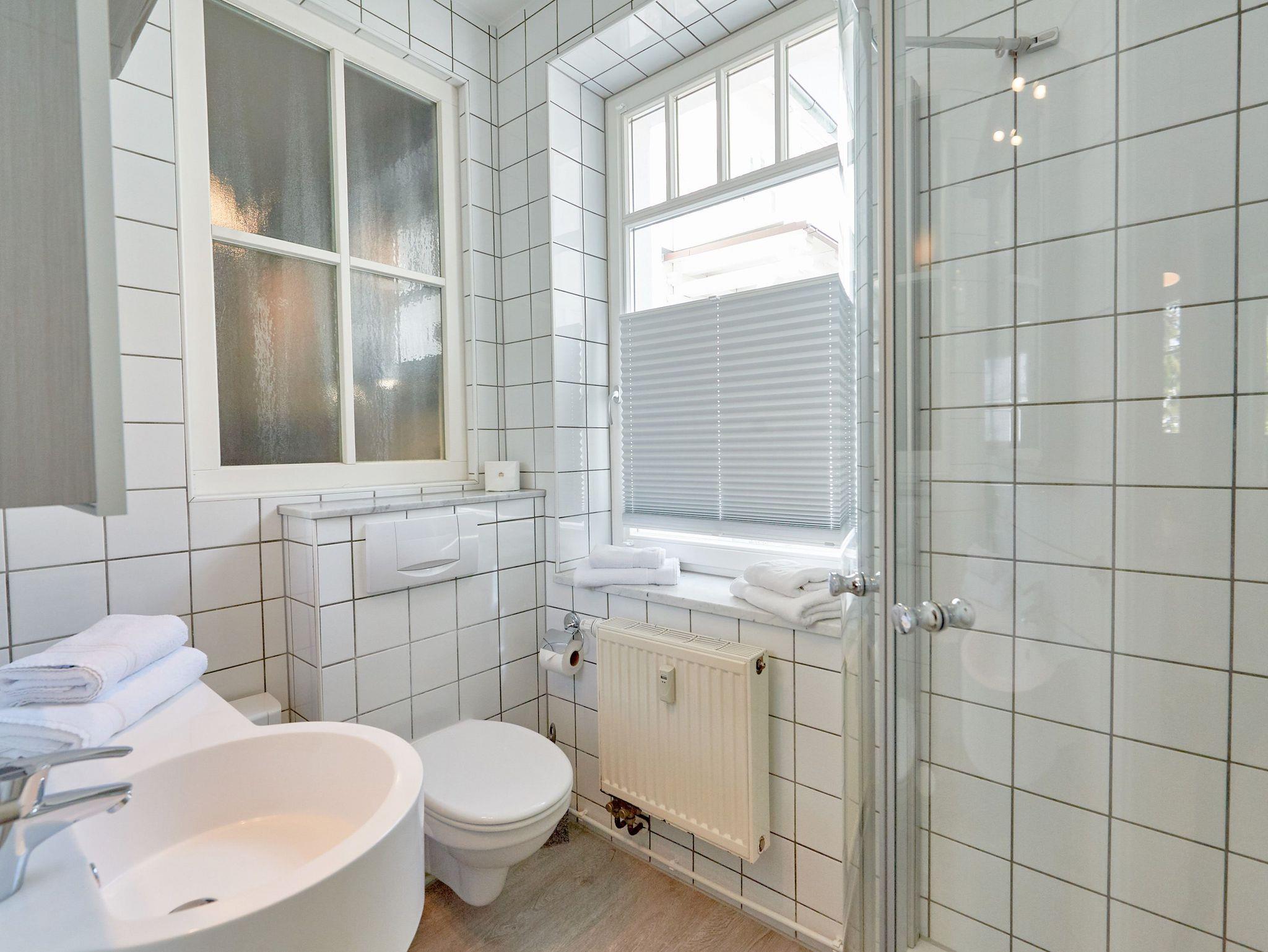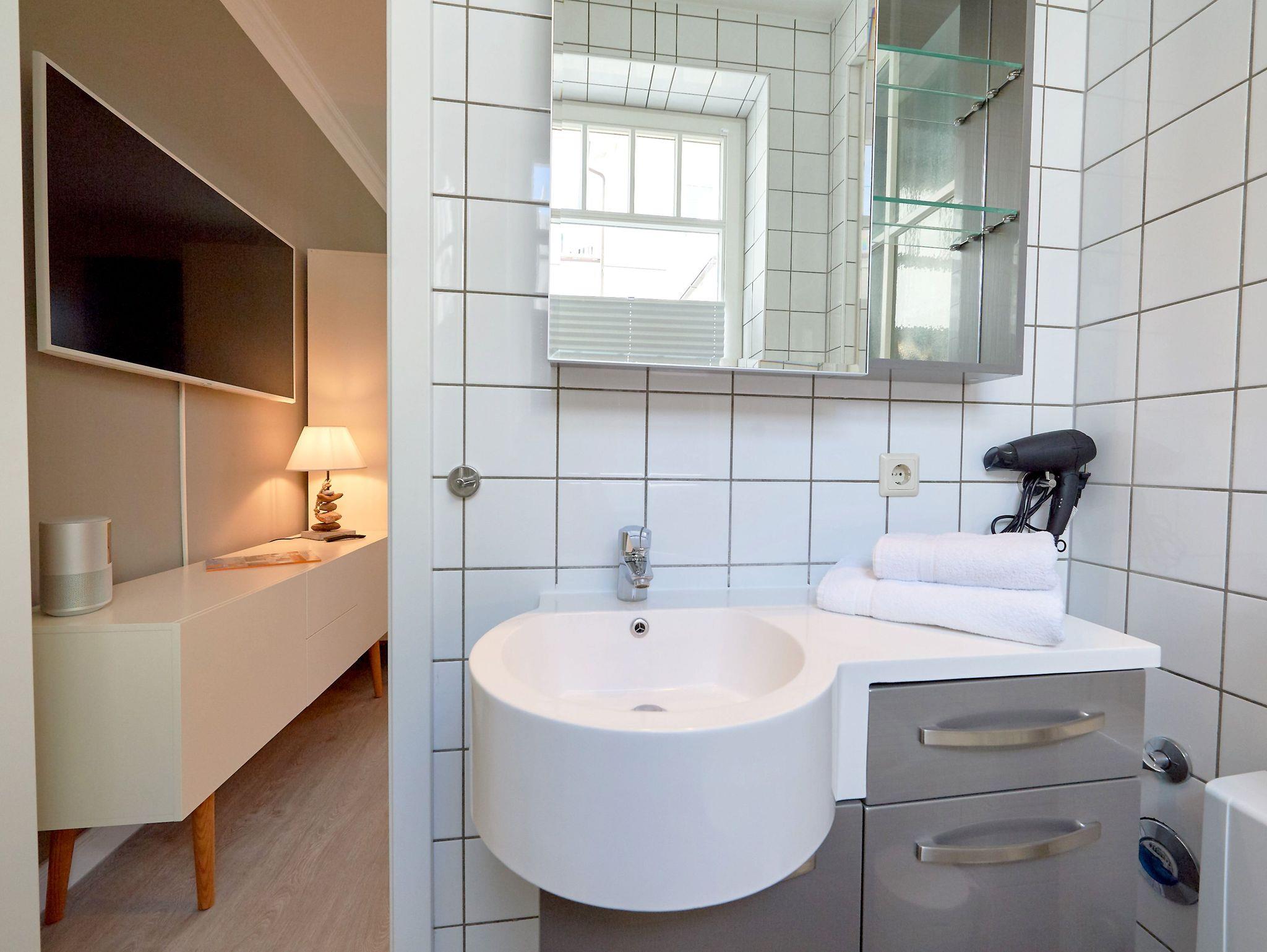 Das hell geflieste Tageslicht-Bad Ihrer Ferienwohnung ist mit einer Falttür vom Wohnraum abgetrennt und verfügt über Dusche/WC sowie einen beleuchteten Waschtisch inklusive Fön.