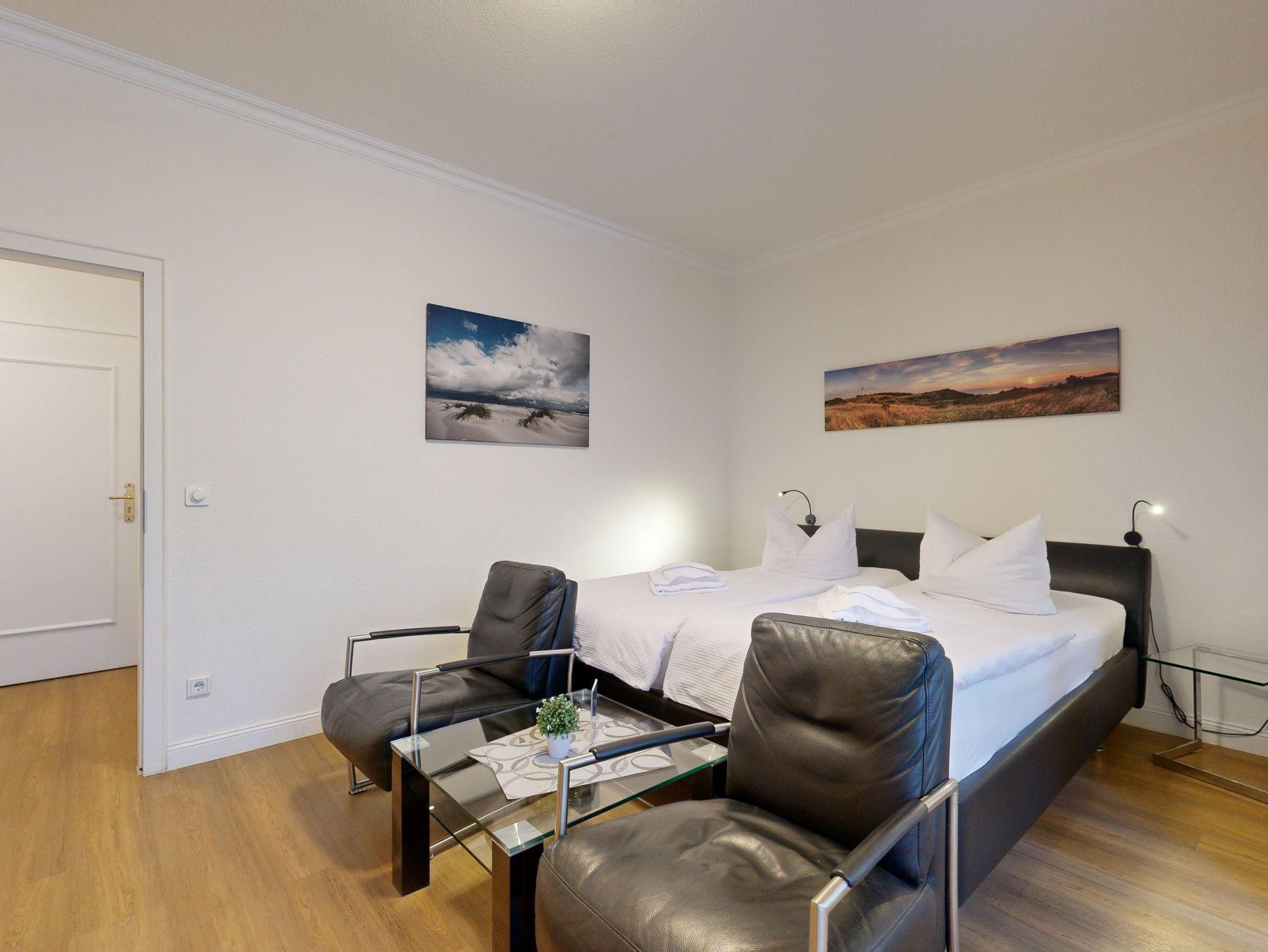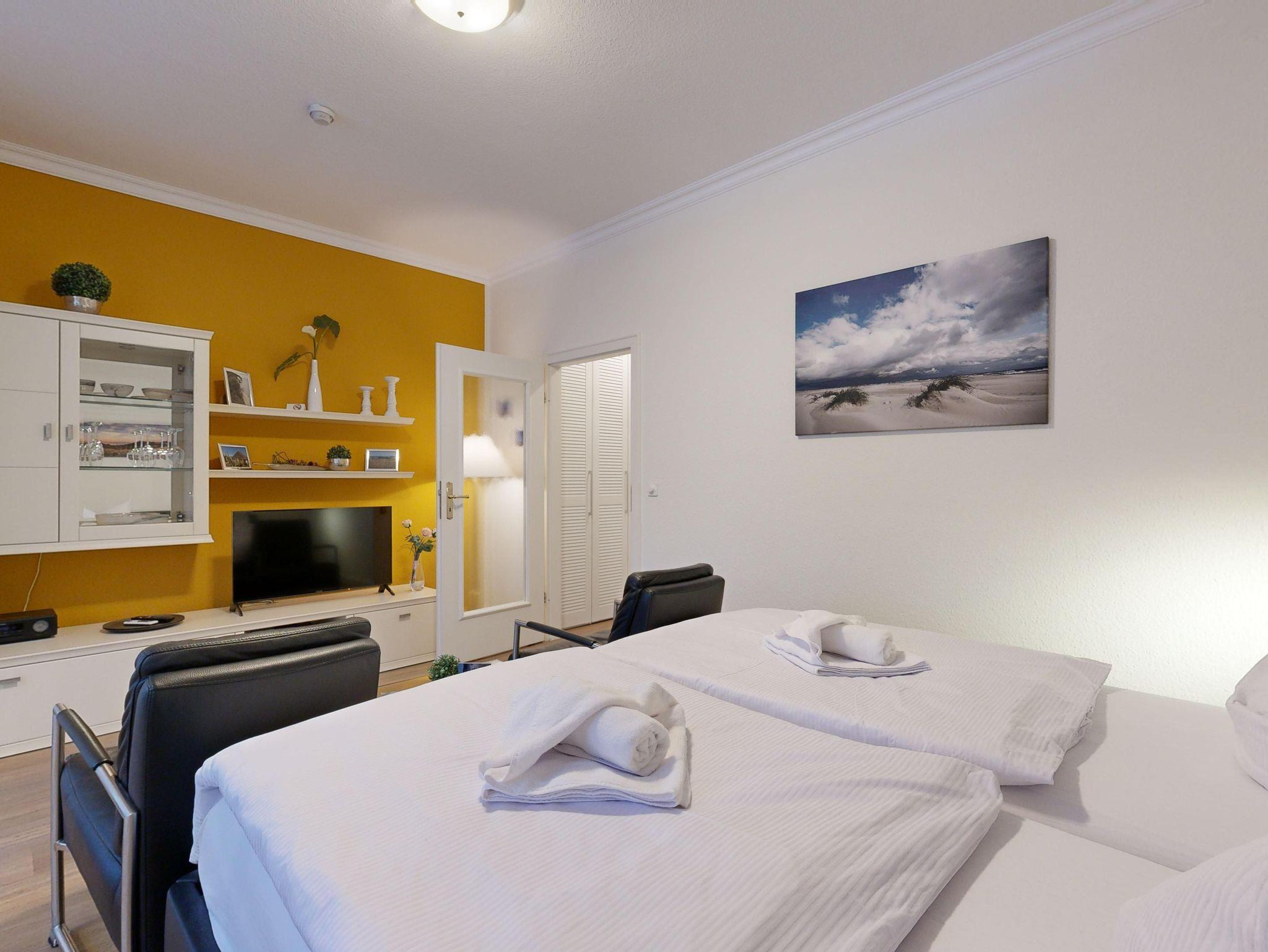 ? Wohn-/Schlafraum: Doppelbett mit hochwertigen Federkernbetten, zwei gemütliche Sessel, Kabel-TV (Flachbild), Radio mit CD (Bluetoothfähig) + Blueray- Player
