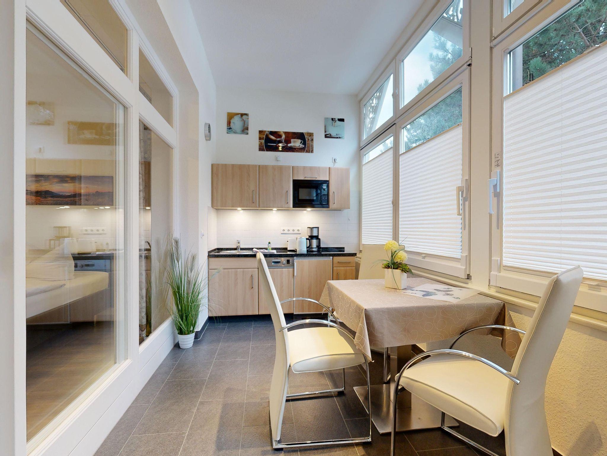 ? Veranda: Essplatz, große Fensterfront, Küchenzeile mit Spülmaschine, Cerankochfeld mit 2 Platten, Mikrowelle, Toaster, Kaffeemaschine, Eierkocher, Wasserkocher