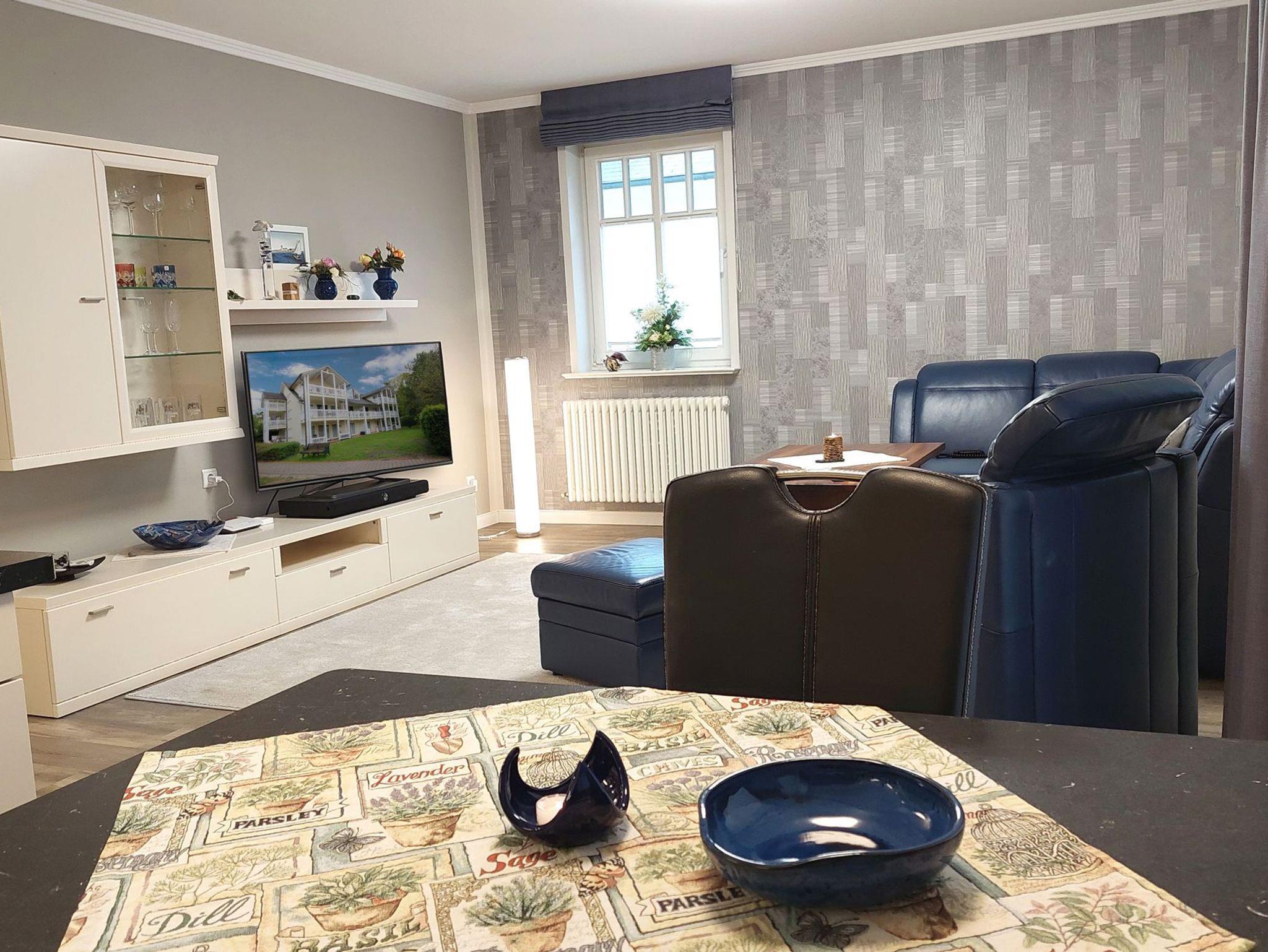 Im großzügigem und hellen Wohnbereich befindet Sie eine gemütliche Sitzlandschaft mit Smart-TV samt Soundbar.