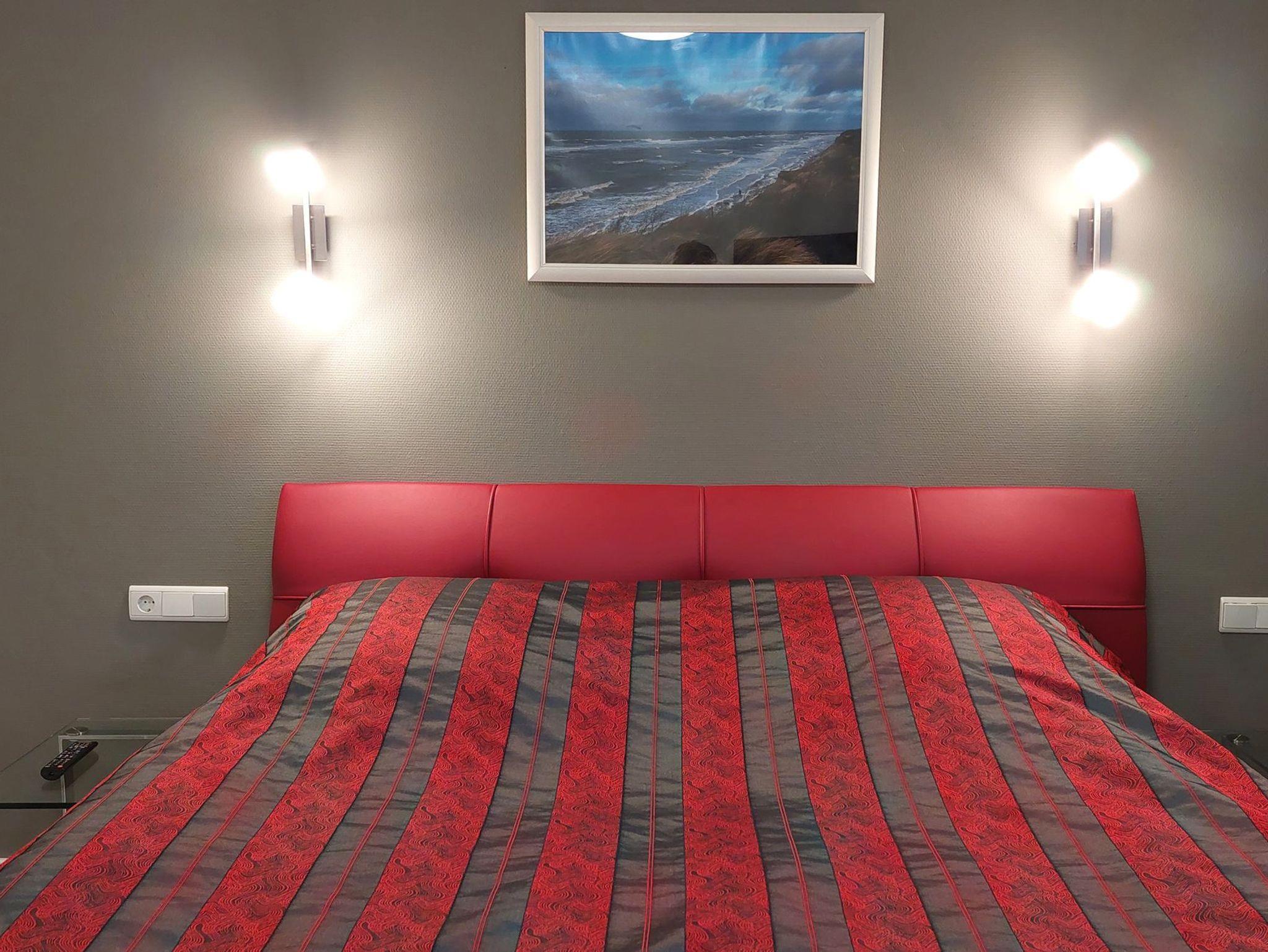 Das Schlafzimmer verfügt über ein Doppelbett mit Nachttischen sowie einen Smart-TV.