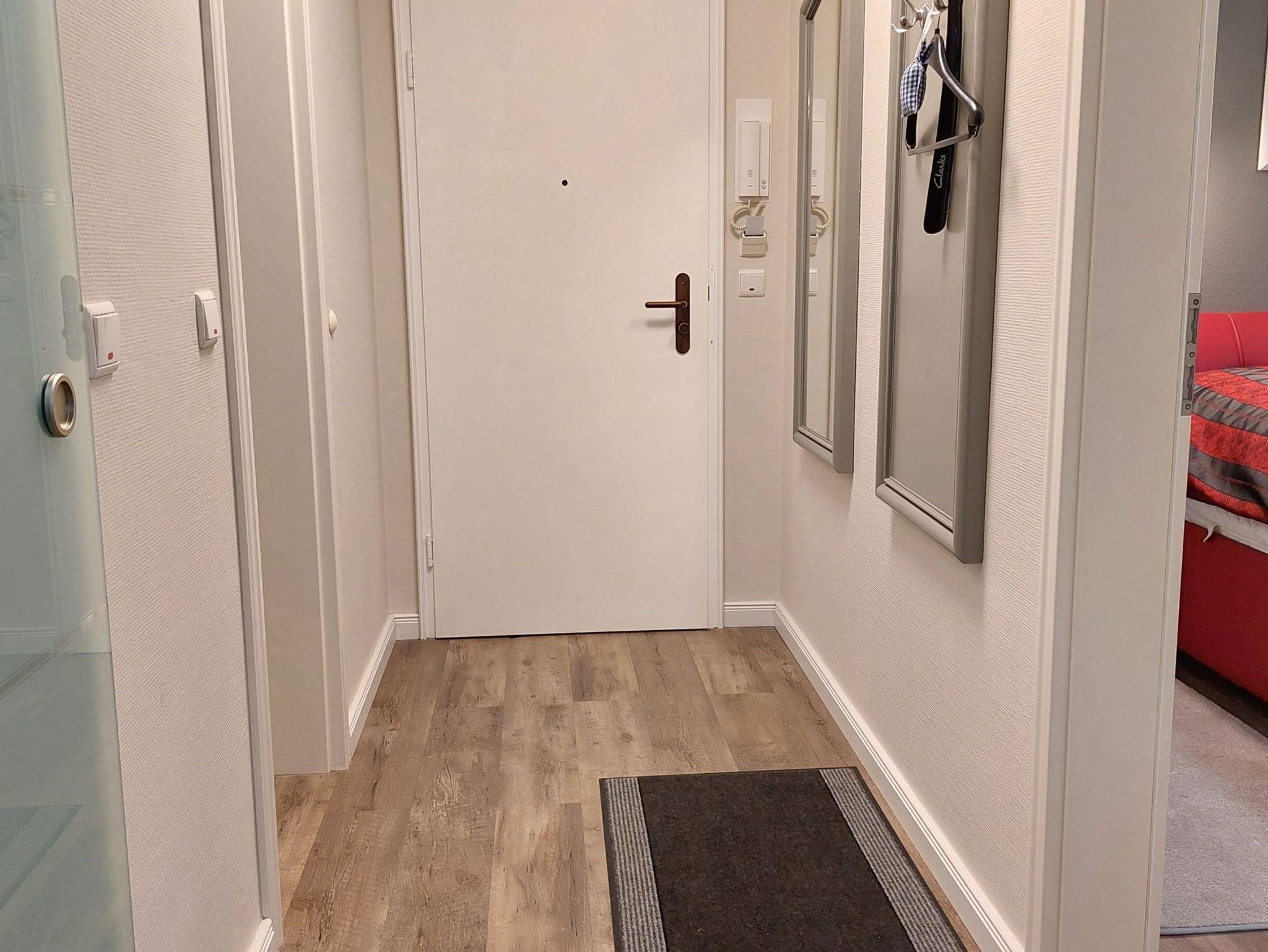 Der Flurbereich mit Garderobe bietet Zugang zu Bad, Schlafzimmer, Ankleidezimmer und Wohnbereich.