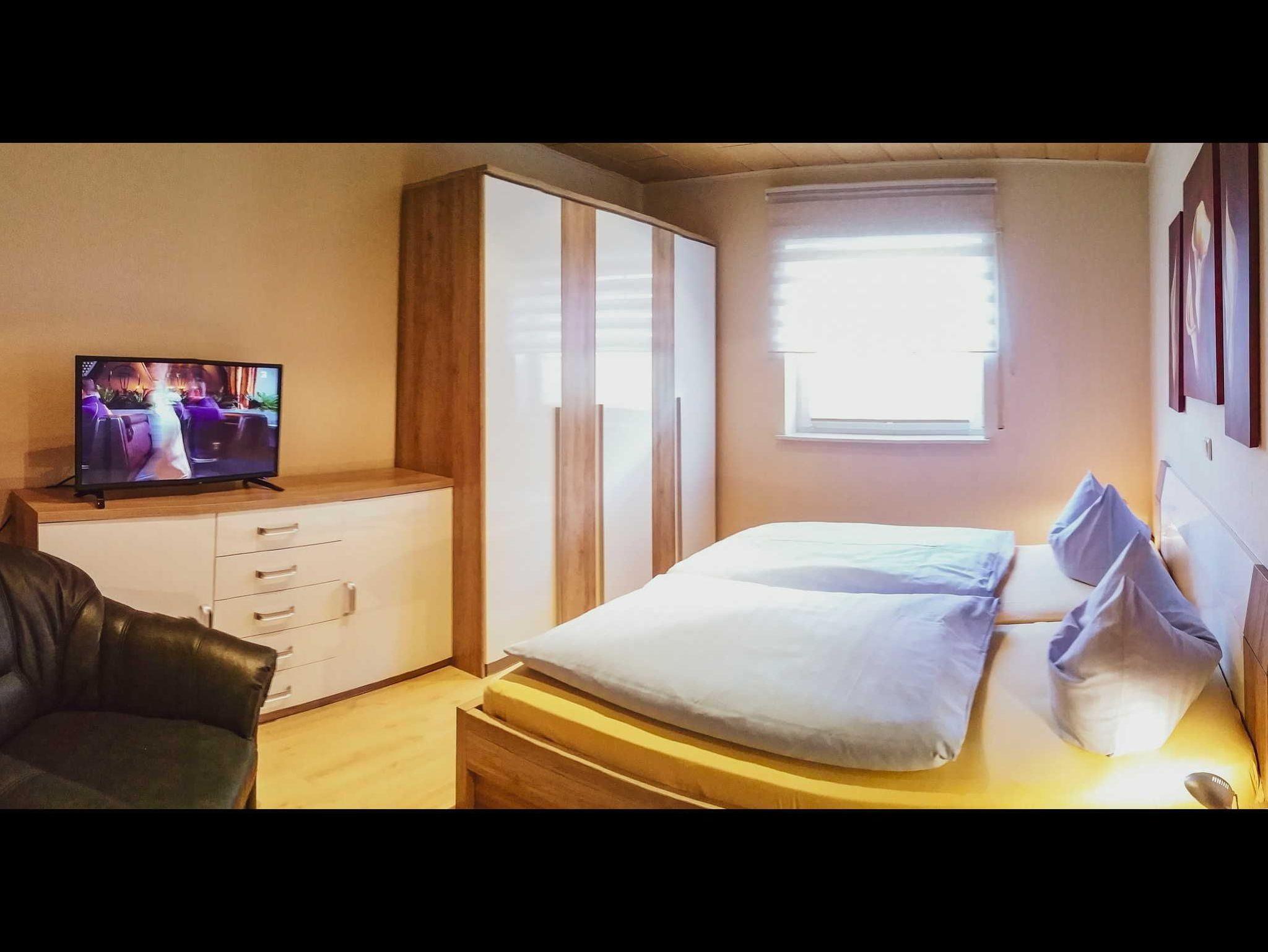 Doppelbett, Kleiderschrank, eine Kommode sowie ein zusätzlicher Flachbild-TV.