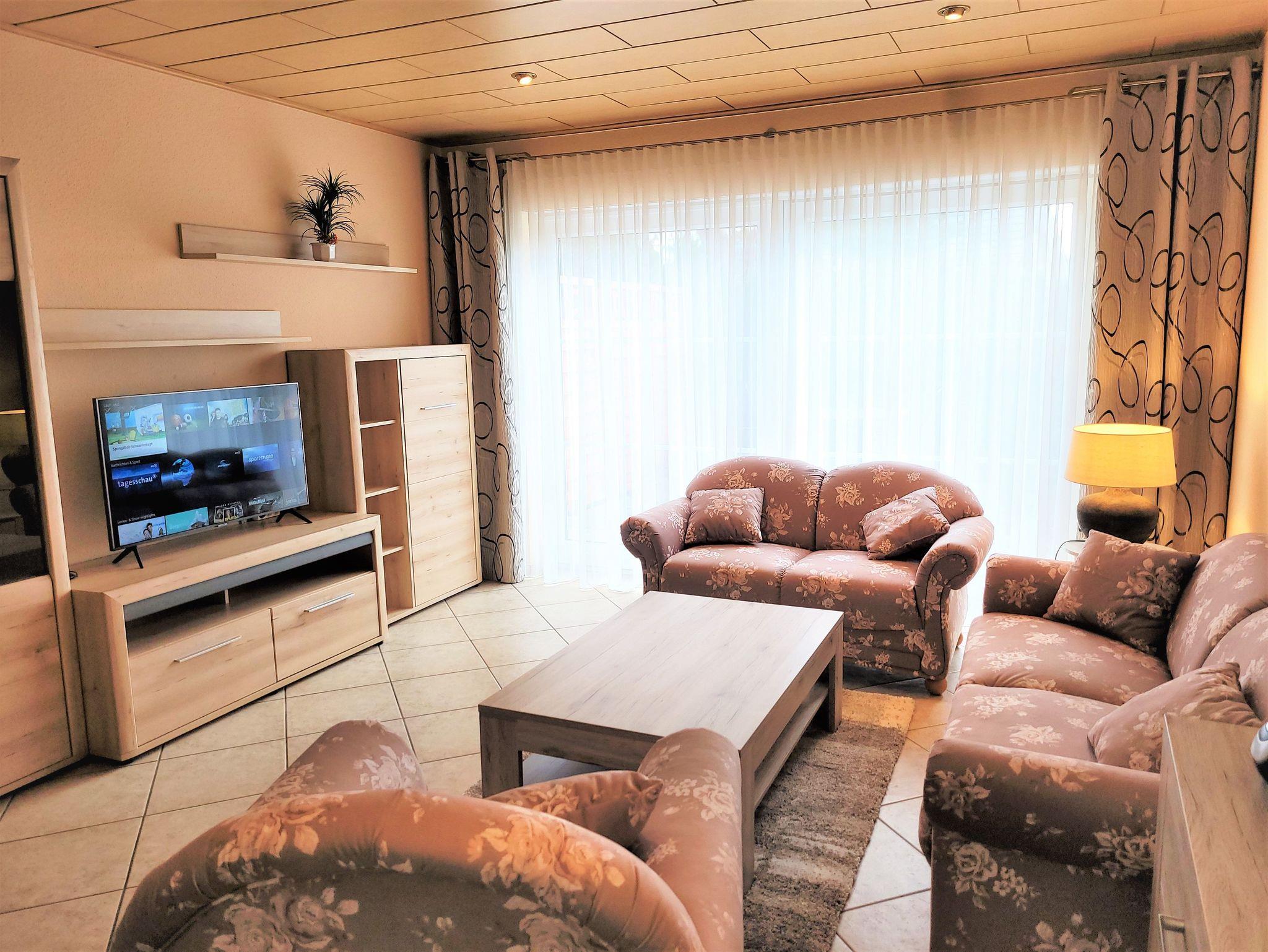 Die gemütliche 2-Raumwohnung Nr. 13 befindet sich im Erdgeschoss des Hauses mit möblierter Terrasse und einem eigenen Garten zur Nutzung. Beim Betreten der Nichtraucherwohnung gelangen Sie in einen Flur mit kompletter Garderobe und großem Wandspiegel. Von hier aus erreichen Sie den Wohnbereich mit Zugang zur Südterrasse, das Schlafzimmer, das Tageslichtbad sowie die separate Küche mit zusätzlichem Abstellraum. Das Wohnzimmer ist mit einer Sitzecke, einem komfortablen Schrankbett, welches die Schlafmöglichkeit für 2 weitere Personen bietet, Smart Flachbild-TV, WLAN und Radio ausgestattet. Im Schlafbereich befindet sich ein Doppelbett, Kleiderschrank, eine Kommode sowie ein zusätzlicher Flachbild-TV. In der separaten Küche mit komplett ausgestatteter Küchenzeile u.a. mit Geschirrspüler, Backofen, Cerankochfeld, Kühlschrank mit Gefrierschrank und weiteren Küchenhelfern befindet sich der Essbereich, welcher ausreichend Platz für 4 Personen für das gemeinsame Essen bietet. Das Tageslichtbad begrüßt Sie mit einer Badewanne, Dusche, WC und Waschtisch. Ein eigener Parkplatz steht Ihnen direkt am Haus zur Verfügung.