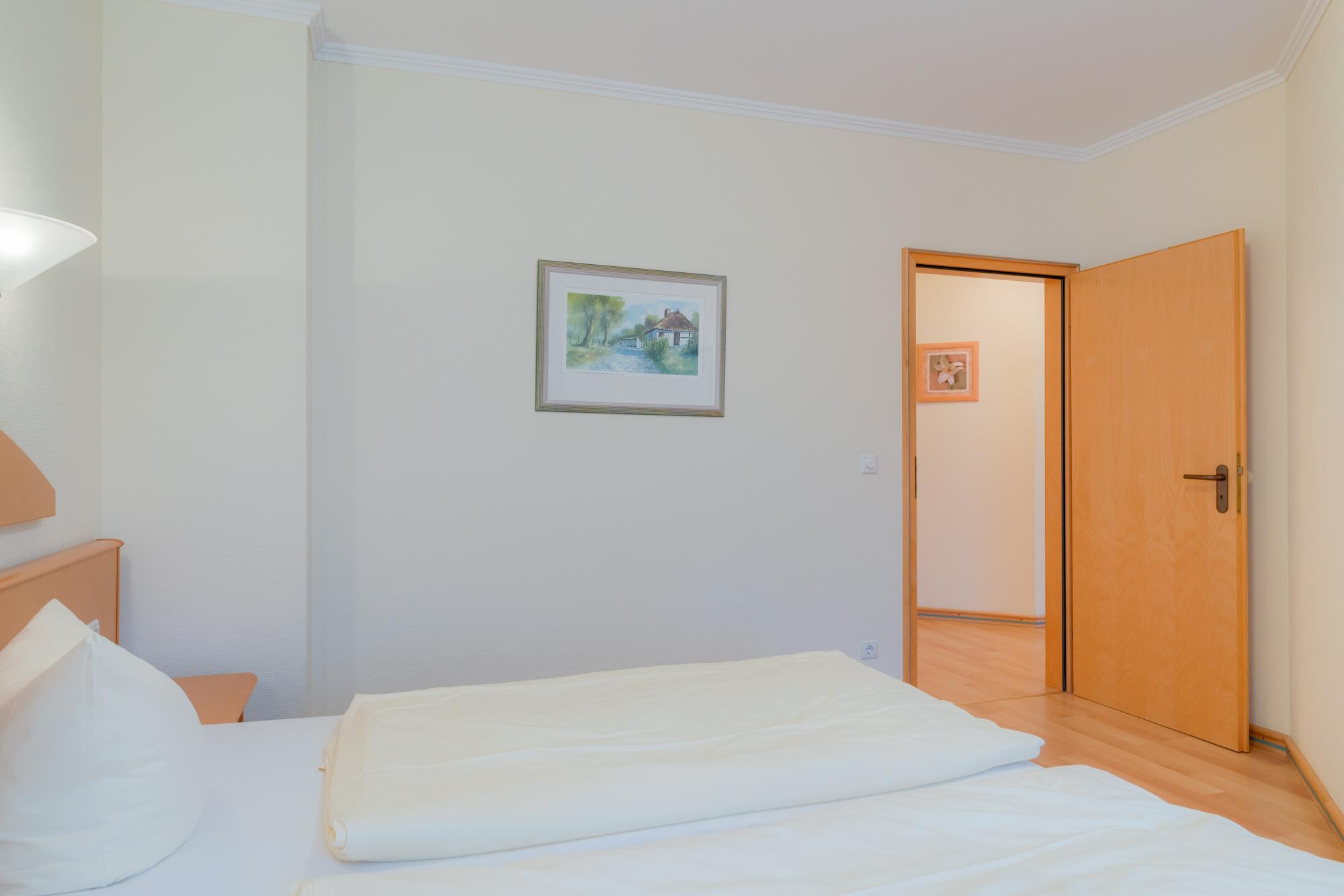 Im Schlafzimmer bietet Ihnen ein Doppelbett genügend Platz für einen erholsamen Schlaf. Ihre Urlaubskleidung können Sie im geräumigen Schrankraum unterbringen.