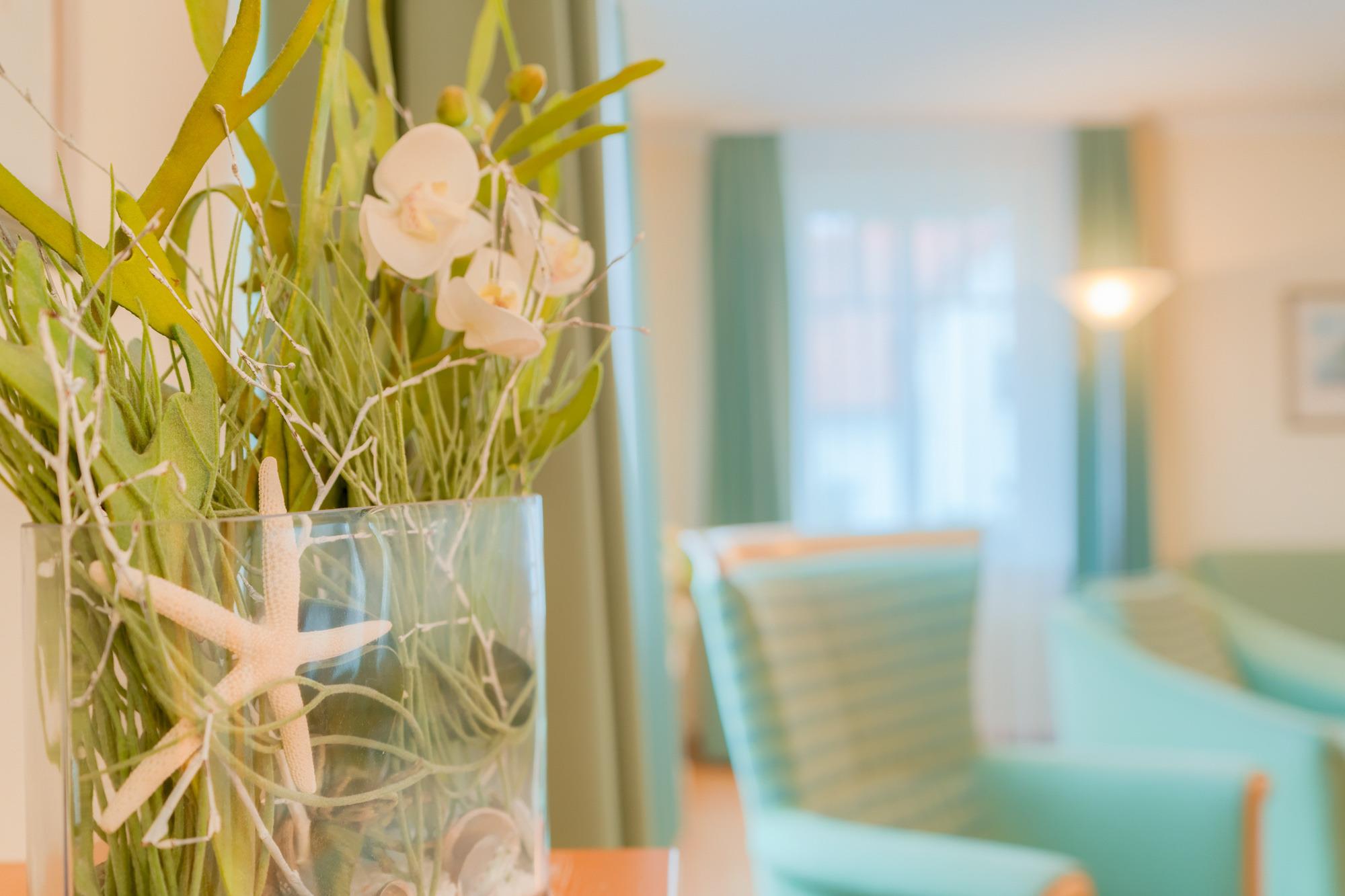 Lassen Sie den Abend nach einem erlebnisreichen Tag gemütlich auf einem der zwei Balkone ausklingen und genießen Sie den seitlichen Blick auf das Meer oder auf die Parkanlage der Villen.