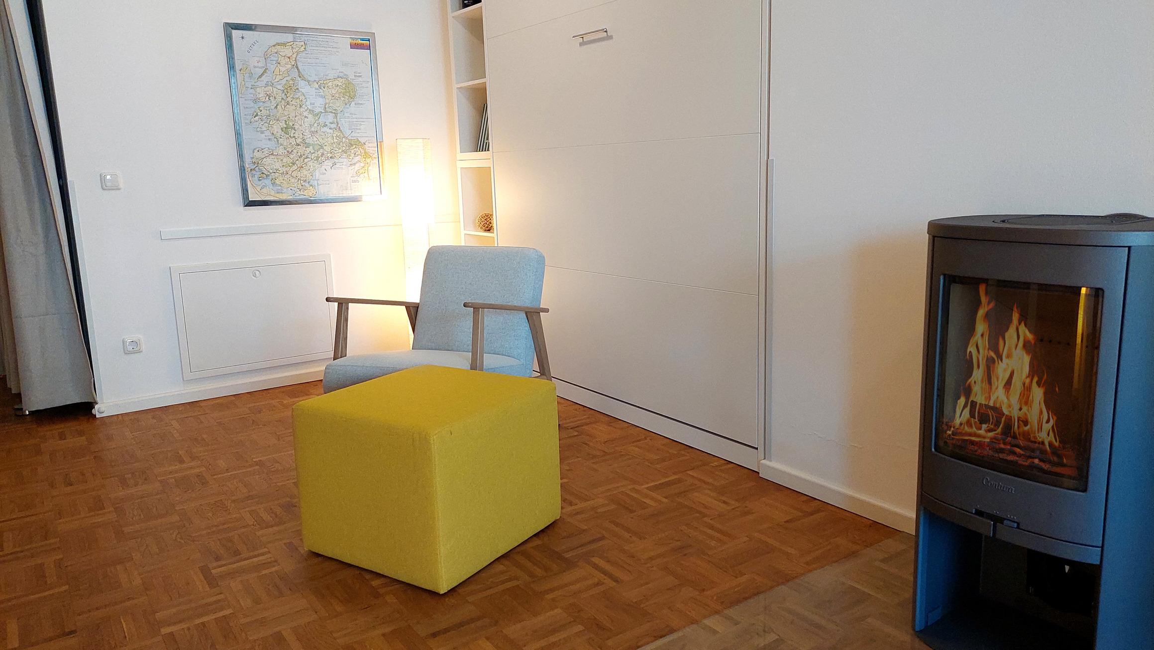 Im Wohnbereich befindet sich ein gemütlichen Sofa. Zusätzlich sorgen Flachbild-TV. Stereoanlage und Kamin auch in der kalten Jahreszeit für einen tollen Urlaub.