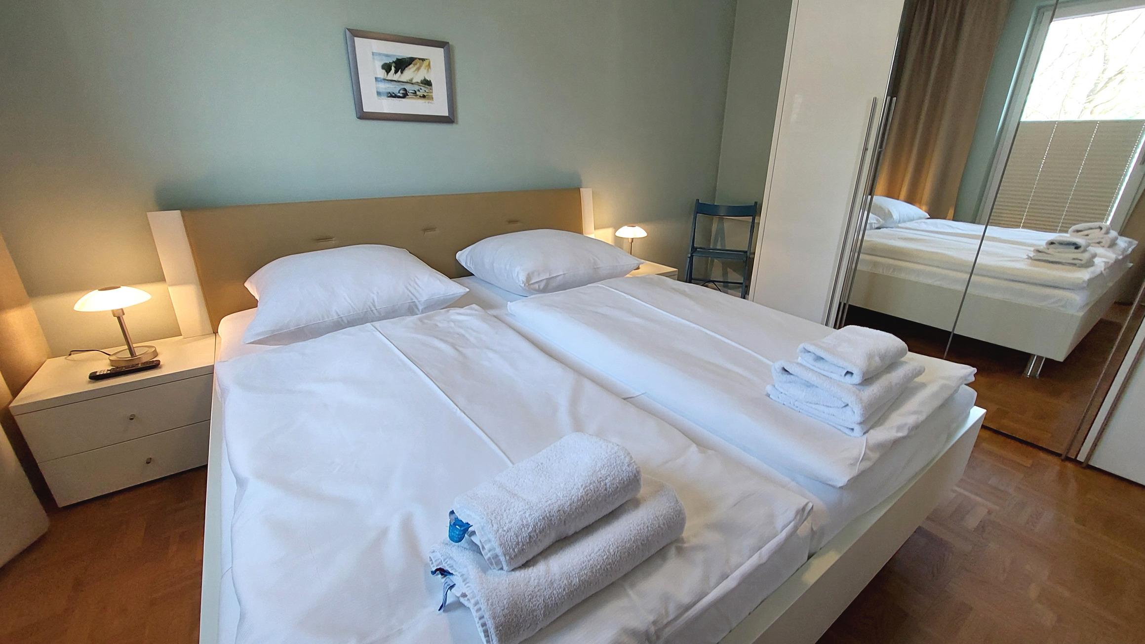 Die Unterkunft umfasst zirka 65 qm, bietet Platz für bis zu 4 Personen und ist von Tiefgarage und Erdgeschoss bequem per Fahrstuhl erreichbar.