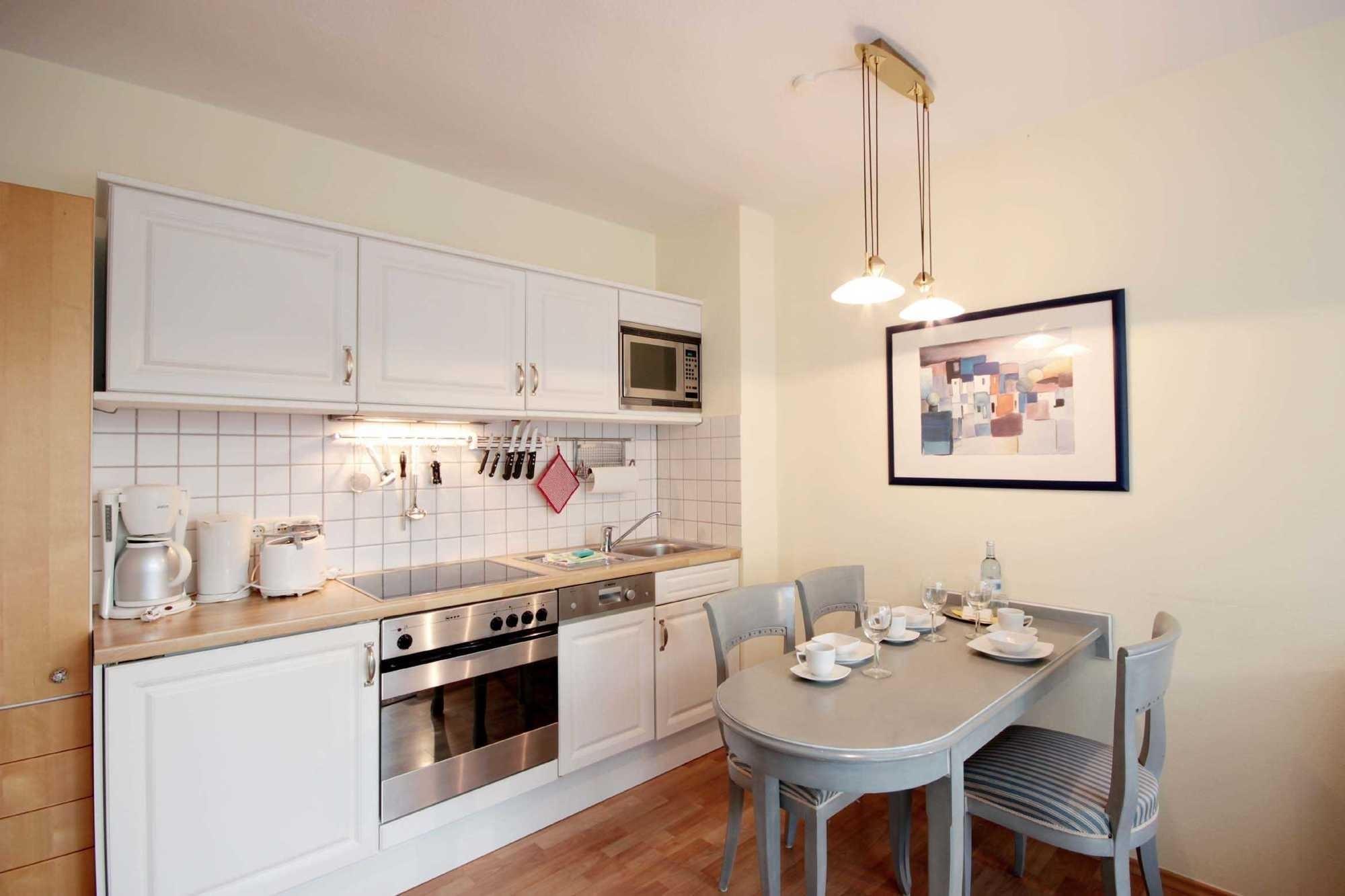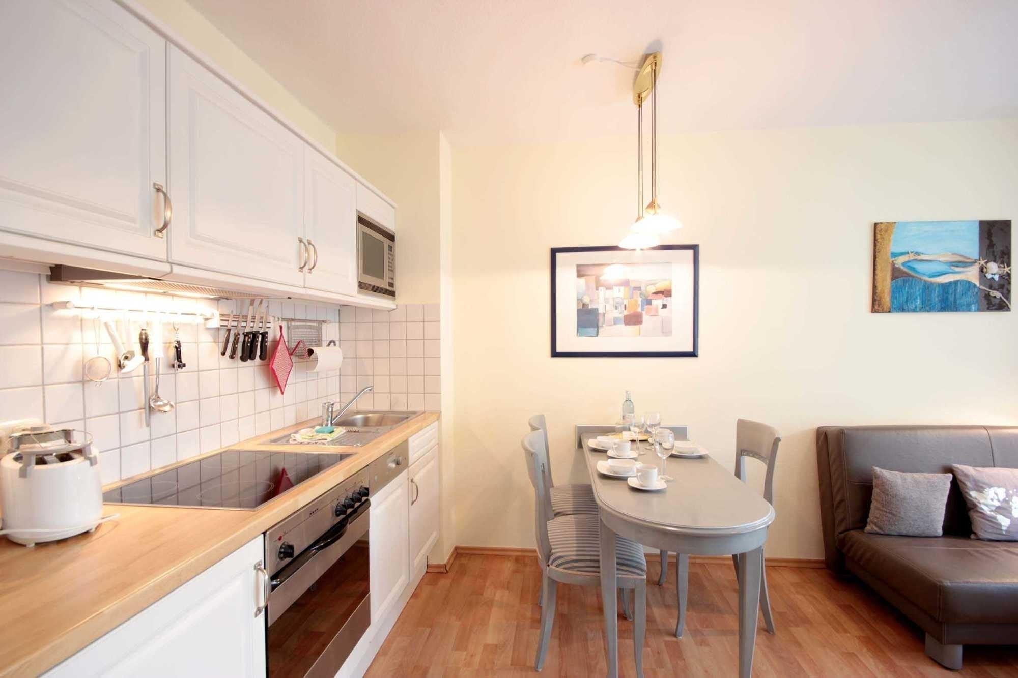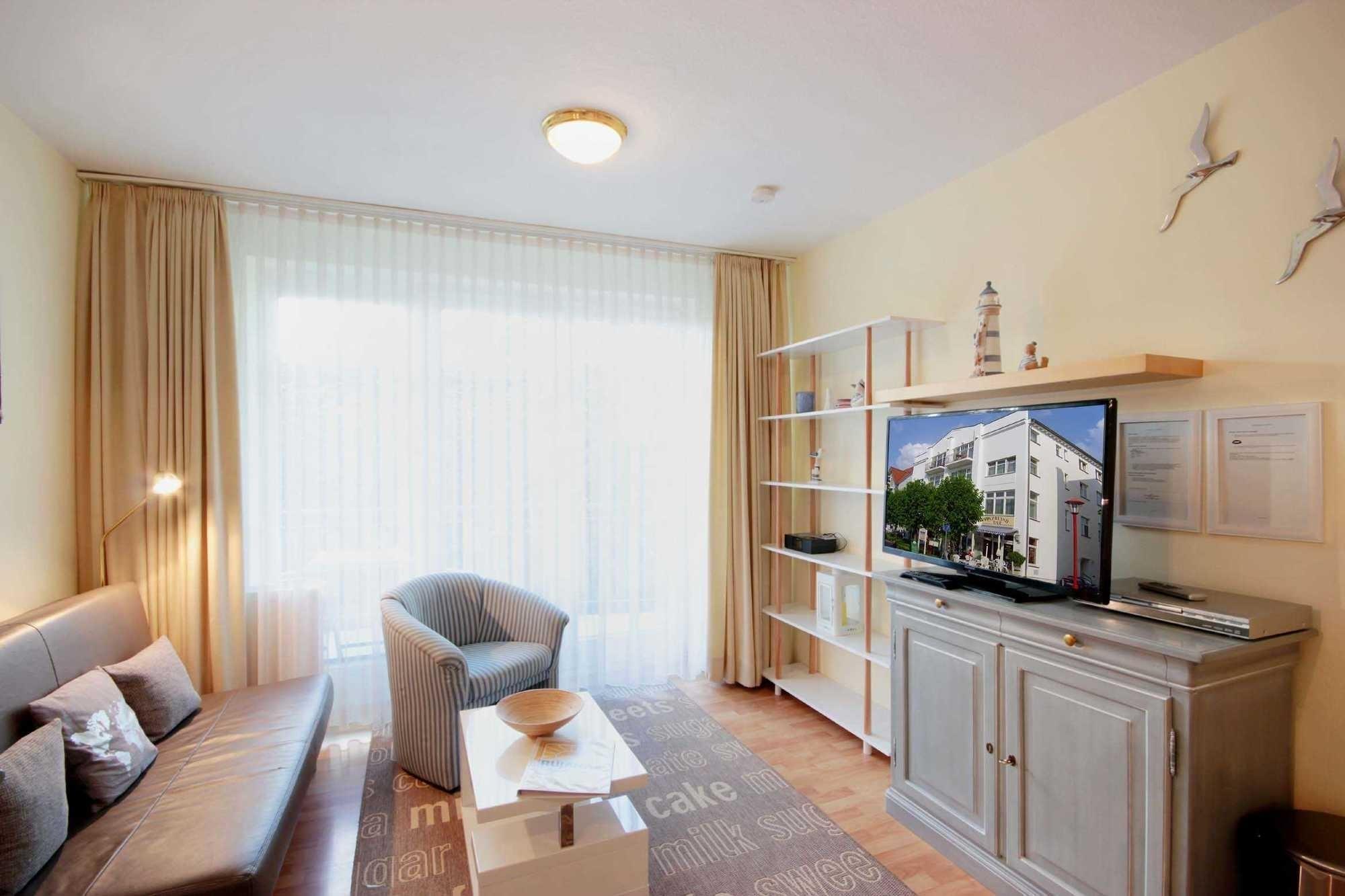 Ihre 2-Zimmer Ferienwohnung 23RB3 befindet sich im Hochparterre, ist ca. 37 qm groß und für 3 Personen gut geeignet. Neben dem Wohnraum mit Schlafsofa, Flachbild-TV, einem nach Norden ausgerichteten Balkon und einer integrierten komplett ausgestatteten Küche mit Geschirrspüler, Backofen, Mikrowelle, Wasserkocher, Toaster und Kaffeemaschine gehört auch ein Schlafzimmer mit Doppelbett und Kleiderschrank sowie ein Badezimmer mit Waschtisch, Dusche und WC zu Ihrer Ferienwohnung. Für die Kleinen steht ein Kinderbettchen und ein Kinderhochstuhl bereit. Ein kostenfreier WLan-Zugang steht Ihnen ebenfalls zur Verfügung. Ein PKW-Stellplatz steht Ihnen auf dem Parkplatz \"Zentrum\" (ca. 400 m vom Objekt entfernt) zur Verfügung.