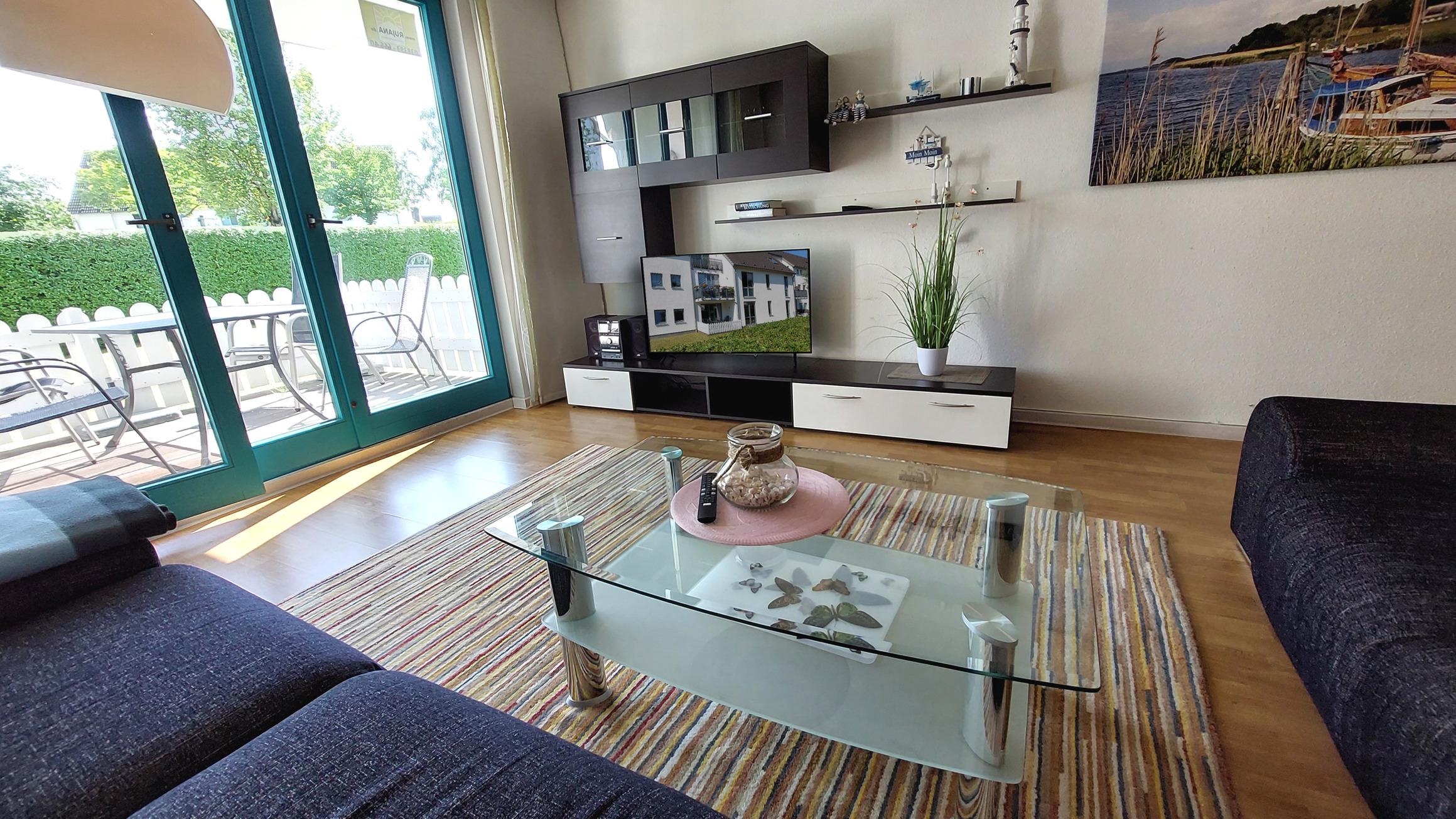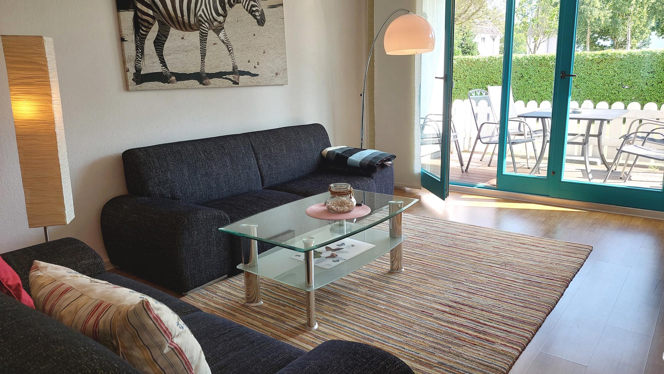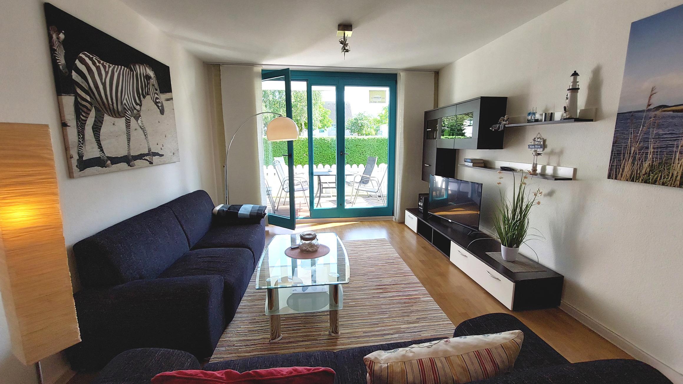 Die Wohnung verfügt über einen separaten Eingang von dem Sie in den vorgelagerten Flur gelangen. Im Wohnbereich mit angrenzendem Essbereich erwartet Sie eine gemütliche Sitzgruppe und gelangen von hier auf die möblierte Terrasse. Die technische Einrichtung umfasst einen Flachbildfernseher, DVD-Player, Musikanlage sowie einen kostenfreien W-LAN-Zugang. Im separaten Küchenbereich finden Sie eine komplette Küchenzeile mit zusätzlicher Sitzmöglichkeit sowie Backofen, Cerankochfeld, Mikrowelle, Geschirrspüler, Kaffeemaschine, Wasserkocher, Toaster und weitere Küchenhelfer vor. Das Hauptschlafzimmer verfügt über ein Doppelbett mit hochwertigen Matratzen sowie über einen Kleiderschrank. Im zweiten Schlafbereich finden Sie zwei Einzelbetten sowie eine kombinierte Anbauwand mit Kleiderschrank vor. Für die kleinen Gäste stehen ein Kinderreisebett mit Extra-Kindermatratze, ein mobiler Wickeltisch, eine Baby-Badewanne, Kindertritt für das Waschbecken sowie 2 Marken-Kinderhochstühle bereit. Das Bad ist ausgestattet mit einer Badewanne, Waschbecken [&] WC. Zusätzlich bietet Ihnen diese Wohnung eine Münzwaschmaschine. Ein Pkw-Stellplatz befindet sich am Haus. Ihre Fahrräder können Sie in dafür vorgesehene Räume direkt am Haus unterstellen.