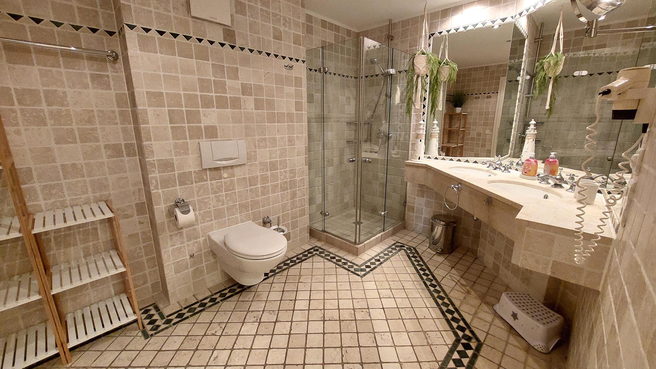 Das Badezimmer mit Antikmamor verfügt über einen Doppelwaschtisch, Dusche, Kosmetikspiegel, Haartrockner und WC.