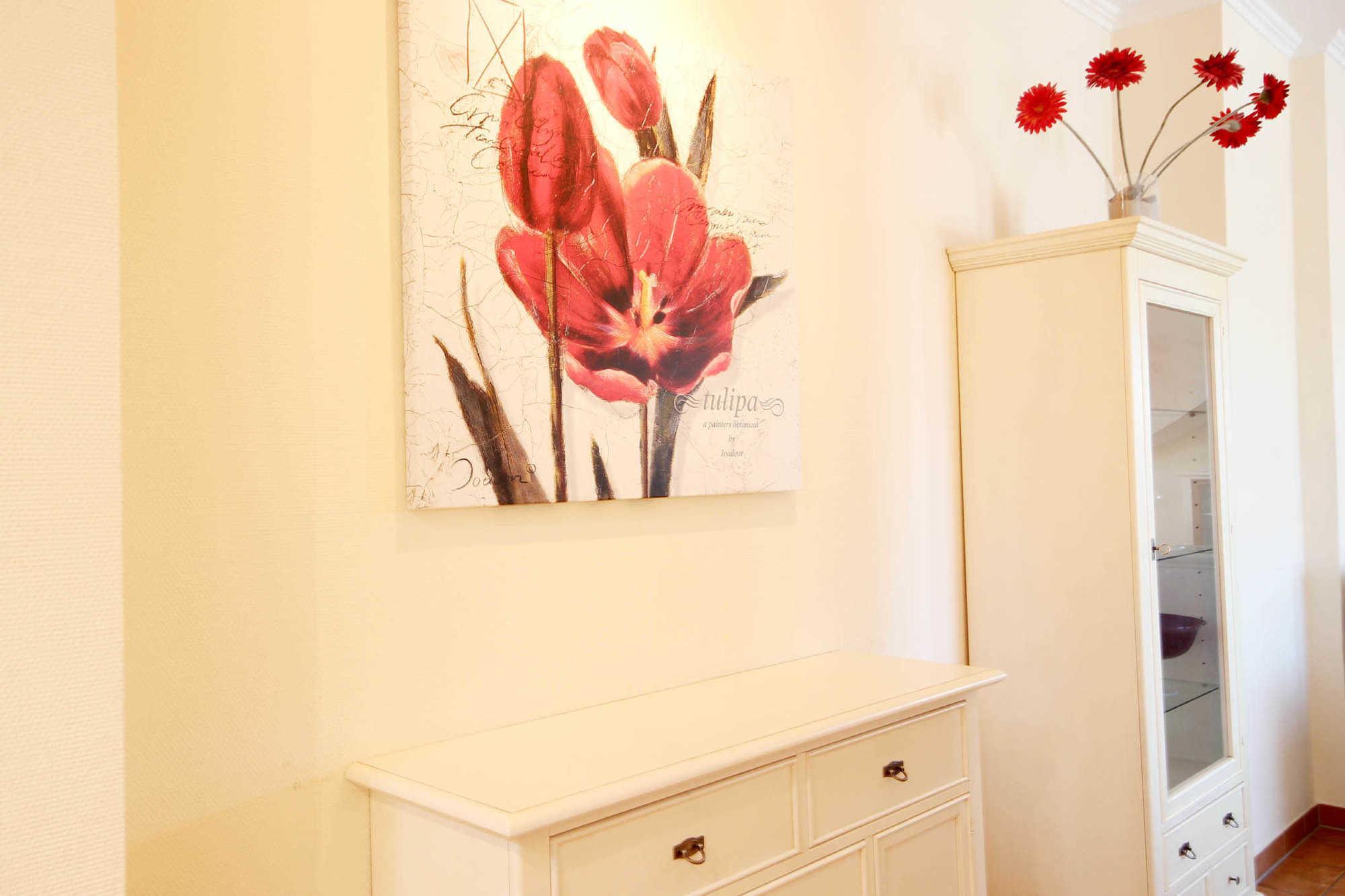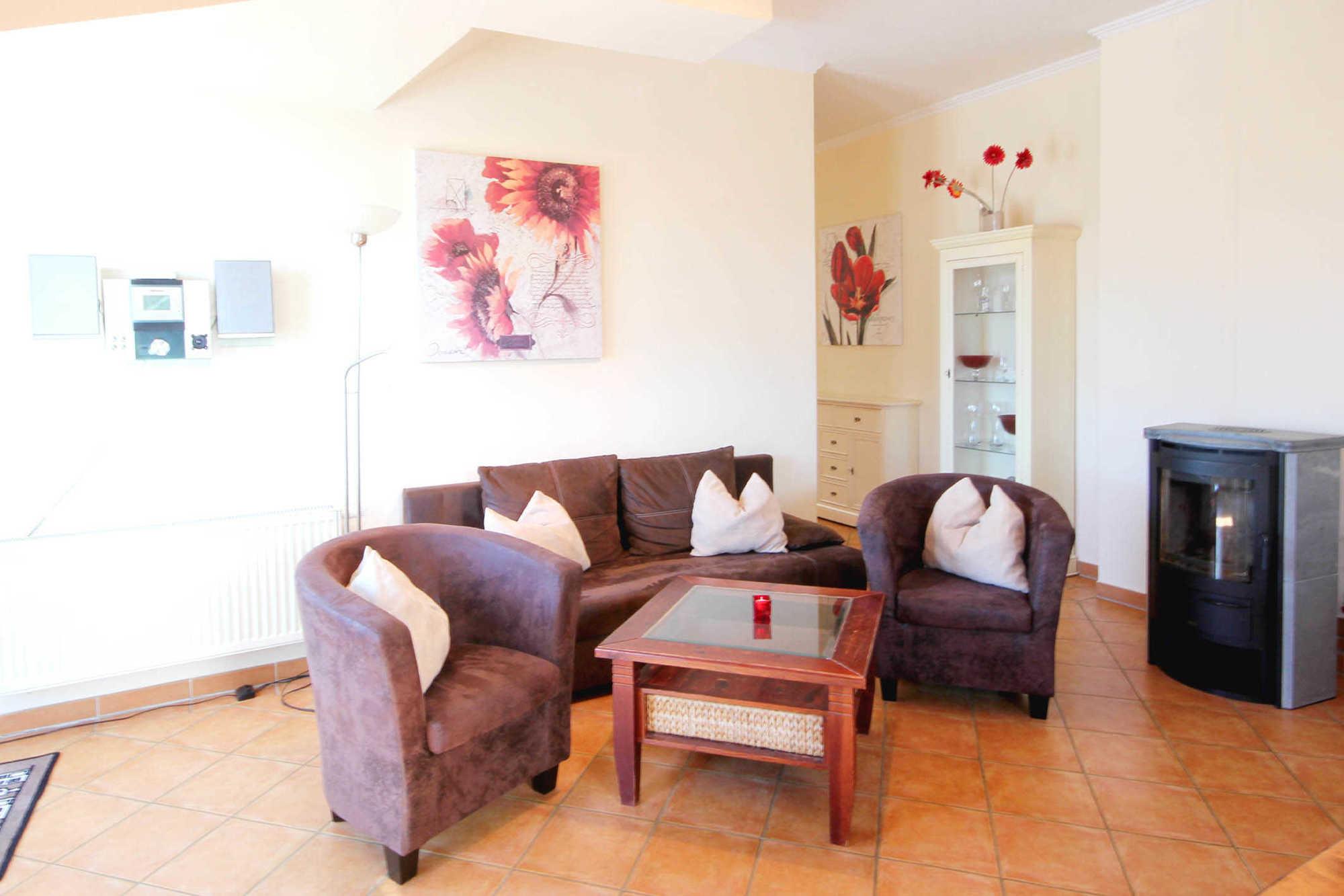 Neben dem Wohnraum mit integrierter Küche gibt es zwei separate Schlafräume, ein Badezimmer mit Waschtisch, Dusche und WC und eine separate Gästetoilette. In den Schlafräumen befinden sich jeweils zwei Betten und ein Kleiderschrank. Im Wohnraum können auf dem großen Schlafsofa zwei weitere Personen schlafen. Wohnung. Die gesamte Wohnung ist mit hochwertigen Möbeln im Landhausstil eingerichtet. Im Wohnraum befindet sich ein schöner Kaminofen, Flachbild-TV und einen kostenlosen WLAN-Zugang. Ein großer Esstisch sowie die Küchenzeile mit Geschirrspülmaschine, Backofen, Herd, Kühlschrank und diversen Kleingeräten komplettiert die Ausstattung.