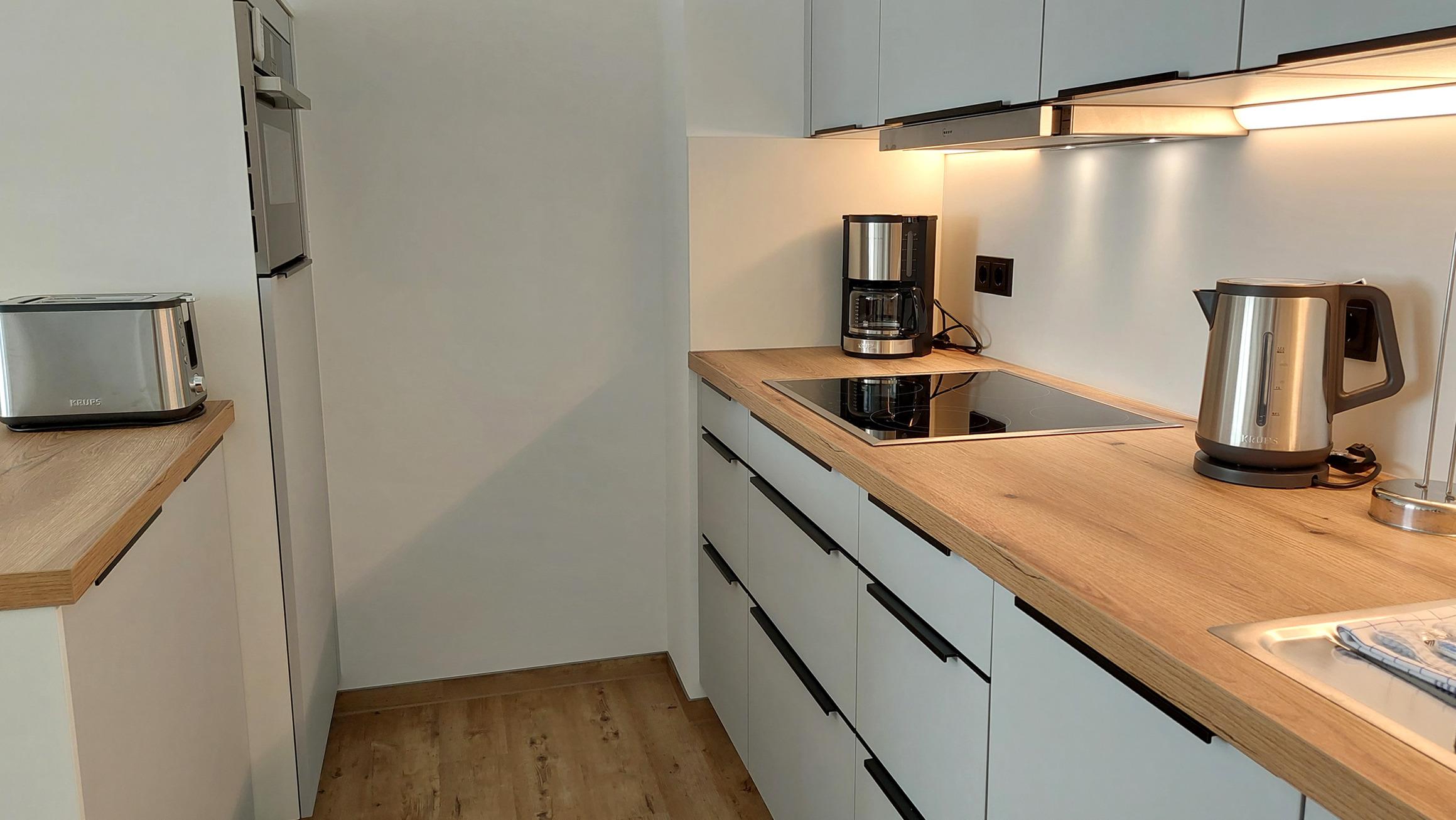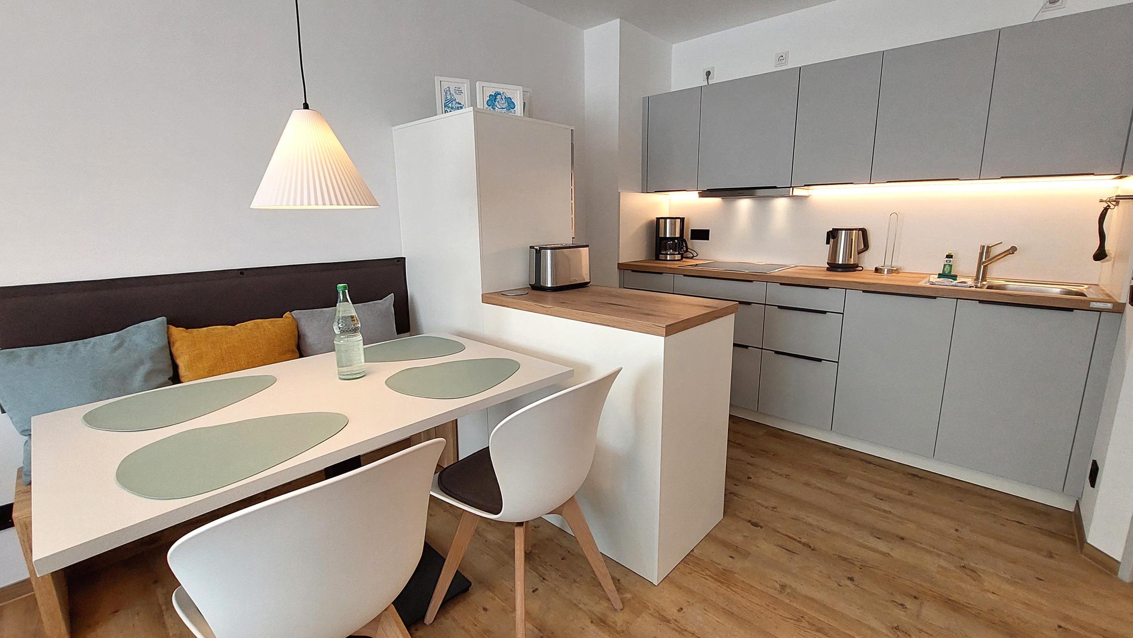Es gibt einen Essbereich für 4 Personen sowie eine moderne Küchenzeile mit allen Möglichkeiten sich im Urlaub selbst zu verpflegen.